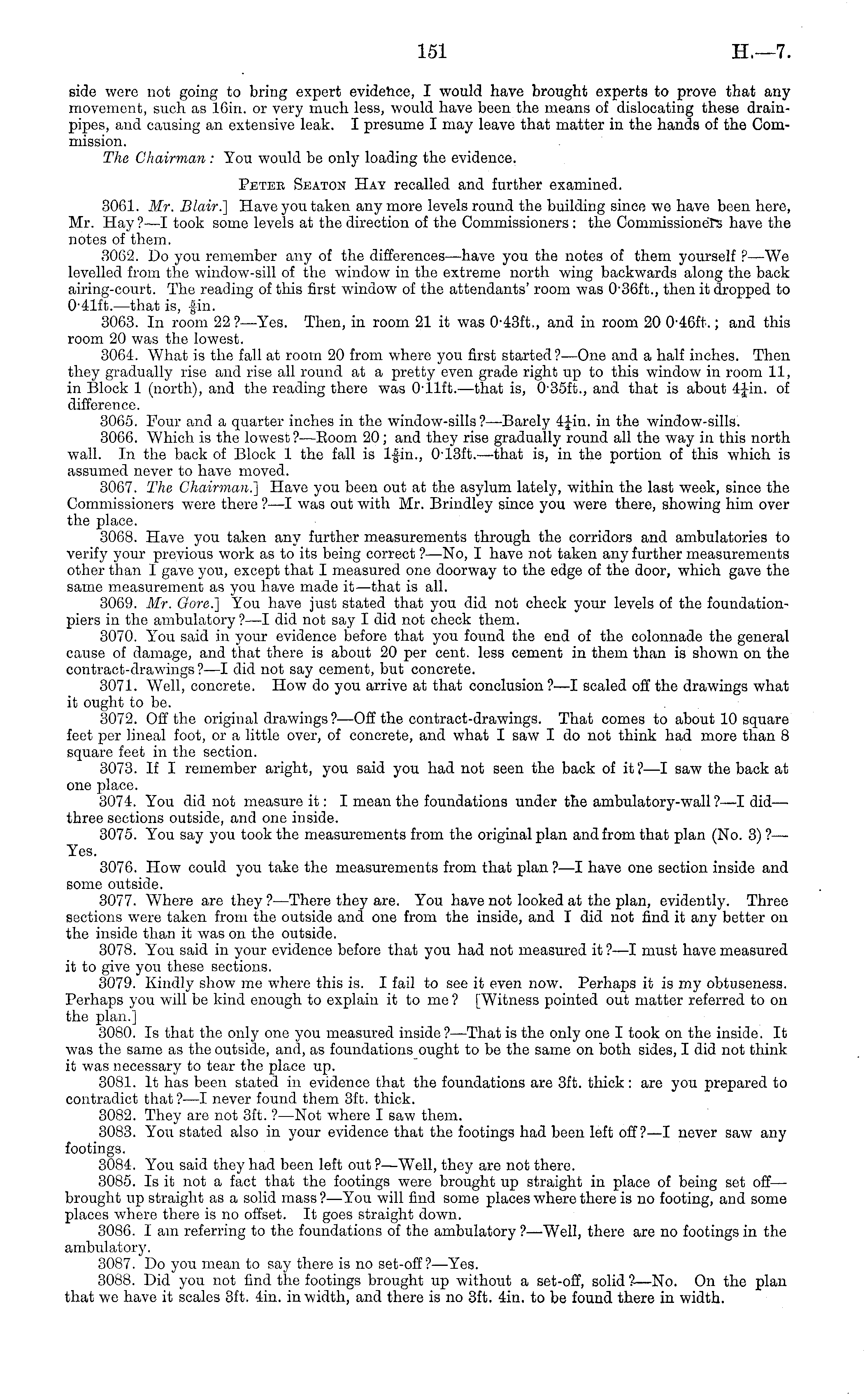 side were not going to bring expert evidence, I would have brought experts to prove that any movement, such as ICin. or very much less, would have been the means of dislocating these drainpipes, and causing an extensive leak. I presume I may leave that matter in the hands of the Commission. The Chairman : You would be only loading the evidence. Peter Seaton Hay recalled and further examined. 3061. Mr. Blair.] Have you taken anymore levels round the building since we have been here, Mr. Hay ?—I took some levels at the direction of the Commissioners : the Commissioners have the notes of them. 3062. Do you remember any of the differences —have you the notes of them yourself ? —We levelled from the window-sill of the window in the extreme north wing backwards along the back airing-court. The reading of this first window of the attendants' room was 0-36 ft., then it dropped to 0-41 ft.—that is, fin. 3063. In room 22 ?—Yes. Then, in room 21 it was o'43ft., and in room 20 046 ft.; and this room 20 was the lowest. 3064. What is the fall at room 20 from where you first started?— One and a half inches. Then they gradually rise and rise all round at a pretty even grade right up to this window in room 11, in Block 1 (north), and the reading there was O-llft.—that is, o'3sft., and that is about 4|-in. of difference. 3065. Four and a quarter inches in the window-sills?— Barely 4Jin. in the window-sills. 3066. Which is the lowest?— Room 20; and they rise gradually round all the way in this north wall. In the back of Block 1 the fall is lfin., o'l3ft. —that is, in the portion of this which is assumed never to have moved. 3067. The Chairman.] Have you been out at the asylum lately, within the last week, since the Commissioners were there ?—I was out with Mr. Brindley since you were there, showing him over the place. 3068. Have you taken any further measurements through the corridors and ambulatories to verify your previous work as to its being correct ?—No, I have not taken any further measurements other than I gave you, except that I measured one doorway to the edge of the door, which gave the same measurement as you have made it—that is all. 3069. Mr. Gore.] You have just stated that you did not check your levels of the foundationpiers in the ambulatory ?—I did not say I did not check them. 3070. You said in your evidence before that you found the end of the colonnade the general cause of damage, and that there is about 20 per cent, less cement in them than is shown on the contract-drawings? —I did not say cement, but concrete. 3071. Well, concrete. How do you arrive at that conclusion ?—I scaled off the drawings what it ought to be. 3072. Off the original drawings?— Off the contract-drawings. That comes to about 10 square feet per lineal foot, or a little over, of concrete, and what I saw I do not think had more than 8 square feet in the section. 3073. If I remember aright, you said you had not seen the back of it ?—I saw the back at one place. 3074. You did not measure it: I mean the foundations under the ambulatory-wall ?—I did—■ three sections outside, and one inside. 3075. You say you took the measurements from the original plan and from that plan (No. 3) ?— Yes. 3076. How could you take the measurements from that plan ? —I have one section inside and some outside. 3077. Where are they ? —There they are. You have not looked at the plan, evidently. Three sections were taken from the outside and one from the inside, and I did not find it any better on the inside than it was on the outside. 3078. You said in your evidence before that you had not measured it ?—I must have measured it to give you these sections. 3079. Kindly show me where this is. I fail to see it even now. Perhaps it is my obtuseness. Perhaps you will be kind enough to explain it to me? [Witness pointed out matter referred to on the plan.] 3080. Is that the only one you measured inside?— That is the only one I took on the inside. It was the same as the outside, and, as foundations ought to be the same on both sides, I did not think it was necessary to tear the place up. 3081. It has been stated in evidence that the foundations are 3ft. thick : are you prepared to contradict that ? —I never found them 3ft. thick. 3082. They are not 3ft. ?—Not where I saw them. 3083. You stated also in your evidence that the footings had been left off?—l never saw any footings. 3084. You said they had been left out ?—Well, they are not there. 3085. Is it not a fact that the footings were brought up straight in place of being set off— brought up straight as a solid mass?— You will find some places where there is no footing, and some places where there is no offset. It goes straight down. 3086. I am referring to the foundations of the ambulatory ?—Well, there are no footings in the ambulatory. 3087. Do you mean to say there is no set-off?— Yes. 3088. Did you not find the footings brought up without a set-off, solid ?—No. On the plan that we have it scales 3ft. 4in. in width, and there is no 3ft. 4in. to be found there in width.