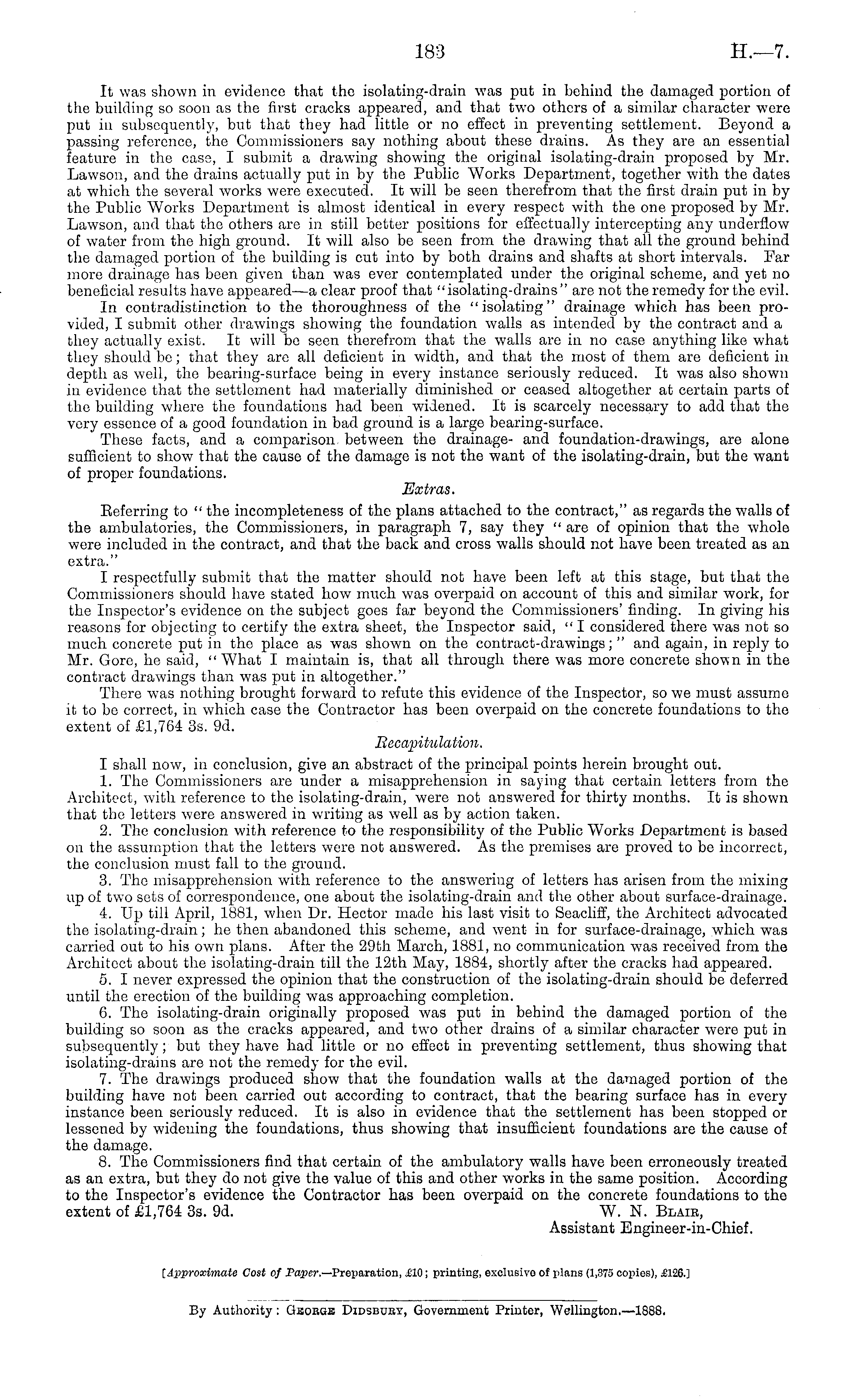 It was shown in evidence that the isolating-drain was put in behind the damaged portion of the building so soon as the first cracks appeared, and that two others of a similar character were put iv subsequently, but that they had little or no effect in preventing settlement. Beyond a passing reference, the Commissioners say nothing about these drains. As they are an essential feature in the case, I submit a drawing showing the original isolating-drain proposed by Mr. Lawson, and the drains actually put in by the Public Works Department, together with the dates at which the several works were executed. It will be seen therefrom that the first drain put in by the Public Works Department is almost identical in every respect with the one proposed by Mr. Lawson, and that the others are in still better positions for effectually intercepting any underflow of water from the high ground. It will also be seen from the drawing that all the ground behind the damaged portion of the building is cut into by both drains and shafts at short intervals. Far more drainage has been given than was ever contemplated under the original scheme, and yet no beneficial results have appeared —a clear proof that "isolating-drains" are not the remedy for the evil. In contradistinction to the thoroughness of the "isolating" drainage which has been provided, I submit other drawings showing the foundation walls as intended by the contract and a they actually exist. It will be seen therefrom that the walls are in no case anything like what they should be; that they are all deficient in width, and that the most of them are deficient in depth as well, the bearing-surface being in every instance seriously reduced. It was also shown in evidence that the settlement had materially diminished or ceased altogether at certain parts of the building where the foundations had been widened. It is scarcely necessary to add that the very essence of a good foundation in bad ground is a large bearing-surface. These facts, and a comparison between the drainage- and foundation-drawings, are alone sufficient to show that the cause of the damage is not the want of the isolating-drain, but the want of proper foundations. Extras. Referring to " the incompleteness of the plans attached to the contract," as regards the walls of the ambulatories, the Commissioners, in paragraph 7, say they " are of opinion that the whole were included in the contract, and that the back and cross walls should not have been treated as an extra." I respectfully submit that the matter should not have been left at this stage, but that the Commissioners should have stated how much was overpaid on account of this and similar work, for the Inspector's evidence on the subject goes far beyond the Commissioners' finding. In giving his reasons for objecting to certify the extra sheet, the Inspector said, " I considered there was not so much concrete put in the place as was shown on the contract-drawings; " and again, in reply to Mr. Gore, ho said, " What I maintain is, that all through there was more concrete shown in the contract drawings than was put in altogether." There was nothing brought forward to refute this evidence of the Inspector, so we must assume it to be correct, in which case the Contractor has been overpaid on the concrete foundations to the extent of £1,764 3s. 9d. Recapitulation. I shall now, in conclusion, give an abstract of the principal points herein brought out. 1. The Commissioners are under a misapprehension in saying that certain letters from the Architect, with reference to the isolating-drain, were not answered for thirty months. It is shown that the letters were answered in writing as well as by action taken. 2. The conclusion with reference to the responsibility of the Public Works Department is based on the assumption that the letters were not answered. As the premises are proved to be incorrect, the conclusion must fall to the ground. 3. The misapprehension with reference to the answering of letters has arisen from the mixing up of two sets of correspondence, one about the isolating-drain and the other about surface-drainage. 4. Up till April, 1881, when Dr. Hector made his last visit to Soacliff, the Architect advocated the isolating-drain; he then abandoned this scheme, and went in for surface-drainage, which was carried out to his own plans. After the 29th March, 1881, no communication was received from the Architect about the isolating-drain till the 12th May, 1884, shortly after the cracks had appeared. 5. I never expressed the opinion that the construction of the isolating-drain should be deferred until the erection of the building was approaching completion. 6. The isolating-drain originally proposed was put in behind the damaged portion of the building so soon as the cracks appeared, and two other drains of a similar character were put in subsequently; but they have had little or no effect in preventing settlement, thus showing that isolating-drains are not the remedy for the evil. 7. The drawings produced show that the foundation walls at the damaged portion of the building have not been carried out according to contract, that the bearing surface has in every instance been seriously reduced. It is also in evidence that the settlement has been stopped or lessened by widening the foundations, thus showing that insufficient foundations are the cause of the damage. 8. The Commissioners find that certain of the ambulatory walls have been erroneously treated as an extra, but they do not give the value of this and other works in the same position. According to the Inspector's evidence the Contractor has been overpaid on the concrete foundations to the extent of £1,764 3s. 9d. W. N. Blair, Assistant Engineer-in-Chief.