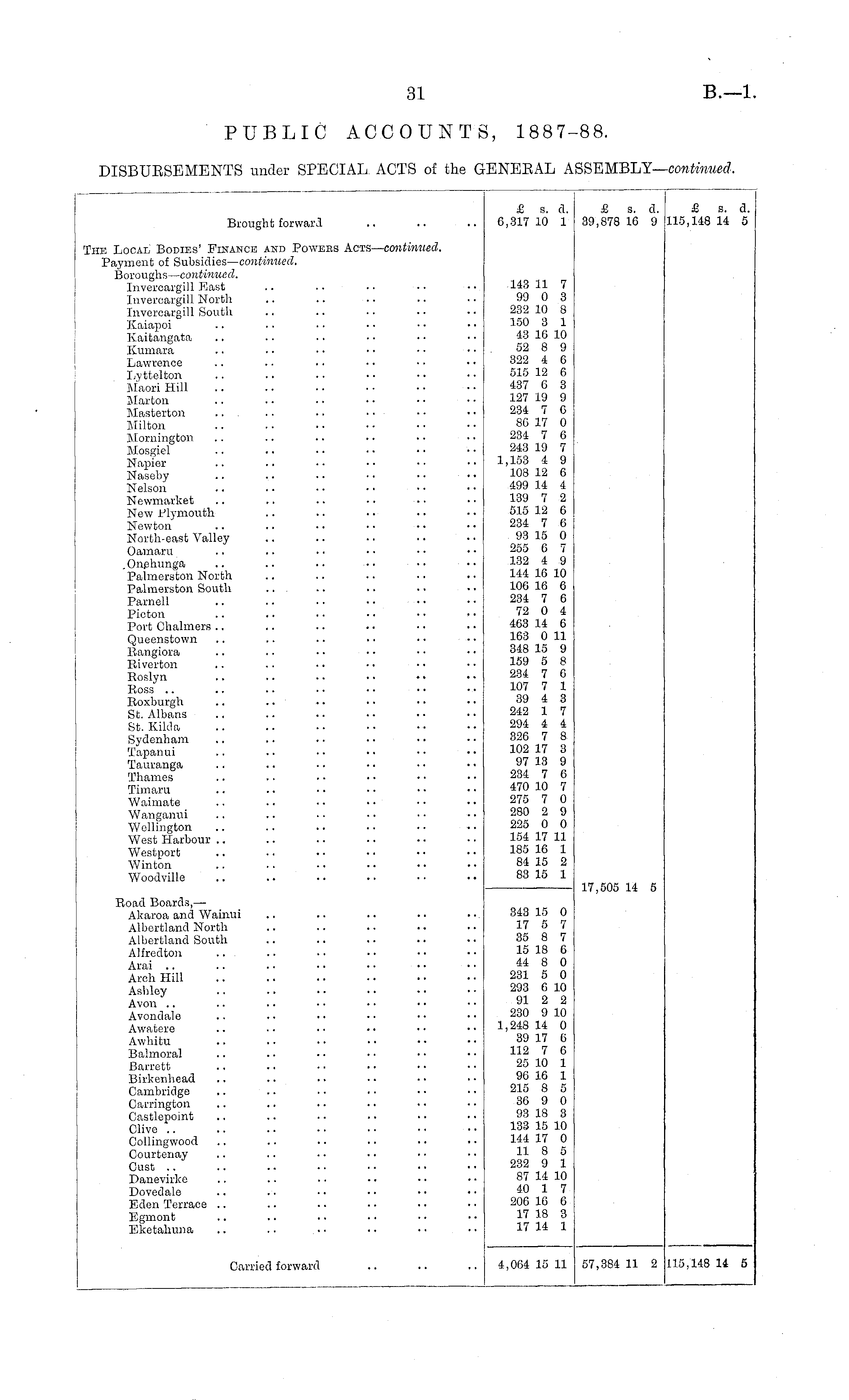 & s. d. 6,317 10 1 £ s. d. 39,878 1G 9 £ s. a. 115,148 14 5 Brought forward 'he Local Bodies' Finance and Powebs Acts — continued. Payment of Subsidies — continued. Boroughs— continued. Inveroargill East Invercargill North Inveroargill South Kaiapoi Kaitangata Kumara Lawrence Lyttelton Maori Hill Marton Masterton Milton Mornington Mosgiel Napier Naseby Nelson Newmarket New Plymouth Newton North-east Valley Oamaru .Onehunga Palmerston North Palmerston South Parnell Pioton Port Chalmers Queenstown Rangiora Riverton Eoslyn Ross Roxburgh St. Albans St. Kilda Sydenham Tapanui Tauranga Thames Timaru Waimate Wanganui Wellington West Harbour Westport Winton Woodville 143 11 7 99 0 3 232 10 8 150 3 1 43 16 10 52 8 9 322 4 6 515 12 6 437 6 3 127 19 9 234 7 6 86 17 0 234 7 6 243 19 7 1,153 4 9 108 12 6 499 14 4 139 7 2 515 12 6 234 7 6 93 15 0 255 6 7 132 4 9 144 16 10 106 16 6 234 7 6 72 0 4 463 14 6 163 0 11 348 15 9 159 5 8 234 7 6 107 7 1 39 4 3 242 1 7 294 4 4 326 7 8 102 17 3 97 13 9 234 7 6 470 10 7 275 7 0 280 2 9 225 0 0 154 17 11 185 16 1 84 15 2 83 15 1 17,505 14 5 Road Boards, — Akaroa and Wainui Albortland North Albertland South Alfredton ... Arai Arch Hill Ashley Avon Avondale Awatere Awhitu Balmoral Barrett Birkenhead Cambridge CaL-rington Castlepoint Clive .. Collingwood Courtenay Cust .. Danevirke Dovedale Eden Terrace Egmont Eketahuna 343 15 0 17 5 7 35 8 7 15 18 6 44 8 0 231 5 0 293 6 10 91 2 2 230 9 10 1,248 14 0 39 17 6 112 7 6 25 10 1 90 16 1 215 8 5 36 9 0 93 18 3 133 15 10 144 17 0 11 8 5 232 9 1 87 14 10 40 1 7 206 16 6 17 18 3 17 14 1 Carried forward FVl 4,064 15 11 57,384 11 2 115,148 14 5