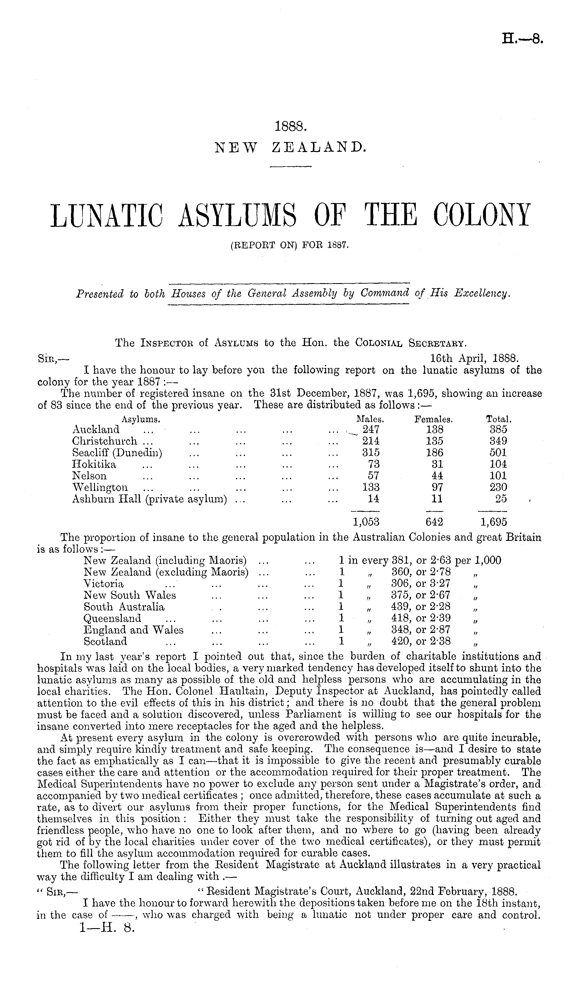 The Inspector of Asylums to the Hon. the Colonial Secretary. Sib,— 16th April, 1888. I have the honour to lay before you the following report on the lunatic asylums of the colony for the year 1887 : —■ The number of registered insane on the 31st December, 1887, was 1,695, showing an increase of 83 since the end of the previous year. These are distributed as follows : — Asylums. Males. Pemalea. Total. Auckland ... ... ... ... ... 247 138 385 Christchurch ... ... ... ... ... 214 135 349 Seacliff (Dunedin) ... ... ... ... 315 186 501 Hokitika ... ... ... ... ... 73 31 104 Nelson ... ... ... ... ... 57 44 101 Wellington ... ... ... ... ... 133 97 230 Ashburn Hall (private asylum) ... ... ... 14 11 25 . 1,053 642 1,695 The proportion of insane to the general population in the Australian Colonies and great Britain is as follows :— New Zealand (including Maoris) ... ... lin every 381, or 2-63 per 1,000 New Zealand (excluding Maoris) ... ... 1 „ 360, or 2-78 „ Victoria ... ... ... ... 1 „ 306, or 3-27 New South Wales ... ... ... 1 „ 375, or 2-67 South Australia . ... ... 1 „ 439, or 2-28 Queensland ... ... ... ... 1 „ 418, or 2-39 England and Wales ... ... ... 1 „ 348, or 2-87 Scotland ... ... ... ... 1 „ 420, or 2-38 In my last year's report I pointed out that, since the burden of charitable institutions and hospitals was laid on the local bodies, a very marked tendency has developed itself to shunt into the lunatic asylums as many as possible of the old and helpless persons who are accumulating in the local charities. The Hon. Colonel Haultain, Deputy Inspector at Auckland, has pointedly called attention to the evil effects of this in his district; and there is no doubt that the general problem must be faced and a solution discovered, unless Parliament is willing to see our hospitals for the insane converted into mere receptacles for the aged and the helpless. At present every asylum in the colony is overcrowded with persons who are quite incurable, and simply require kindly treatment and safe keeping. The consequence is—and I desire to state the fact as emphatically as I can—that it is impossible to give the recent and presumably curable cases either the care and attention or the accommodation required for their proper treatment. The Medical Superintendents have no power to exclude any person sent under a Magistrate's order, and accompanied by two medical certificates ; once admitted, therefore, these cases accumulate at such a rate, as to divert our asylums from their proper functions, for the Medical Superintendents find themselves in this position : Either they must take the responsibility of turning out aged and friendless people, who have no one to look after them, and no where to go (having been already got rid of by the local charities under cover of the two medical certificates), or they must permit them to fill the asylum accommodation required for curable cases. The following letter from the Eesident Magistrate at Auckland illustrates in a very practical way the difficulty I am dealing with . — " Sir,— "Eesident Magistrate's Court, Auckland, 22nd February, 1888. I have the honour to forward herewith the depositions taken before me on the 18th instant, in the case of , who was charged with being a lunatic not under proper care and control. I—H. 8.