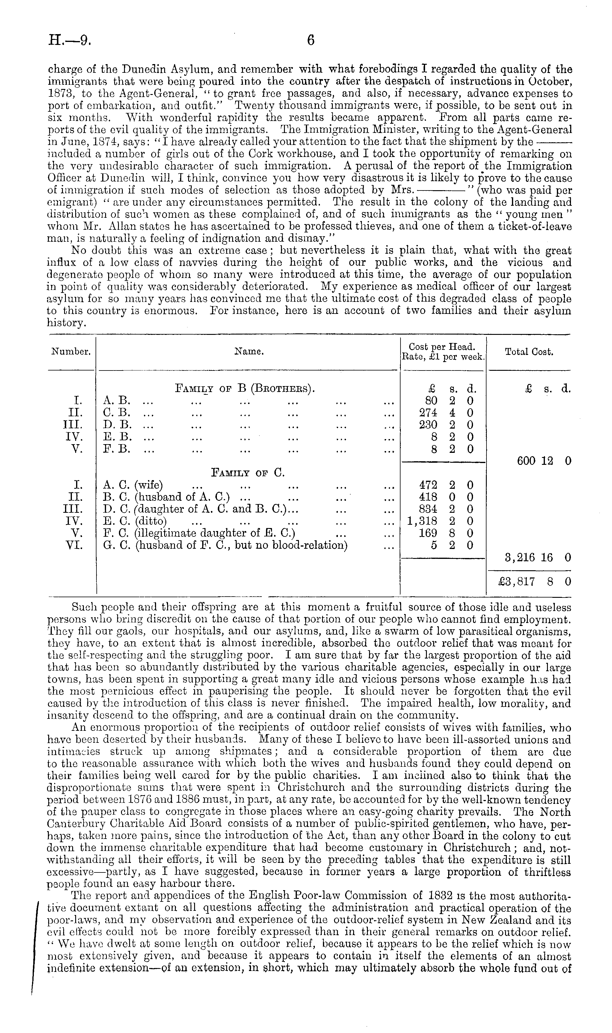 charge of the Dunedin Asylum, and remember with what forebodings I regarded the quality of the immigrants that were being poured into the country after the despatch of instructions in October, 1873, to the Agent-General, " to grant free passages, and also, if necessary, advance expenses to port of embarkation, and outfit." Twenty thousand immigrants were, if possible, to be sent out in six months. With wonderful rapidity the results became apparent. From all parts came reports of the evil quality of the immigrants. The Immigration Minister, writing to the Agent-General in June, 1874, says: " I have already called your attention to the fact that the shipment by the included a number of girls out of the Cork workhouse, and I took the opportunity of remarking on the very undesirable character of such immigration. A perusal of the report of the Immigration Officer at Dunedin will, I think, convince you how very disastrous it is likely to prove to the cause of immigration if such modes of selection as those adopted by Mrs. " (who was paid per emigrant) " are under any circumstances permitted. The result in the colony of the landing and distribution of such women as these complained of, and of such immigrants as the " young men " whom Mr. Allan states he has ascertained to be professed thieves, and one of them a ticket-of-leave man, is naturally a feeling of indignation and dismay." No doubt this was an extreme ease ; but nevertheless it is plain that, what with the great influx of a low class of navvies during the height of our public works, and the vicious and degenerate people of whom so many were introduced at this time, the average of our population in point of quality was considerably deteriorated. My experience as medical officer of our largest asylum for so many years has convinced me that the ultimate cost of this degraded class of people to this country is enormous. For instance, here is an account of two families and their asylum history.