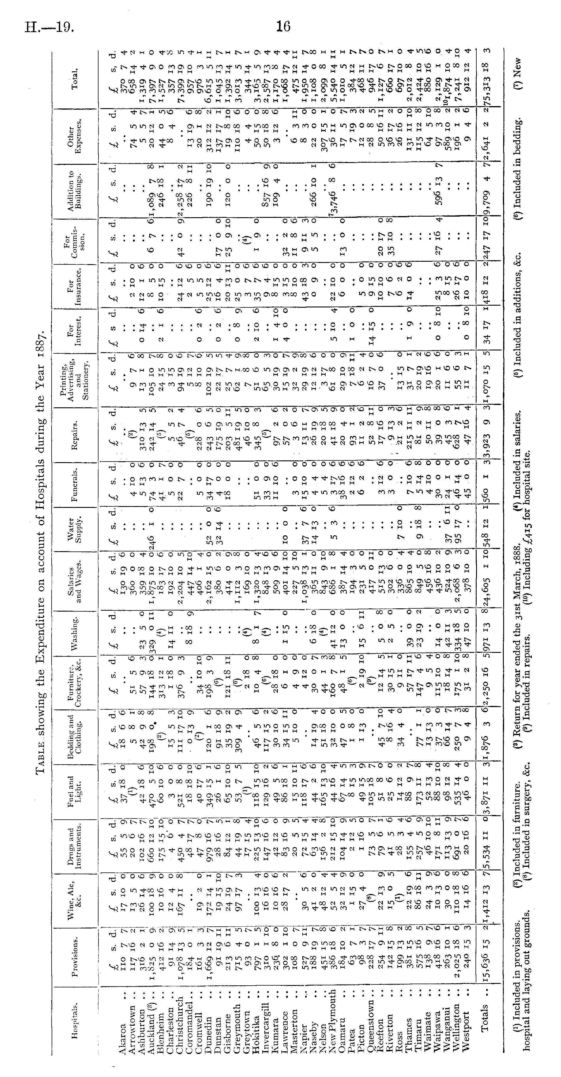 Hospitals. Provisions. Wine, Ale, &c. Drugs and Instruments. Fuel and Light. Bedding and Clothing. Furniture, Crockery, &c. Washing. Salaries and Wages. Water Supply. Funerals. Repairs. Printing, Advertising, and Stationery. For Interest. For Insurance. For Commission. Addition to Buildings. Other Expenses. Total. Akaroa Arrowtown .. Ashburton .. Auckland (3) .. Blenheim Charleston .. Christchurch Coromandel .. Cromwell Dunedin Dunstan Gisborne Grej'mouth .. Greytown Hokitika Invercargill .. Kumara Lawrence Masterton .. Napier Naseby Nelson New Plymouth Oamaru Patea Picton Queenstown .. Reefton Riverton Ross Thames Timaru Waimate Waipawa Wanganui "Wellington .. AVestport no 7 7 117 16 2 316 2 1 1,825 o 9 412 16 2 91 14 9 1,078 13 5 184 o 1 161 3 3^ 1,669 12 7; 91 19 11 213 6 11 7!5 4 5 93 o 7 797 I 5, 310 1 10! 236 8 o| 302 1 10! 108 o 7 1 527 9 II 188 19 7 45T 15 8: 386 18 6 184 10 2 63 7 1 98 3 7 228 17 7 254 9 11 142 15 8 199 13 2 3S1 15 8 575 16 5 138 9 7 418 16 6 263 10 1 2,025 18 6 24° !5 3 £ s. d. 17 10 o 13 5 o 26 14 C 100 18 9 10 16 o 12 4 o 167 11 8 19 2 oj 172 14 1 19 15 10 24 19 7 97 T7 3 100 13 4 16 16 o 10 16 6 2S 17 2 55 5 9 20 6 7j 102 16 71 660 12 10 175 15 10 4 6' oj 45O 4 7 45 17 7 47 8 o; 979 16 7] 28 16 5; 84 12 ij 44 19 8 J7 15 4 225 13 10 147 16 6, 42 12 o 83 16 9 20 5 5 72 15 4! 63 14 4i 156 2 8 212 15 10 104 14 9 2 12 5 1 16 o 73 5 7 79 6 1 41 5 6 28 3 4 155 4 6 257 5 9 46 10 10 171 8 11 "3 13 9 6gi o 7 20 16 6 37 18 o 42 18 6 470 5 10 60 10 6' 300! 521 8 oj 18 18 10I 40 17 6 349 15 1 26 1 6 65 10 10 53 7 5 118 15 10 129 16 2 49 5 C 86 18 1 15 10 11 118 17 6 44 2 6 165 13 10 44 16 4 C7 14 5 8 15 3 49 15 9 105 18 7 51 8 o 25 6 o 14 12 2 88 9 7 173 11 8 52 13 4 88 10 10 98 12 8 535 14 4 46 o o £ 8. d 18 6 61 5 8 1 42 9 8 19S o. 8 15 5 3 in 1710 o 13 9 120 1 6 91 18 9 35 19 2 3°9 4 9 46 5 6 117 15 2 30 10 6 34 15 11 5 10 o £ *• d. ■• 51 5 6 57 9 3 144 18 oj; 313 12 1 1 18 o 376 9 3 34 10 10 198 3 9 121 18 11 2 18 o 10 4 8 (c) 28 18 o 610 490 4 12 o 30 o 7 44 1 3 160 7 8 48 1 5 (G) 2 19 10 12 14 5 30 15 1 9 11 o 57 17 " 147 4 6 9 5 4 115 10 o 18 14 8 175 1 10 31 2 81 £ * d. 23 5 o 329 on (4) 14 11 o 8 18 9 " (4) 8 1 7 (4) 1 15 o £ »■ d. 130 19 6 360 o o 359 18 4 1,875 Io o: 183 17 6 192 10 o 2,204 10 5 447 14 10 406 1 4 2,162 15 o 380 6 2 414 o 9 1,112 3 8 169 10 o 1,320 13 4 848 13 6 509 9 6 401 14 10 227 5 10 1,038 13 1 365 11 o 843 9 10 686 1 8 387 14 4 194 3 ° 231 5 o 417 o 11 515 13 o 302 6 o 336 o 4 865 10 4 849 5 o 456 16 8 436 10 2 524 10 9 2,068 6 3 378 10 oj £ *• d. 246 1 o •• I 52 O O| 32 14 6 __ •• 10 o o £ s. d. 4 10 o 5 13 6 74 3 o 41 1 7 500 22 7 o •• 500 34 17 ° 400 18 o o 51 o o 33 9 o 11 10 6 £ s. d. 0 310 13 5 242 14 5 (5) 552 46 7 4 (5) 228 o 6 243 6 5 175 19 o 203 5 11 481 19 5 46 10 o 345 S 3 (5) 97 2 6 57 o 2 360 13 11 7 26 19 9 20 18 5 41 18 9 20 4 o 93 1 2 n 2 6 52 8 n 17 16 o 9 13 3 21 2 6 215 11 11 81 2 9 50 11 8 39 o 8 45 3 6 628 7 1 47 16 4 £ *• d. 976 13 1 8 105 10 7 24 15 S 3 15 ° 94 19 6 5 12 7 8 10 6 102 19 5 22 17 5 25 7 4 62 1 9 788 51 6 o 65 5 3 30 19 o 15 19 7 32 2 9 29 19 8 12 12 6 3 17 o 61 8 o 29 10 9 7 18 11 624 16 7 o 37 o 6 £ s d. o 14 6 2 1 6 •• o 2 6j I I o 2 6J o S 9 2 10 6 1 4 10 400 £ s- d- •• 2 10 o 12 I 6 850 10 15 o 24 12 6 256 550 25 12 6 16 4 6 20 13 11 25 o o 3 7 6 35 7 6 946 8 15 o 3 15 o 8 10 o 43 18 3 090 £ s- d6 7 6: 42 o 9: - ■■ 17 o o 25 9 10 (4) 190 32 2 o n 8 6 9 11 3 5 5O £ s. d. 1,089 7 8 246 18 1 2,258 17 2 226 8 11 •• 190 19 10 •■ 120 o o 857 16 9 109 4 o •• £ s. d. 74 5 4 5 5 7 20 12 1 44 o 5 846 •• 13 19 6 20 1 8| 312 12 2 137 17 1 19 8 10 no 18 6 4 4 °i 50 15 o 50 18 8 3 12 6 6 3 11 830 22 o o £ *. d. 37° 7 4 658 14 2 I,3i9 4 I 7,397 9 o 1,527 o 4 357 13 8 7,399 19 5 957 i° 4 976 3 J 6,615 5 11 1,045 13 7 1,392 14 1 3,oi3 5 7 344 14 1 3,i65 5 9 2,587 13 4 1,170 8 4 1,068 17 4 475 12 11 1,950 14 7 1,108 o 8 2,099 8 1 5,540 14 11 1,010 5 1 384 12 7 468 11 7 946 17 o 1,127 C 7 660 17 1 697 10 o 2,012 8 4 2,424 10 5 8S0 16 6 2,129 I ° i°i,S 74 10 4 7,241 8 10 912 12 4 I 30 5 6 41 2 o 48 12 4 52 5 4 32 12 9 1 15 o 27 4 o 22 13 9 J5 o 5 22 19 6 86 18 II •• 1 6 18 o| (4) 41 12 o 13 o o 37 7 6 14 13 ° 300 15 10 o 440 5 4O 3 17 C 38 16 6 2 12 6 626 - - - 2G6 10 1 14 19 4 51 18 o 32 10 o 47 o 5 180 1 13 o 5 '3 6 - 5 10 4 •• 22 10 o 600 13 o o '3,746" 8 6 307 15 1 36 11 o 17 5 7 7 19 3 12 o 2 28 8 5 50 16 II 36 17 2 26 16 o 131 11 10 115 12 8 64 5 10 97 3 8 589 10 2 196 1 2 946 100 - 15 6 11 14 15 o 500 9 15 o 10 10 o 760 626 14 o 6 - 45 7 10 8 16 4 34 4 o 508 250 3 12 6 300 20 17 o 35 10 8 ■• •■ 1 •• I 7 10 o •• 13 15 o 31 7 1 20 19 2 19 16 6 20 1 6 11 6 o 55 6 3 11 7 1 24 3 9 10 13 6 30 o o no 18 8 14 16 6 •• 77 1 1 13 13 o 37 3 o 66 14 7 250 7 3 9 4 8 39 o o 1 23 19 2 ) 14 O O i 42 11 3 '334 18 5 > 47 10 o 1 9 18 8 I 37 6 11 [ 95 17 o 7 10 6 5 14 8 4 10 o 30 o o 24 1 o 46 14 o 45 o o 1 g o - o 8 10 - 25 3 C 8 15 o 26 17 6 10 o o 27 16 4 596 13 7 " o 8 10 " - >: - -• Totals .. 15,636 15 2 '3,871 11 3 418 12 2 247 17 10 1,412 13 7 5,534 n o 1,876 3 6 2,250 16 5 971 13 8 24,605 I 10 J548 12 1 560 1 3! :3,923 9 3 1,070 15 5 34 17 I 9,709 4 7 2,641 2 2 75,313 lS (!) Included in provisions, hospital and laying out grounds. (2) Included in furniture. (R) Included in surgery, &c. (2) Return for year ended the 31st March, 1888. (3) Included in repairs. (10) Including j. (4) Included in salaries. '415 for hospital site. (6) Included in additions, &c. (6) Included in bedding. (■) New