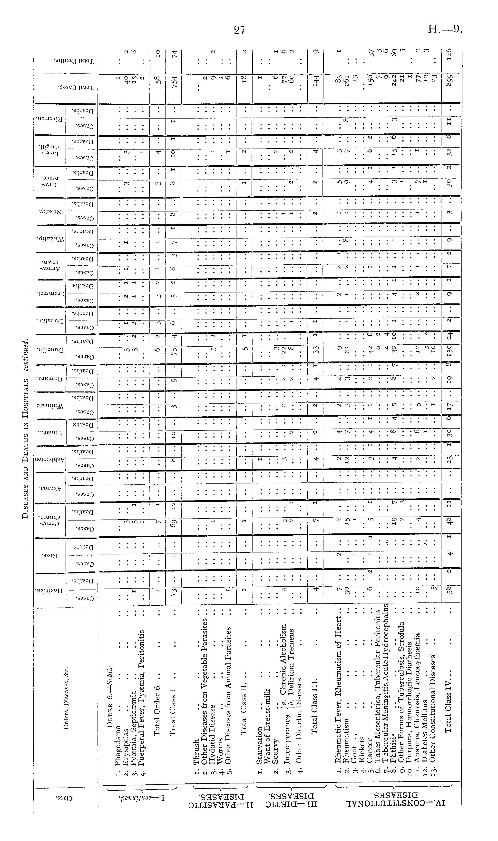 rt C o O-5 O < o rt 'rt w rt 0 >- o 7L •S3 5 2 rt r- 1 rt o u Orders, Diseases, &c. 6 a — I I en rt 5 B 0 IQ rt rt i rt 1 rt rt I I O - I I Order 6.— Septic. a 1. Phagedaena 2. Erysipelas 3. Pyaemia, Septicaemia 4. Puerperal Fever, Pyaemia, Peritonitis •• ■• 1 ■ ■ " •• 3 3 1 ■■ ••! •• • • " - - •• ■• i "I •'I - - ■ •• 3 3 1 ■• : • ! 2 •■ 1 2 •I • - 1 •• 1 1 •• 1 " - •• •• •• - •■ - •• 3 •• • - I •• 3 ■1 • • •• •■ • •• •• •• 1 140 2 S 2 •• •■ • • • •■I •• ■• •• •I •I • • • • • 1 •■ •• — H I H H ;h H H — Total Order 6 .. 1 .. 7 1 .. .. .. •• • !■ I 2 3 - 2 1 •• •• 3 • A .. ■ •• 5S 10 •• I •• •• Total Class I. .. r ! \—\ - __ -- — H hH M - 8 M " - 8 — — » > I 1 I I 13 I -. 0<) H • 8 10 3 • 1 • 3 < ■ 1 10 1 •• 754 I 74 I 75 ■• • •• — — — — — — P 1 l.o 1. Thrush 2. Other Diseases from Vegetable Parasites .. 3. Hydatid Disease 4. Worms 5. Other Diseases from Animal Parasites •• I .. •• I .. - • "■ 1 ■ ■■ - • • • • ■• - •■ • - ■■ ■■ ■• i I ■■• 1 ■• • "I •• •• - - .. • 1 •• 1 •1 •• • * 9 1 6 •• 2 •• • - - - - ■ - - - - - - 1 • •■ I • ■ 1 - • •• •■ •• • - 1 •• Total Class II. .. — — — — 1 ~ H H 1 H H H — h^i 1 • ■ ■ * - ■ - - .. • 5 .. ■• • 2 .. "■ i •• ■! ■■ •• 1. Starvation Want of Breast -milk 2. Scurvy 3. Intemperance |j ggjfcAgtaJ- .. 4. Other Dietetic Diseases M —\ H H I H H - I H • - • ' • • - - • 1 •■ •■ ■■ •• •• ■■ •■• '■I " •• •• •• •■ 1— t - - • " • • •• ! H - - ■ ■ •■ •■ ■ •• - •• • ■ • 2 • 2 2 1 3 8 • - I- ■ • 1 1 ■■ - 2 - •• • 6 77 60 I 4 - 15 2 •• I3 2 • ■ • 1 ■ •• ■ ■■ •• ■ •• - " I - - • 1 ■ • • •■• 2 2 • •• •• 2 •■ •• -■ i.. •■ ■ • ., ■■ ■■ • • • •■ • • - • ... - •• Total Class III. ! I 1 H H 1 — 1 I i H - 1 - H — — H H 4 •■ - — J I 1 33 U-J I 1 ■• L_ • — _ 1 - — 2 — - — 2 - — Lj .. .. •• 144 'A O Peri l-H < o 1. Rheumatic Fever, Rheumatism of Heart.. 2. Rheumatism 3. Gout 4. Rickets 5. Cancer 6. Tabes Mesenterica, Tubercular Peritonitis 7. Tubercular Meningitis, Acute Hydrocephalus 8. Phthisis 9. Other Forms of Tuberculosis, Scrofula .. 10. Purpura, Haemorrhagic Diathesis 11. Anaemia, Chlorosis, Leucocythaemia 12. Diabetes Mellitus 13. Other Constitutional Diseases 7 30 6 - - ■•■• ■■ 2 - •• 2l Z \ I - - •■ i I 2 15 1 19 2 ■ A •• • •• - •■■ - - "I 2 12 3 •• I 4 7 4 *8 ■ • ' - 3 I 1 ■ • • - • " • 4 3| 2 - - 9 21 •• 4 2 6 4 3° • •! • 6 d •• 1 1 •I 2 1 •■I "■I • • ■ ■ • I 2 2 I 1 1 1 •! •• 1 - S1 1 •• ■ 5 • « ■ •• ■ • •• 1 1 3| 7| " 6 - 15 2 - • 8 •• I - •• I 1 • 83 261 13 150 7 242! 2I| 3' I " - - - 4 i 5 • 8 * 1 3 S( - - •■ •■ ■■ ■• ••! h • •• I •! - ■• ■ - - - ■■ - •• "\ • •• • • ■■ •• •• " •• 7 1 1 • A 10 • * •• ■ 2 ■i = ■ 12 - 2 " . ■■ ■ 1 • •• 77 12 23 •■ ! • .'. • • - 1 :! •■ • • A - •■ - " - • - " ■ •• 51 ■ • ■ • - 1 " 2 • • • • - • - • •• ■ Total Class IV... — I 48 I ! 1 i ! H " 1 — hH — H __ I 1 — 8 - 5S 4 11 23 3O U7 - 19 139! I 24 2 | 9 1 7 2 9 .. 3° 32 11 .. 899! i;(