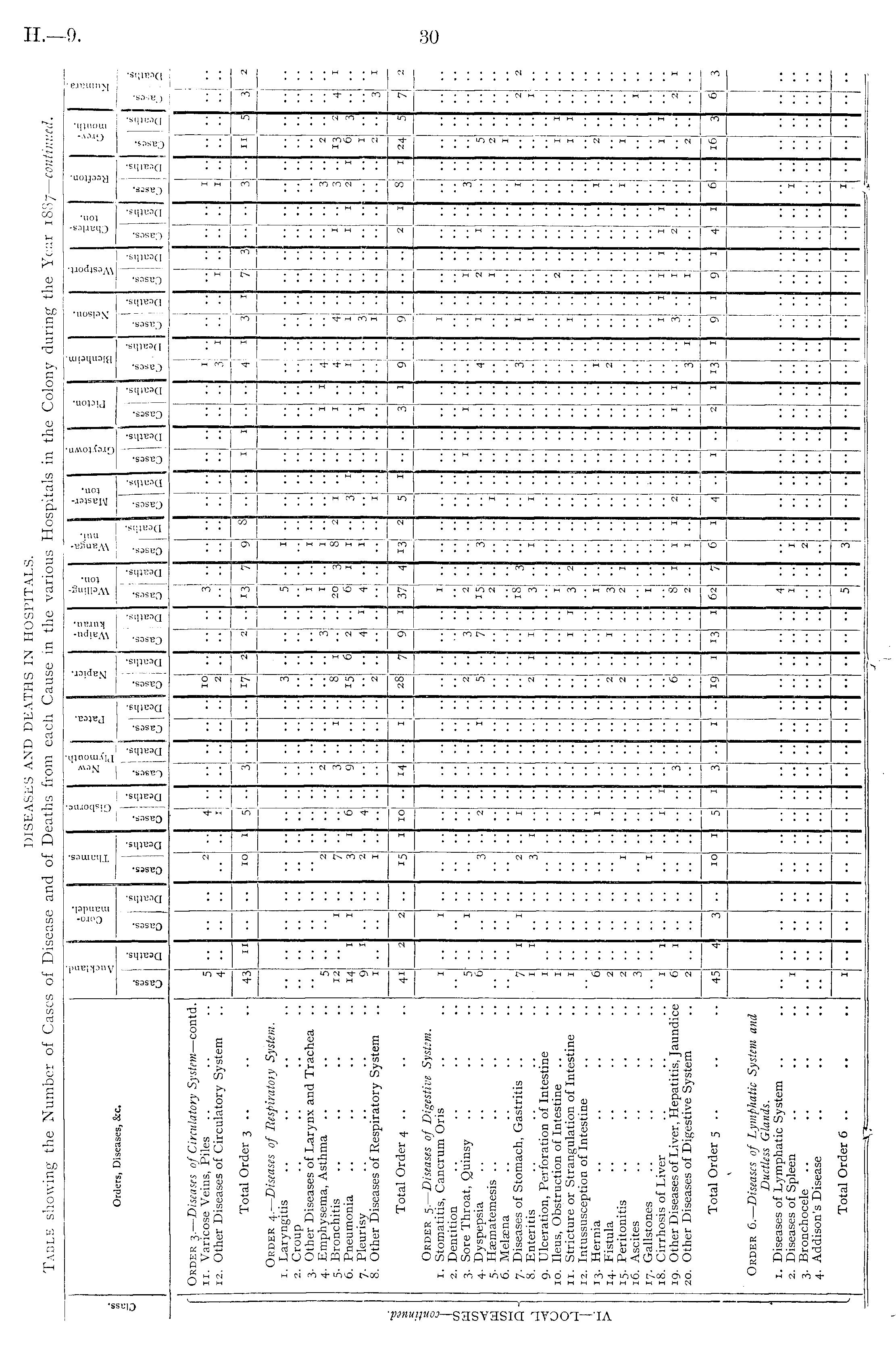 DISEASES AND DEATHS IN HOSPITALS. Table showing the Number of Cases of Disease and of Deaths from each Cause in the various Hospitals in the Colony during the Year 1887 — continued.