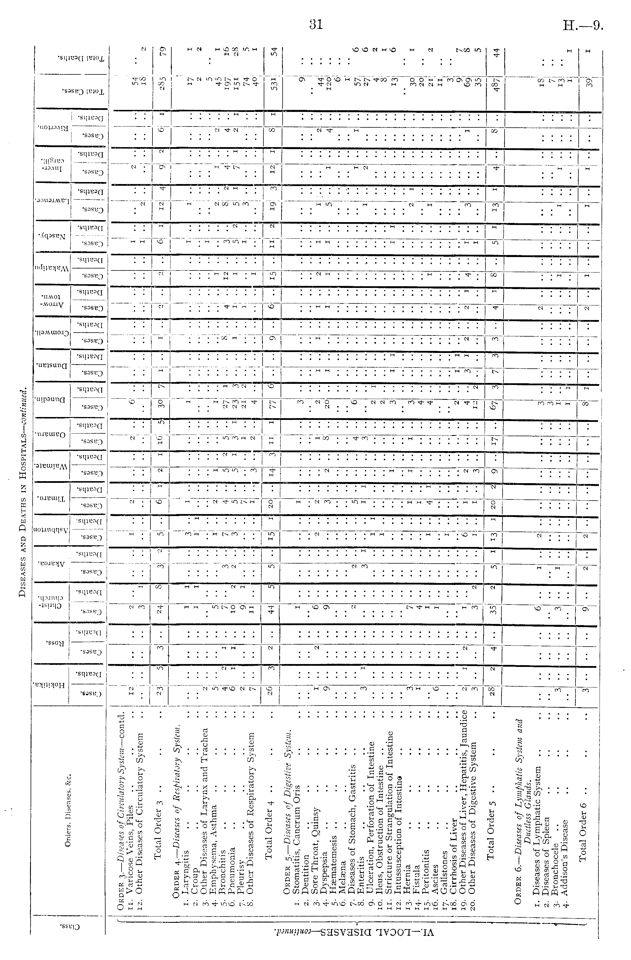 s 5 a 6 S-g M 1 i 1 5 a O a Q Q o U 2 £ o < U rt U 2 a rt m rt u a t» M 5 U 8 13 Orders, Diseases, &c. rt o U 3 c3 a 3 a I ui rt u a « rt U Q 5 D 1 rt 1 i> O rt ~ 1 - II Order 3.— Diseases of Circulatory System —coutd. 11. Varicose Veins, Piles 12. Other Diseases of Circulatory System 12 •M ■• •• - • 2 3 •• A •■ i ■• •■ •■ • ••!- 2 .. ■■ i "I • 2 |. i6| 5 i 1 ... • •■ 1 ■' ■•; •■ •• •• 1 1 • • I .. .. 2j. 2 •• •■' •• • iS 2 — M s — -\ —i— 3»1 H H • H —' Total Order 3 .. i 3 • 24 3! i A jj 2 A 2! r~\ 2 • 6 12 4 6 i 1 2S 5 79 - 1 1 •• 1 ■• 1 9| Order 4.— Diseases of Respiratory System. 1. Laryngitis 2. Croup 3. Other Diseases of Larynx and Trachea .. 4. Emphysema, Asthma 5. Bronchitis 6. Pneumonia 7. Pleurisy 8. Other Diseases of Respiratory System — h— — A ! — H — - — W ■I I ! 1 3il 1 1 .. 2 .. 7j •■ 20! .. I 2 . . .. 1 I •■ 117 1 21 2 " •• 1 ■• • • •■ ■■ ■\ "I 1 •• - •• •• - - • "I • .. ..! - • t •• •• •■ 1 < > 1 5 5 - 1 .. 27 1 23 3 21 2 • • ii • • .. .. 5 •• 45. 1 197 16 151 28 74 5 40 1 1 53i| 54 • ■• .. 5 7 10 9 11 • , 2 1 - • 1 •• .. 1 I 2 2 . . 8i 2 5 1 3 •• I 1 A •■ '! 1 1 i, ■• 2 1 . :: .. .. il .. •• • 4 1 • ■ 12 1 •• 3 5 1 1 4 7 4 2 1 2 I- • - 1 1 •• • ■■ 1 ■I •• ! 3 1 ■■ 1 - \ ■■ 20 •• i .. I • 1 ■ !•• • 1 • .1 I ••! 1 .. 1 ... Total Order 4 .. ! H H H H ;— 1 8 3 2 44 5 5 b 3j • 9 I 511 : 2 19 3 12 I 1 •• ! 1 — —' w < Order 5.— Diseases of Digestive System. 1. Stomatitis, Cancrum Oris 2. Dentition 3. Sore Throat, Quinsy 4. Dyspepsia 5. Haematemesis .. 6. Meleena 7. Diseases of Stomach, Gastritis 8. Enteritis 9. Ulceration, Perforation of Intestine 10. Ileus, Obstruction of Intestine 11. Stricture or Strangulation of Intestine 12. Intussusception of Intestina 13. Hernia 14. Fistula 15. Peritonitis 16. Ascites 17. Gallstones 18. Cirrhosis of Liver 19. Other Diseases of Liver, Hepatitis, Jaundice 20. Other Diseases of Digestive System •■ •■ I 1 9 •• 3 •• •• •• •• •• •• •• •• •• • " • 2 1 6 9 2 •• - • - - - - - - " 2 3 •1 • ..I • • ■ 1 • • • ■ ■ - 1 1 1 l A • 5 1 I I • - • • 2 "; I 'i - - 14 3 ■•! • .. I *' I •• 3 A 1 20 ■■• ••- 12 3 ! •1 1 1 1 •■ — 1 ■■ •• ■■ 1 1 •■ ..I i •• • •I 2 1 •1 > 1 • • ■■ •• 1 5 I! I I 1 1 - !— ■■ • 2 * • •■ 1 - - •■ • • 91 •• .. .. 441 •• 120I .. 6| .. 1! 57 6 27 6 4 2 81 1 13 6 - •• • •• " - " • .... ■ - 1 1 • 1 1 - •• • 3 1 •• 7 4 1 3 " • • •: ■ • I 1 • • I "I I • • i - •• • .. .. I. • •• ■■ - " - •• •• I H 3 4 4 • • •• • • • - 2 - •• ■ 30 1 20 21 2 I" - • ■■ •: •■ ■; A - • • • 1 ■ ■ - - •• • " 6 i ■■ • - • • 1 i - • • .. • • - - 1 •• • •• • • - • 1 •: ■• ■■ ■■ • • • •' • •■ • - •• " - - • ..... - I "" •• • J i 1 1 • • • •■ - ■• 3 ■• 9 7 69 8 35 5 487 44 ■■ • I I- • • 11 '6 i •; •• •:! • •• "I •• 1 i - 1 2 •• • ""I • •• - 1 ■' 1 1 •■! ii ■■ 2 1 2 A • • • 6 ! - 3 4 12 2 3 • 2 1 4 • A ■ 3 • • 3 • - 31 A - - 1 1 .. !• .. • • ■ .. • - 1 !•■ ■• •• -■ .. ■ Total Order 5 .. 28 — — — — - — M H H H - — — 1 8 H H 4 35 2 5 i 13 1 2O[ J7 ■ ■ 67 J 7 • 1 8 •■ i ! 1 13 _A • ■ !J u .. ' — ! — — — 1 — Order 6.— Diseases of Lymphatic System and Ductless Glands. 1. Diseases of Lymphatic System .. 2. Diseases of Spleen 3. Bronchocele 4. Addison's Disease •• 6 1 3 3 1 2 7 13 1 r - •• ■• •1 •• "I •1 •■ "I ■• ••1 •■ •• •• •■ ■• •• • " " • 1 • h - • ■ I ••! •• 1 I ■ 1 3 - • 3 • • - I • • • • 1 Ii •• • •• • - - - .. 1 - .. .. ■ - I Total Order 6 .. I — —\ — I 1 1 H I ! 8 H H H — L_ I - — H 3 •• •• 9 .. 2I 2 -■ ! 1 .. .. 2 1 .. I 1 • • 39 .. • • • • • •I