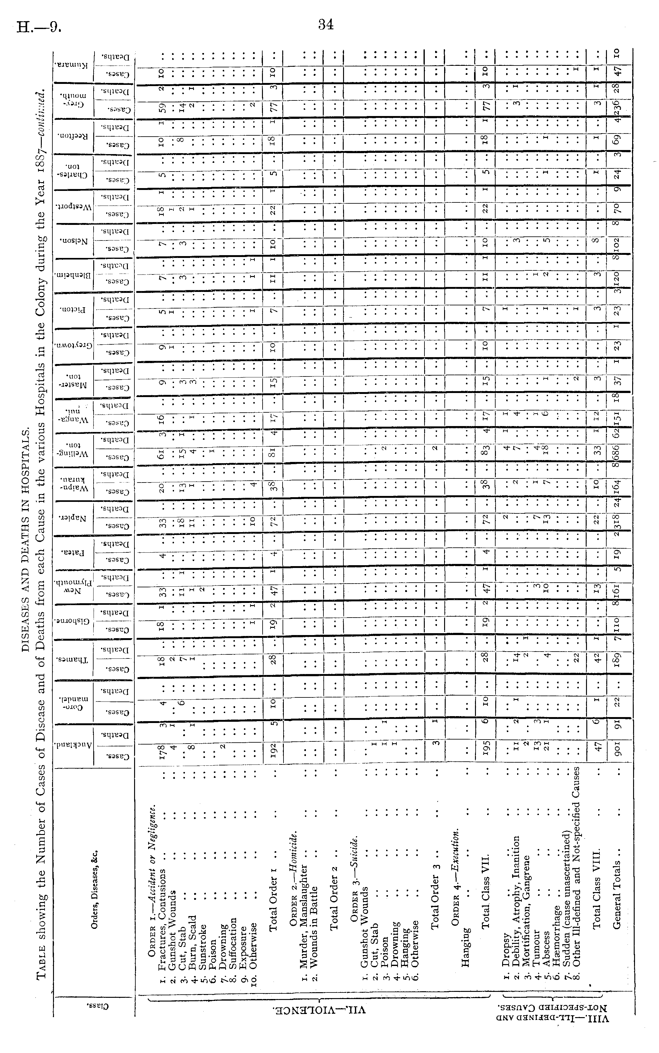 DISEASES AND DEATHS IN HOSPITALS. Table showing the Number of Cases of Disease and of Deaths from each Cause in the various Hospitals in the Colony during the Year 1887— continued.