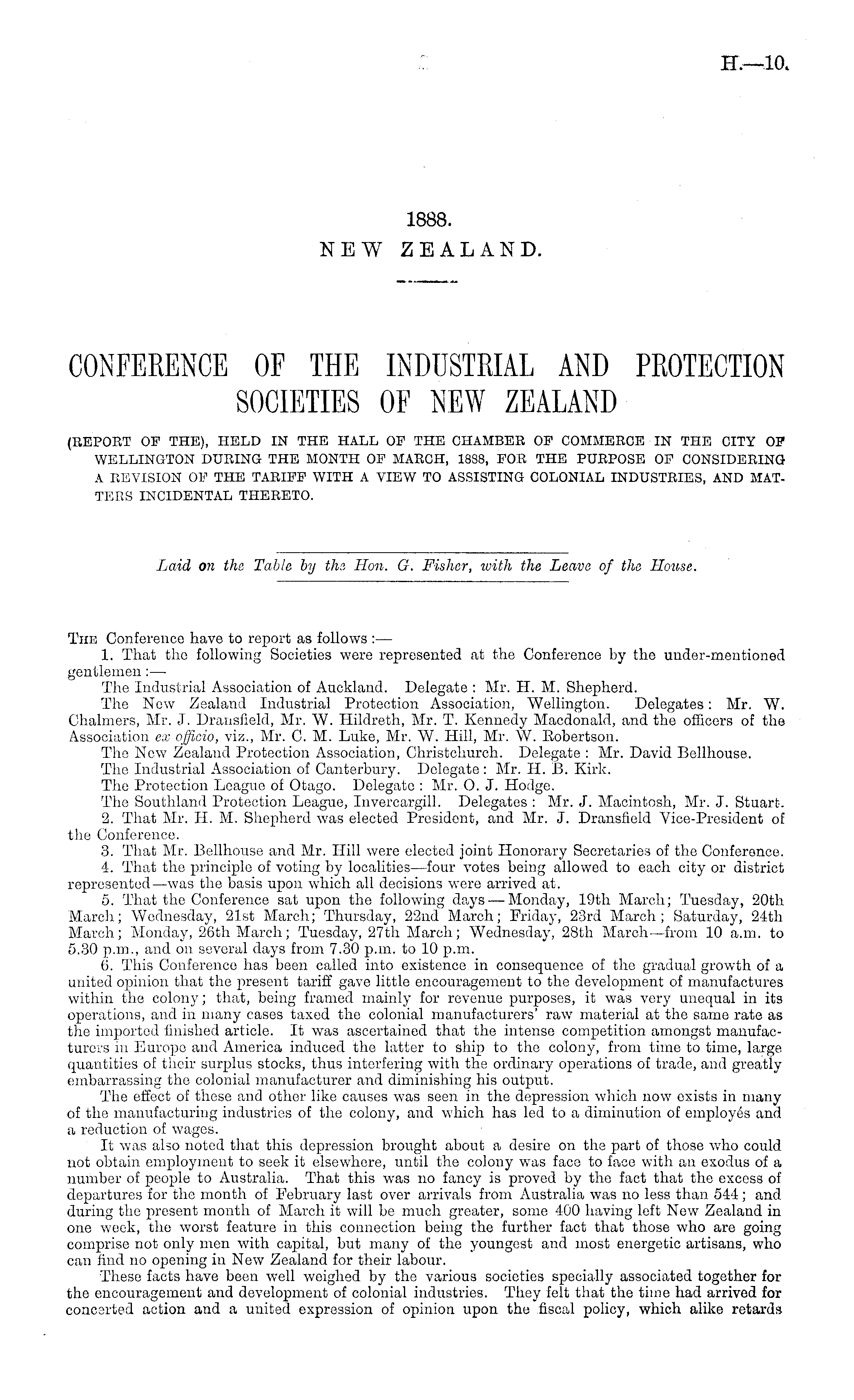 The Conference have to report as follows : — 1. That the following Societies wore represented at the Conference by the under-mentioned gentlemen : — The Industrial Association of Auckland. Delegate : Mr. H. M. Shepherd. The New Zealand Industrial Protection Association, Wellington. Delegates: Mr. W. Chalmers, Mr. J. Dransfield, Mr. "W. Hildreth, Mr. T. Kennedy Macdonald, and the officers of the Association ex officio, viz., Mr. C. M. Luke, Mr. W. Hill, Mr. W. Eobertson. The New Zealand Protection Association, Christchurch. Delegate : Mr. David Bellhouse. The Industrial Association of Canterbury. Delegate : Mr. H. B. Kirk. The Protection League of Otago. Delegate : Mr. O. J. Hodge. The Southland Protection League, Invercargill. Delegates : Mr. J". Macintosh, Mr. J. Stuart. 2. That Mr. H. M. Shepherd was elected President, and Mr. J. Dransfield Vice-President of the Conference. 3. That Mr. Bellhouse and Mr. Hill were elected joint Honorary Secretaries of the Conference. 4. That the principle of voting by localities—four votes being allowed to each city or district represented —was the basis upon which all decisions were arrived at. 5. That the Conference sat upon the following days — Monday, 19th March; Tuesday, 20th March; Wednesday, 21st March; Thursday, 22nd March; Friday, 23rd March; Saturday, 24th March; Monday, 26th March; Tuesday, 27th March; Wednesday, 28th March—from 10 a.m. to 5.30 p.m., and on several days from 7.30 p.m. to 10 p.m. 6. This Conference has been called into existence in consequence of the gradual growth of a united opinion that the present tariff gave little encouragement to the development of manufactures within the colony; that, being framed mainly for revenue purposes, it was very unequal in its operations, and in many cases taxed the colonial manufacturers' raw material at the same rate as the imported finished article. It was ascertained that the intense competition amongst manufacturers in Europe and America induced the latter to ship to the colony, from time to time, large quantities of their surplus stocks, thus interfering with the ordinary operations of trade, and greatly embarrassing the colonial manufacturer and diminishing his output. The effect of these and other like causes was seen in the depression which now exists in many of the manufacturing industries of the colony, and which has led to a diminution of employes and a reduction of wages. It was also noted that this depression brought about a desire on the part of those who could not obtain employment to seek it elsewhere, until the colony was face to face with an exodus of a number of people to Australia. That this was no fancy is proved by the fact that the excess of departures for the month of February last over arrivals from Australia was no less than 544; and during the present month of March it will be much greater, some 400 having left New Zealand in one week, the worst feature in this connection being the further fact that those who are going comprise not only men with capital, but many of the youngest and most energetic artisans, who can find no opening in New Zealand for their labour. These facts have been well weighed by the various societies specially associated together for the encouragement and development of colonial industries. They felt that the time had arrived for concerted action and a united expression of opinion upon the fiscal policy, which alike retards