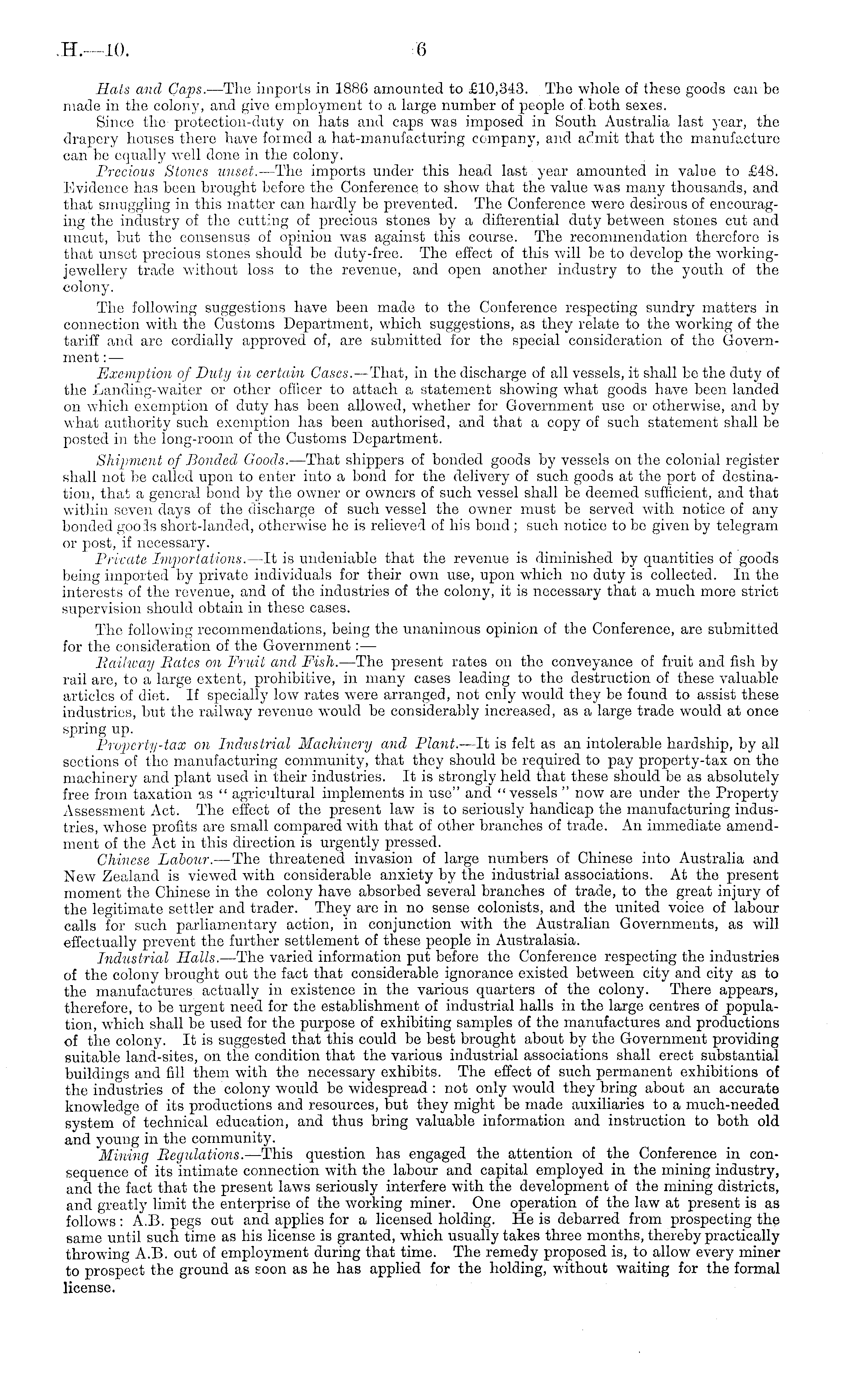 Hats and Caps. —The imports in 1886 amounted to £10,343. The whole of these goods can bo made in the colon) 7, and give employment to a large number of people of both sexes. Since the protection-duty on hats and caps was imposed in South Australia last year, the drapery houses there have formed a hat-manufacturing company, and admit that the manufacture can be equally well done in the colony. Precious Stones unset. —The imports under this head last year amounted in value to £48. Evidence has been brought before the Conference to show that the value was many thousands, and that smuggling in this matter can hardly be prevented. The Conference were desirous of encouraging the industry of the cutting of precious stones by a differential duty between stones cut and uncut, but the consensus of opinion was against this course. The recommendation therefore is that unset precious stones should be duty-free. The effect of this will be to develop the workingjewellery trade without loss to the revenue, and open another industry to the youth of the colony. The following suggestions have been made to the Conference respecting sundry matters in connection with the Customs Department, which suggestions, as they relate to the working of the tariff and arc cordially approved of, are submitted for the special consideration of the Government : — Exemption of Duty in certain Cases. —That, in the discharge of all vessels, it shall bo the duty of the Landing-waiter or other officer to attach a statement showing what goods have been landed on which exemption of duty has been allowed, whether for Government use or otherwise, and by what authority such exemption has been authorised, and that a copy of such statement shall be posted in the long-room of the Customs Department. Shipment of Bonded Goods. —That shippers of bonded goods by vessels on the colonial register shall not be called upon to enter into a bond for the delivery of such goods at the port of destination, that a general bond by the owner or owners of such vessel shall be deemed sufficient, and that within seven days of the discharge of such vessel the owner must be served with notice of any bonded goo Is short-landed, otherwise he is relieved of his bond ; such notice to be given by telegram or post, if necessary. Private Importations. —It is undeniable that the revenue is diminished by quantities of goods being imported by private individuals for their own use, upon which no duty is collected. In the interests of the revenue, and of the industries of the colony, it is necessary that a much more strict supervision should obtain in these cases. The following recommendations, being the unanimous opinion of the Conference, are submitted for the consideration of the Government: — Hallway Bates on Fruit and Fish. —The present rates on the conveyance of fruit and fish by rail are, to a large extent, prohibitive, in many cases leading to the destruction of these valuable articles of diet. If specially low rates were arranged, not only would they be found to assist these industries, but the railway revenue would be considerably increased, as a large trade would at once spring up. Property-tax on Industrial Machinery and Plant. —lt is felt as an intolerable hardship, by all sections of the manufacturing community, that they should be required to pay property-tax on the machinery and plant used in their industries. It is strongly held that these should be as absolutely free from taxation as " agricultural implements in use" and "vessels " now are under the Property Assessment Act. The effect of the present law is to seriously handicap the manufacturing industries, whose profits are small compared with that of other branches of trade. An immediate amendment of the Act in this direction is urgently pressed. Chinese Labour. — The threatened invasion of large numbers of Chinese into Australia and New Zealand is viewed with considerable anxiety by the industrial associations. At the present moment the Chinese in the colony have absorbed several branches of trade, to the great injury of the legitimate settler and trader. They are in no sense colonists, and the united voice of labour calls for such parliamentary action, in conjunction with the Australian Governments, as will effectually prevent the further settlement of these people in Australasia. Industrial Halls. —The varied information put before the Conference respecting the industries of the colony brought out the fact that considerable ignorance existed between city and city as to the manufactures actually in existence in the various quarters of the colony. There appears, therefore, to be urgent need for the establishment of industrial halls in the large centres of population, which shall be used for the purpose of exhibiting samples of the manufactures and productions of the colony. It is suggested that this could be best brought about by the Government providing suitable land-sites, on the condition that the various industrial associations shall erect substantial buildings and fill them with the necessary exhibits. The effect of such permanent exhibitions of the industries of the colony would be widespread : not only would they bring about an accurate knowledge of its productions and resources, but they might be made auxiliaries to a much-needed system of technical education, and thus bring valuable information and instruction to both old and young in the community. Mining Regulations. —This question has engaged the attention of the Conference in consequence of its intimate connection with the labour and capital employed in the mining industry, and the fact that the present laws seriously interfere with the development of the mining districts, and greatly limit the enterprise of the working miner. One operation of the law at present is as follows: A.B. pegs out and applies for a licensed holding. He is debarred from prospecting the same until such time as his license is granted, wh