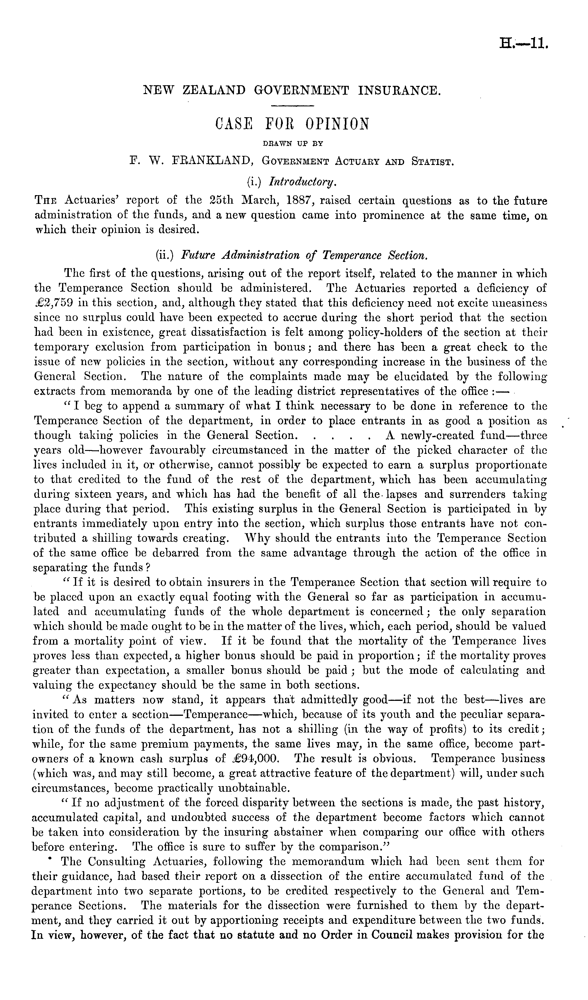 CASE FOR OPINION DEAWN UP BY F. W. 37BANKLAND, Goveenment Actuaey and Statist. (i.) Introductory. The Actuaries' report of the 25th March; 1887, raised certain questions as to the future administration of the funds, and a new question came into prominence at the same time, on which their opinion is desired. (ii.) Future Administration of Temperance Section. The first of the questions, arising out of the report itself, related to the manner in which the Temperance Section should be administered. The Actuaries reported a deficiency of £2,759 in this section, and, although they stated that this deficiency need not excite uneasiness since no surplus could have been expected to accrue during the short period that the section had been in existence, great dissatisfaction is felt among policy-holders of the section at their temporary exclusion from participation in bonus; and there has been a great check to the issue of new policies in the section, without any corresponding increase in the business of the General Section. The nature of the complaints made may be elucidated by the following extracts from memoranda by one of the leading district representatives of the office : — " I beg to append a summary of what I think necessary to be done in reference to the Temperance Section of the department, in order to place entrants in as good a position as though taking policies in the General Section A newly-created fund—three years old —however favourably circumstanced in the matter of the picked character of the lives included iv it, or otherwise, cannot possibly be expected to earn a surplus proportionate to that credited to the fund of the rest of the department, which has beeu accumulating during sixteen years, and which has had the benefit of all the lapses and surrenders taking place during that period. This existing surplus in the General Section is participated in by entrants immediately upon entry into the section, which surplus those entrants have not contributed a shilling towards creating. Why should the entrants into the Temperance Section of the same office be debarred from the same advantage through the action of the office in separating the funds ? " If it is desired to obtain insurers in the Temperance Section that section will require to be placed upon an exactly equal footing with the General so far as participation in accumulated and accumulating funds of the whole department is concerned ; the only separation which should be made ought to be in the matter of the lives, which, each period, should be valued from a mortality point of view. If it be found that the mortality of the Temperance lives proves less than expected, a higher bonus should be paid in proportion; if the mortality proves greater than expectation, a smaller bonus should be paid ; but the mode of calculating and valuing the expectancy should be the same in both sections. "As matters now stand, it appears that admittedly good—if not the best—lives are invited to enter a section—Temperance—which, because of its youth and the peculiar separation of the funds of the department, has not a shilling (in the way of profits) to its credit; while, for the same premium payments, the same lives may, in the same office, become partowners of a known cash surplus of £94,000. The result is obvious. Temperance business (which was, and may still become, a great attractive feature of the department) will, under such circumstances, become practically unobtainable. " If no adjustment of the forced disparity between the sections is made, the past history, accumulated capital, and undoubted success of the department become factors which cannot be taken into consideration by the insuring abstainer when comparing our office with others before entering. The office is sure to suffer by the comparison." The Consulting Actuaries, following the memorandum which had been sent them for their guidance, had based their report on a dissection of the entire accumulated fund of the department into two separate portions, to be credited respectively to the General and Temperance Sections. The materials for the dissection were furnished to them by the department, and they carried it out by apportioning receipts and expenditure between the two funds. In view, however, of the fact that no statute and no Order in Council makes provision for the