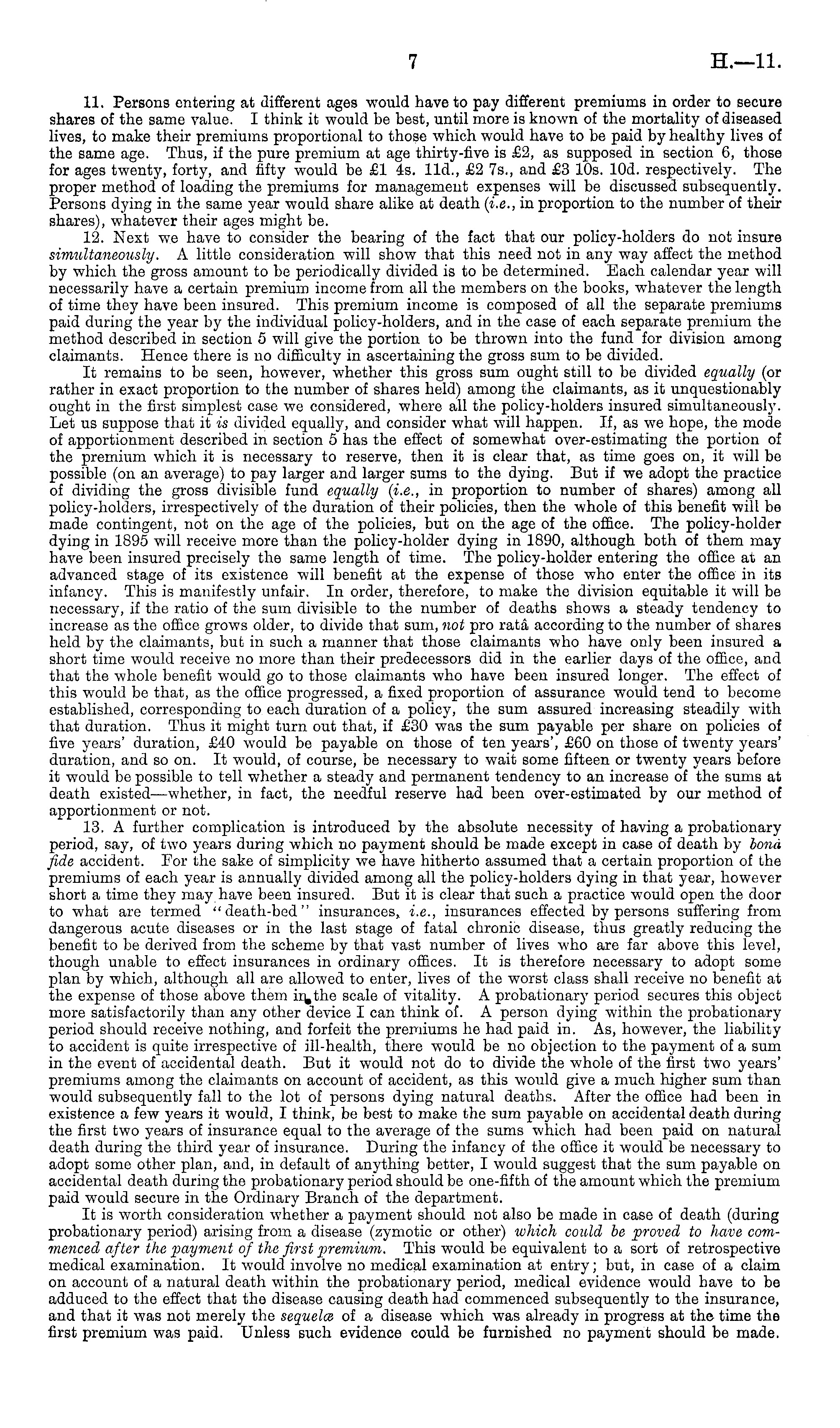 11. Persons entering at different ages would have to pay different premiums in order to secure shares of the same value. I think it would be best, until more is known of the mortality of diseased lives, to make their premiums proportional to those which would have to be paid by healthy lives of the same age. Thus, if the pure premium at age thirty-five is £2, as supposed in section 6, those for ages twenty, forty, and fifty would be £1 4s. lid., £2 75., and £3 10s. lOd. respectively. The proper method of loading the premiums for management expenses will be discussed subsequently. Persons dying in the same year would share alike at death (i.e., in proportion to the number of their shares), whatever their ages might be. 12. Next we have to consider the bearing of the fact that our policy-holders do not insure simultaneously. A little consideration will show that this need not in any way affect the method by which the gross amount to bo periodically divided is to be determined. Each calendar year will necessarily have a certain premium income from all the members on the books, whatever the length of time they have been insured. This premium income is composed of all the separate premiums paid during the year by the individual policy-holders, and in the case of each separate premium the method described in section 5 will give the portion to be thrown into the fund for division among claimants. Hence there is no difficulty in ascertaining the gross sum to be divided. It remains to be seen, however, whether this gross sum ought still to be divided equally (or rather in exact proportion to the number of shares held) among the claimants, as it unquestionably ought in the first simplest case we considered, where all the policy-holders insured simultaneously. Let us suppose that it is divided equally, and consider what will happen. If, as we hope, the mode of apportionment described in section 5 has the effect of somewhat over-estimating the portion of the premium which it is necessary to reserve, then it is clear that, as time goes on, it will be possible (on an average) to pay larger and larger sums to the dying. But if we adopt the practice of dividing the gross divisible fund equally (i.e., in proportion to number of shares) among all policy-holders, irrespectively of the duration of their policies, then the whole of this benefit will be made contingent, not on the age of the policies, but on the age of the office. The policy-holder dying in 1895 will receive more than the policy-holder dying in 1890, although both of them may have been insured precisely the same length of time. The policy-holder entering the office at an advanced stage of its existence will benefit at the expense of those who enter the office in its infancy. This is manifestly unfair. In order, therefore, to make the division equitable it will be necessary, if the ratio of the sum divisible to the number of deaths shows a steady tendency to increase as the office grows older, to divide that sum, not pro rata according to the number of shares held by the claimants, but in such a manner that those claimants who have only been insured a short time would receive no more than their predecessors did in the earlier days of the office, and that the whole benefit would go to those claimants who have been insured longer. The effect of this would be that, as the office progressed, a fixed proportion of assurance would tend to become established, corresponding to each duration of a policy, the sum assured increasing steadily with that duration. Thus it might turn out that, if £30 was the sum payable per share on policies of five years' duration, £40 would be payable on those of ten years', £60 on those of twenty years' duration, and so on. It would, of course, be necessary to wait some fifteen or twenty years before it would be possible to tell whether a steady and permanent tendency to an increase of the sums at death existed—whether, in fact, the needful reserve had been over-estimated by our method of apportionment or not. 13. A further complication is introduced by the absolute necessity of having a probationary period, say, of two years during which no payment should be made except in case of death by bond fide accident. For the sake of simplicity we have hitherto assumed that a certain proportion of the premiums of each year is annually divided among all the policy-holders dying in that year, however short a time they may have been insured. But it is clear that such a practice would open the door to what are termed "death-bed" insurances, i.e., insurances effected by persons suffering from dangerous acute diseases or in the last stage of fatal chronic disease, thus greatly reducing the benefit to be derived from the scheme by that vast number of lives who are far above this level, though unable to effect insurances in ordinary offices. It is therefore necessary to adopt some plan by which, although all are allowed to enter, lives of the worst class shall receive no benefit at the expense of those above them in,the scale of vitality. A probationary period secures this object more satisfactorily than any other device I can think of. A person dying within the probationary period should receive nothing, and forfeit the premiums he had paid in. As, however, the liability to accident is quite irrespective of ill-health, there would be no objection to the payment of a sum in the event of accidental death. But it would not do to divide the whole of the first two years' premiums among the claimants on account of accident, as this would give a much higher sum than would subsequently fall to the lot of persons dying natural deaths. After the office had been in existence a few years it would, I think, be best to make the sum payable on accidental death during the first two years of insurance equal to the average of the sums which had been paid on natural death during the third year of insurance. During the infancy of the office it wou