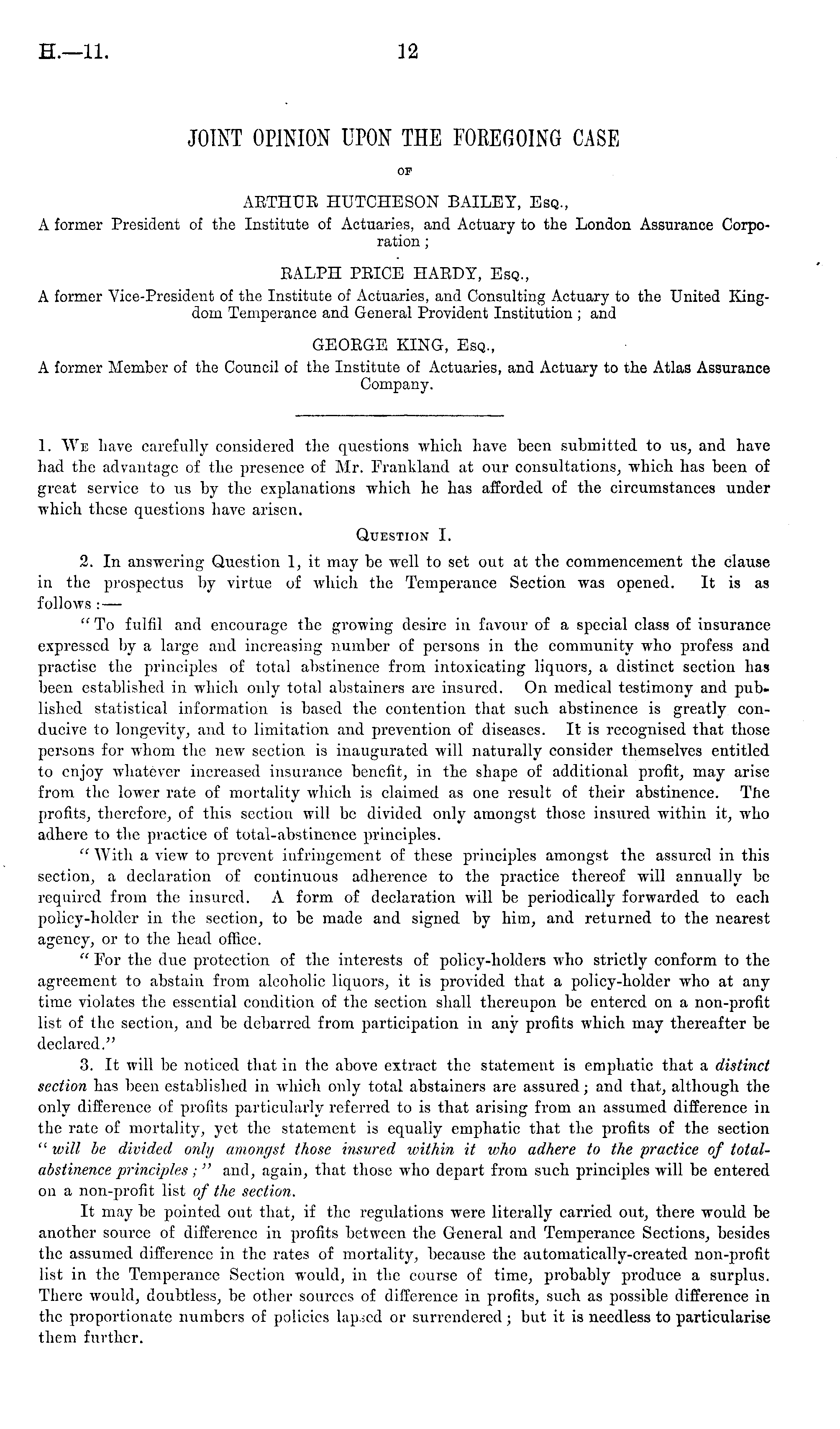 JOINT OPINION UPON THE FOREGOING CASE OF AETHUE HUTCHESON BAILEY, Esq., A former President of the Institute of Actuaries, and Actuary to the London Assurance Corporation ; EALPLT PEICE HAEDY, Esq., A former Vice-President of the Institute of Actuaries, and Consulting Actuary to the United Kingdom Temperance and General Provident Institution ; and GEOEGE KING, Esq., A former Member of the Council of the Institute of Actuaries, and Actuary to the Atlas Assurance Company.