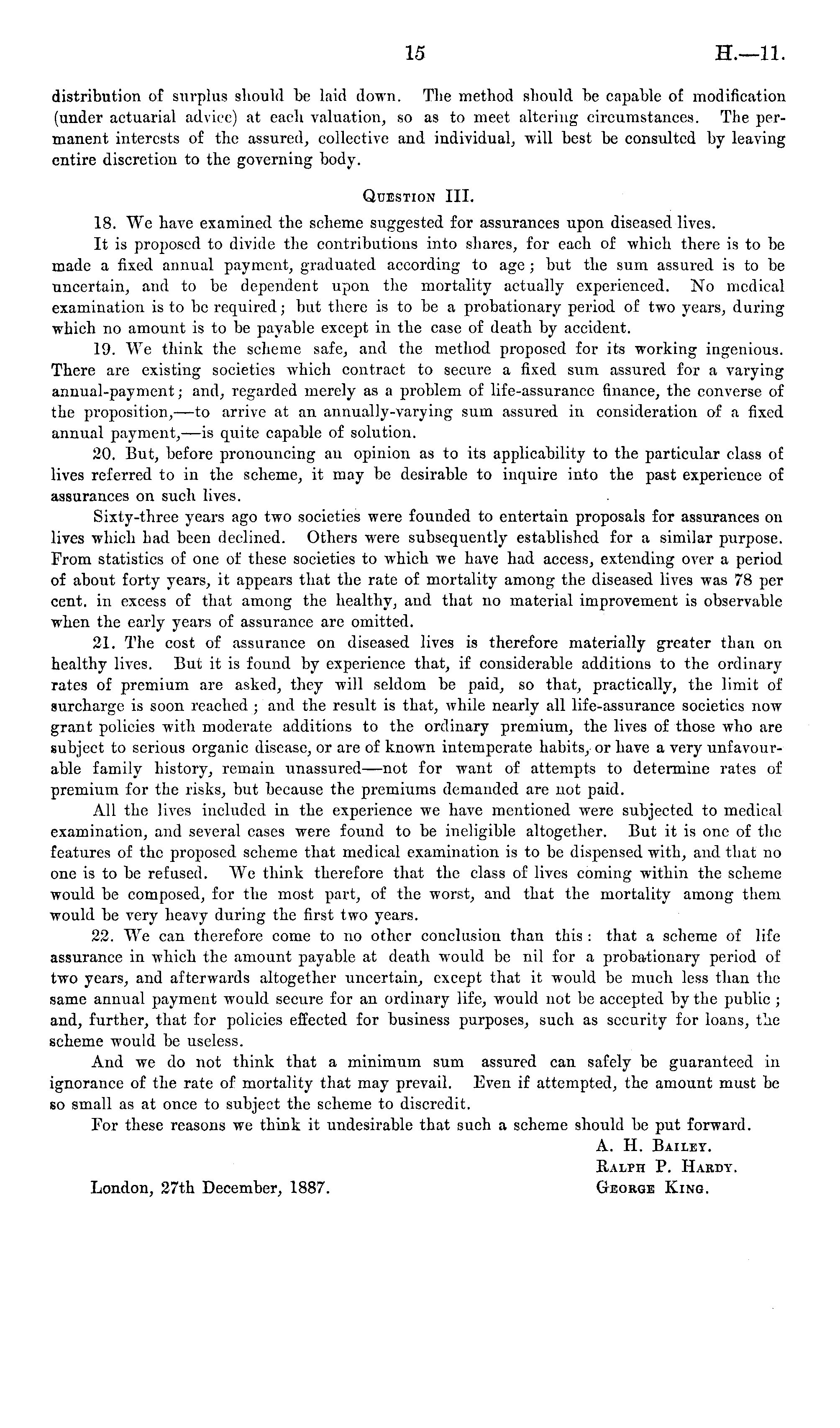 distribution of surplus should be laid down. The method should be capable of modification (under actuarial advice) at each valuation, so as to meet altering circumstances. The permanent interests of the assured, collective and individual, will best be consulted by leaving entire discretion to the governing body. Question 111. 18. We have examined the scheme suggested for assurances upon diseased lives. It is proposed to divide the contributions into shares, for each of which there is to be made a fixed annual payment, graduated according to age ; but the sum assured is to be uncertain, and to be dependent upon the mortality actually experienced. No medical examination is to be required; but there is to be a probationary period of two years, during which no amount is to be payable except in the case of death by accident. 19. We think the scheme safe, and the method proposed for its working ingenious. There are existing societies which contract to secure a fixed sum assured for a varying annual-payment; and, regarded merely as a problem of life-assurance finance, the converse of the proposition,—to arrive at an annually-varying sum assured in consideration of a fixed annual payment, —is quite capable of solution. 20. But, before pronouncing an opinion as to its applicability to the particular class of lives referred to in the scheme, it may be desirable to inquire into the past experience of assurances on such lives. Sixty-three years ago two societies were founded to entertain proposals for assurances on lives which had been declined. Others were subsequently established for a similar purpose. From statistics of one of these societies to which we have had access, extending over a period of about forty years, it appears that the rate of mortality among the diseased lives was 78 per cent, in excess of that among the healthy, and that no material improvement is observable when the early years of assurance arc omitted. 21. The cost of assurance on diseased lives is therefore materially greater than on healthy lives. But it is found by experience that, if considerable additions to the ordinary rates of premium are asked, they will seldom be paid, so that, practically, the limit of surcharge is soon reached ; and the result is that, while nearly all life-assurance societies now grant policies with moderate additions to the ordinary premium, the lives of those who are subject to serious organic disease, or are of known intemperate habits, or have a very unfavourable family history, remain unassured—not for want of attempts to determine rates of premium for the risks, but because the premiums demanded are not paid. All the lives included in the experience we have mentioned were subjected to medical examination, and several cases were found to be ineligible altogether. But it is one of the features of the proposed scheme that medical examination is to be dispensed with, and that no one is to be refused. We think therefore that the class of lives coming within the scheme would be composed, for the most part, of the worst, and that the mortality among them would be very heavy during the first two years. 22. We can therefore come to no other conclusion than this : that a scheme of life assurance in which the amount payable at death would be nil for a probationary period of two years, and afterwards altogether uncertain, except that it would be much less than the same annual payment would secure for an ordinary life, would not be accepted by the public ; and, further, that for policies effected for business purposes, such as security for loans, the scheme would be useless. And we do not think that a minimum sum assured can safely be guaranteed in ignorance of the rate of mortality that may prevail. Even if attempted, the amount must be so small as at once to subject the scheme to discredit. For these reasons we think it undesirable that such a scheme should be put forward. A. 11. Bailey. B,ALPn P. Hardy. London, 27th December, 1887. George King.