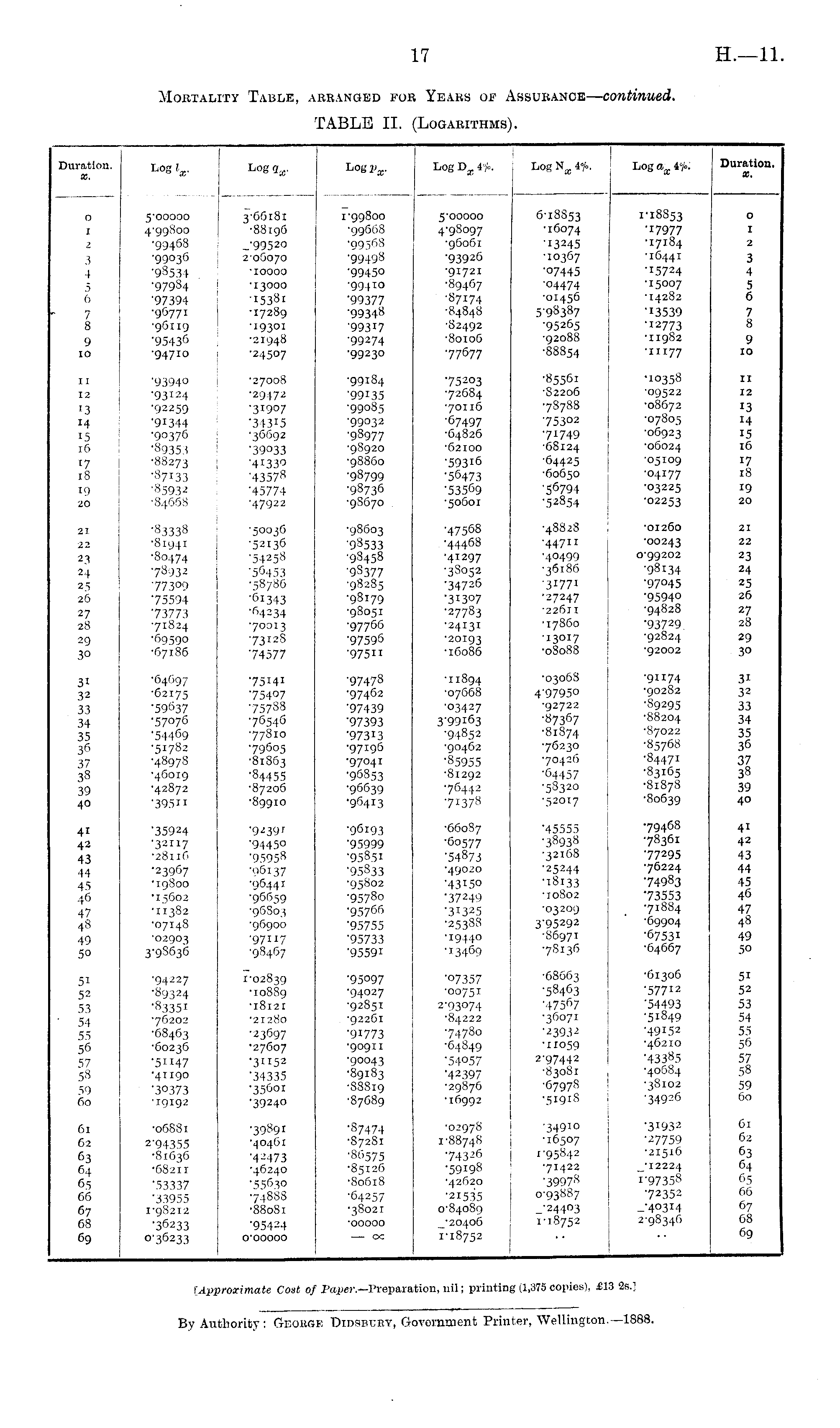 Duration. x. o I 3 4 5 6 Log l x . S'ooooo 4-99800 •99468 •99036 '98534 •97984 •97394 •96771 •96119 •95436 •94710 ! Log <l x . 3-66181 •88196 _-99 5 20 2-06070 ■10000 •13000 •I538I •17289 19301 ■21948 •24507 1-99800 •99668 ■99-,68 ■99498 •99450 •99410 •99377 •99348 •99317 •99274 •99230 Log v x . Log D^ i% 5-00000 4-98097 ■96061 ■93926 •91721 •89467 •87174 '84848 '82492 ■80106 77677 Log N x 4%. 6-18853 •16074 •*3245 ■10367 •07445 •04474 •01456 5-9S387 •95265 •92088 •88854 1-18853 ■17977 •17184 •16441 •15724 •15007 ■14282 •'3539 ■12773 •11982 •11177 Log a x 47«. Duration. x. o I 2 3 4 5 6 7 8 7 8 9 10 9 10 ii 12 •93940 •93*24 •92259 •91344 •90376 •89353 •88273 •87*33 ■85932 •84668 i I •27008 •29472 •31907 '343*5 ■36692 •39033 •41330 ■43578 ■45774 •47922 •99184 ■99135 •99085 ■99032 ■98977 ■98920 •98860 •98799 •98736 ■9S670 75203 ■72684 •70116 •67497 •64826 ■62100 •59316 ■56473 •53569 •50601 •85561 •82206 •78788 ■75302 •71749 ■68124 ■64425 ■60650 ■S6794 •52854 •10358 ■09522 •08672 •07805 ■06923 •06024 ■05109 •04177 •03225 •02253 n *3 14 15 16 '7 18 19 20 12 13 *4 IS 16 *7 18 19 20 21 22 2 3 24 25 26 ■83338 •81941 •80474 7S932 ■77309 ■75594 73773 •71824 •69590 •67186 •50036 •52136 •54258 ■56453 ■58786 •6i343 •64234 •70013 •73128 74577 •98603 •98533 ■98458 •9S377 •98285 •98179 •98051 •97766 ■97596 ■975" ■47568 '44468 •41297 •3S052 •34726 ■31307 •27783 •24131 •20193 ■16086 •48828 •4471 1 •40499 •36186 ■3*77* ■27247 •22611 ■17860 •13017 •08088 •01260 •00243 0-99202 ■98134 •97045 •95940 •94828 •93729 •92824 •92002 21 22 23 24 25 26 27 28 27 28 29 30 29 3° 31 32 33 34 35 36 37 38 39 40 •64697 •62175 •59637 ■57076 ■54469 •51782 •48978 •46019 •42872 •39511 75*4* 75407 •75788 76546 ■77810 •79605 ■81863 •84455 ■87206 •89910 •97478 ■97462 ■97439 •97393 •973*3 •97196 ■97041 •95S53 ■96639 •96413 •11894 '07668 •03427 3'99i63 ■94852 '90462 ■85955 ■81292 •76442 71378 •03068 4-97950 ■92722 •87367 •81874 •76230 •70426 •64457 •58320 •52017 •91174 •90282 ■89295 •88204 •87022 •85768 •84471 •83165 •81878 •80639 3* 32 33 34 35 36 37 38 39 4 n 4* 42 43 44 45 46 47 48 49 50 •35924 •32117 •28116 •23967 •19800 •15602 ■11382 •07148 •0290^ 3-9S636 •9239* •94450 •95958 '96137 ■96441 •96659 •96803 •96900 '97117 ■98467 ■96193 •95999 •95851 ■95833 •95802 •9578o •95766 '95755 •95733 •9559* ■66087 ■60577 •54873 ■49020 ■43*50 •37249 •3*325 •25388 •19440 •13469 •45555 •38938 •32168 •25244 •18133 •10802 •03209 3-95292 •86971 ■7S136 •79468 •78361 ■77295 •76224 74983 73553 •71884 •69904 •67531 •64667 4* 42 43 44 45 46 47 48 49 50 5* 52 53 ■ 54 55 56 57 58 59 60 •94227 •89324 ■8335* ■76202 ■68463 ■60236 •5"47 •41190 •30373 ■19192 1-02839 •10889 '18121 •21280 •23697 •27607 •31152 '34335 •35601 •39240 •95097 •94027 •92851 •92261 •91773 •9091 1 •90043 ■89183 •88819 •87689 ■07357 ■00751 2-93074 •84222 •74780 •64849 •54057 ■42397 '29876 •16992 •68663 ■58463 ■47567 •36071 •23932 •11059 2-97442 ■83081 ■67978 •51918 •61306 ■577 12 •54493 •5*849 •49152 •46210 ■43385 •40684 ■38102 •34926 5* 52 53 54 55 56 57 58 59 60 61 62 63 64 65 66 67 68 69 •06881 2-94355 •81636 •68211 •53337 '33955 I'982I2 •36233 0-36233 •39891 '40461 •42473 •46240 •55630 •7488S ■88081 '95424 O'OOOOO •87474 •872S1 •86575 •85126 •80618 ■64257 •38021 •00000 •02978 1-88748 74326 ■59*98 •42620 ■21535 0-84089 _■ 20406 1-18752 •349*0 •16507 1-95842 •71422 •3997s 0-93887 _'24403 1-18752 •31932 ■27759 ■21516 _-I2224 '•97358 ■72352 -403*4 2'98346 61 62 63 64 65 66 67 68 69 — oc
