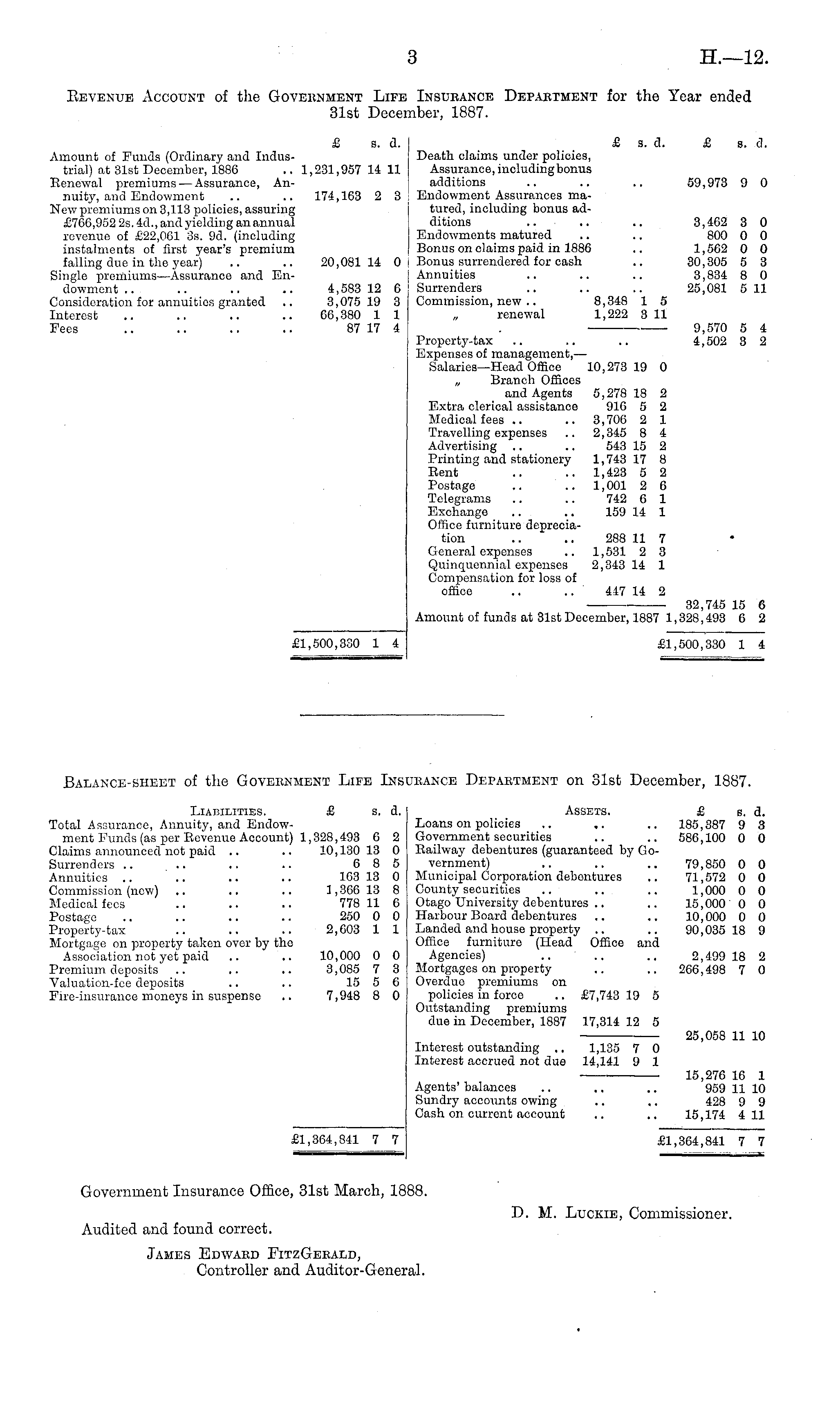 Balance-sheet of the Government Life Insurance Department on 31st December, 1887. Liabilities. £ s. d. Assets. £ s. d. Total Assurance, Annuity, and Endow- Loans on policies .. .. .. 185,387 9 3 ment Funds (as per Revenue Account) 1,328,493 6 2 Government securities .. .. 586,100 0 0 Claims announced not paid .. .. 10,130 13 0 Railway debentures (guaranteed by GoSurrenders .. .. .. .. 6 8 5 vernment) .. .. .. 79,850 0 0 Annuities .. .. .. .. 163 13 0 Municipal Corporation debentures .. 71,572 0 0 Commission (new) .. .. .. 1,866 18 8 County securities .. .. .. 1,000 0 0 Medical fees .. .. .. 778 11 6 Otago University debentures .. .. 15,000 0 0 Postage .. .. .. .. 250 0 0 Harbour Board debentures .. .. 10,000 0 0 Property-tax .. .. .. 2,603 1 1 Landed and house property .. .. 90,035 18 9 Mortgage on property taken over by the Office furniture (Head Office and Association not yet paid .. .. 10,000 0 0 Agencies) .. .. .. 2,499 18 2 Premium deposits .. .. .. 3,085 7 3 Mortgages on property .. .. 266,498 7 0 Valuation-fee deposits .. .. 15 5 0 Overdue premiums on Fire-insurance moneys in suspense .. 7,948 8 0 policies in force .. £7,743 19 5 Outstanding premiums due in December, 1887 17,314 12 5 ■ 25,058 11 10 Interest outstanding .. 1,135 7 0 Interest accrued not due 14,141 9 1 15,276 16 1 Agents' balances .. .. .. 959 11 10 Sundry accounts owing .. .. 428 9 9 Cash on current account .. .. 15,174 4 11 £1,364,841 7 7 £1,304,841 7 7 Government Insurance Office, 31st March, 1888. D. M. Luckie, Commissioner. Audited and found correct. James Edward FitzGerald, Controller and Auditor-General.