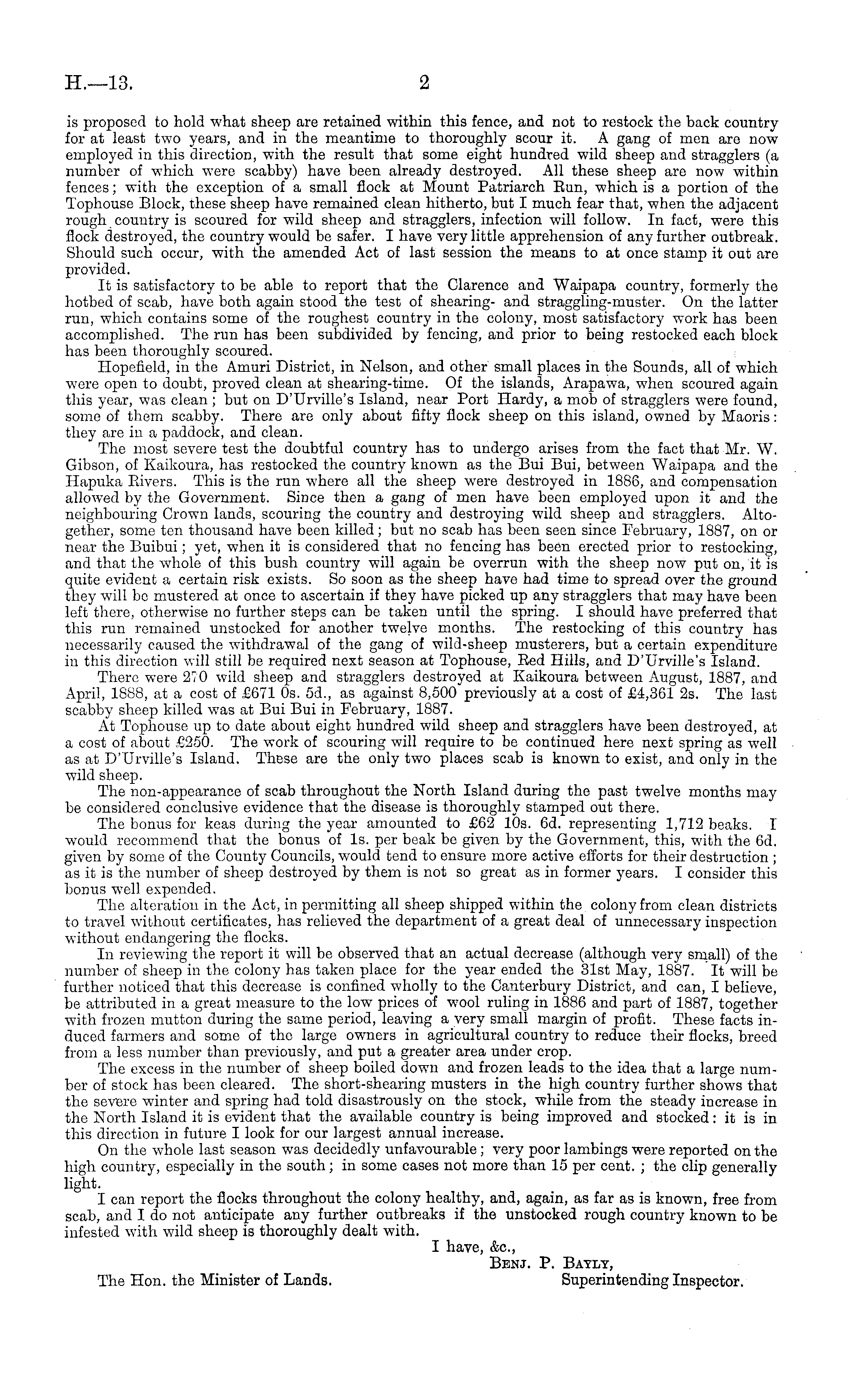 is proposed to hold what sheep are retained within this fence, and not to restock the back country for at least two years, and in the meantime to thoroughly scour it. A gang of men are now employed in this direction, with the result that some eight hundred wild sheep and stragglers (a number of which were scabby) have been already destroyed. All these sheep are now within fences; with the exception of a small flock at Mount Patriarch Bun, which is a portion of the Tophouse Block, these sheep have remained clean hitherto, but I much fear that, when the adjacent rough country is scoured for wild sheep and stragglers, infection will follow. In fact, were this flock destroyed, the country would be safer. I have very little apprehension of any further outbreak. Should such occur, with the amended Act of last session the means to at once stamp it out are provided. It is satisfactory to be able to report that the Clarence and Waipapa country, formerly the hotbed of scab, have both again stood the test of shearing- and straggling-muster. On the latter run, which contains some of the roughest country in the colony, most satisfactory work has been accomplished. The run has been subdivided by fencing, and prior to being restocked each block has been thoroughly scoured. Hopefield, in the Amuri District, in Nelson, and other small places in the Sounds, all of which were open to doubt, proved clean at shearing-time. Of the islands, Arapawa, when scoured again this year, was clean ; but on D'Urville's Island, near Port Hardy, a mob of stragglers were found, some of them scabby. There are only about fifty flock sheep on this island, owned by Maoris: they are in a paddock, and clean. The most severe test the doubtful country has to undergo arises from the fact that Mr. W. Gibson, of Kaikoura, has restocked the country known as the Bui Bui, between Waipapa and the Hapuka Bivers. This is the run where all the sheep were destroyed in 1886, and compensation allowed by the Government. Since then a gang of men have been employed upon it and the neighbouring Crown lands, scouring the country and destroying wild sheep and stragglers. Altogether, some ten thousand have been killed; but no scab has been seen since February, 1887, on or near the Buibui; yet, when it is considered that no fencing has been erected prior to restocking, and that the whole of this bush country will again be overrun with the sheep now put on, it is quite evident a certain risk exists. So soon as the sheep have had time to spread over the ground they will bo mustered at once to ascertain if they have picked up any stragglers that may have been loft there, otherwise no further steps can be taken until the spring. I should have preferred that this run remained unstocked for another twelve months. The restocking of this country has necessarily caused the withdrawal of the gang of wild-sheep musterers, but a certain expenditure in this direction will still be required next season at Tophouse, Bed Hills, and D'Urville's Island. There were 270 wild sheep and stragglers destroyed at Kaikoura between August, 1887, and April, 1888, at a cost of £671 os. 5d., as against 8,500 previously at a cost of £4,361 2s. The last scabby sheep killed was at Bui Bui in February, 1887. At Tophouse up to date about eight hundred wild sheep and stragglers have been destroyed, at a cost of about £250. The work of scouring will require to be continued here next spring as well as at D'Urville's Island. These are the only two places scab is known to exist, and only in the wild sheep. The non-appearance of scab throughout the North Island during the past twelve months may be considered conclusive evidence that the disease is thoroughly stamped out there. The bonus for keas during the year amounted to £62 10s. 6d. representing 1,712 beaks. I would recommend that the bonus of Is. per beak be given by the Government, this, with the 6d. given by some of the County Councils, would tend to ensure more active efforts for their destruction ; as it is the number of sheep destroyed by them is not so great as in former years. I consider this bonus well expended. The alteration in the Act, in permitting all sheep shipped within the colony from clean districts to travel without certificates, has relieved the department of a great deal of unnecessary inspection without endangering the flocks. In reviewing the report it will be observed that an actual decrease (although very small) of the number of sheep in the colony has taken place for the year ended the 31st May, 1887. It will be further noticed that this decrease is confined wholly to the Canterbury District, and can, I believe, be attributed in a great measure to the low prices of wool ruling in 1886 and part of 1887, together with frozen mutton during the same period, leaving a very small margin of profit. These facts induced farmers and some of the large owners in agricultural country to reduce their flocks, breed from a less number than previously, and put a greater area under crop. The excess in the number of sheep boiled down and frozen leads to the idea that a large number of stock has been cleared. The short-shearing musters in the high country further shows that the severe winter and spring had told disastrously on the stock, while from the steady increase in the North Island it is evident that the available country is being improved and stocked: it is in this direction in future I look for our largest annual increase. On the whole last season was decidedly unfavourable ; very poor lambings were reported on the high country, especially in the south; in some cases not more than 15 per cent. ; the clip generally light. I can report the flocks throughout the colony healthy, and, again, as far as is known, free from scab, and I do not anticipate any further outbreaks if the unstocked rough country known to be infested with wild sheep is thoroughly dealt with. I have, &c, Benj. P. Bayly, The Hon. the Minister of Lands. Su