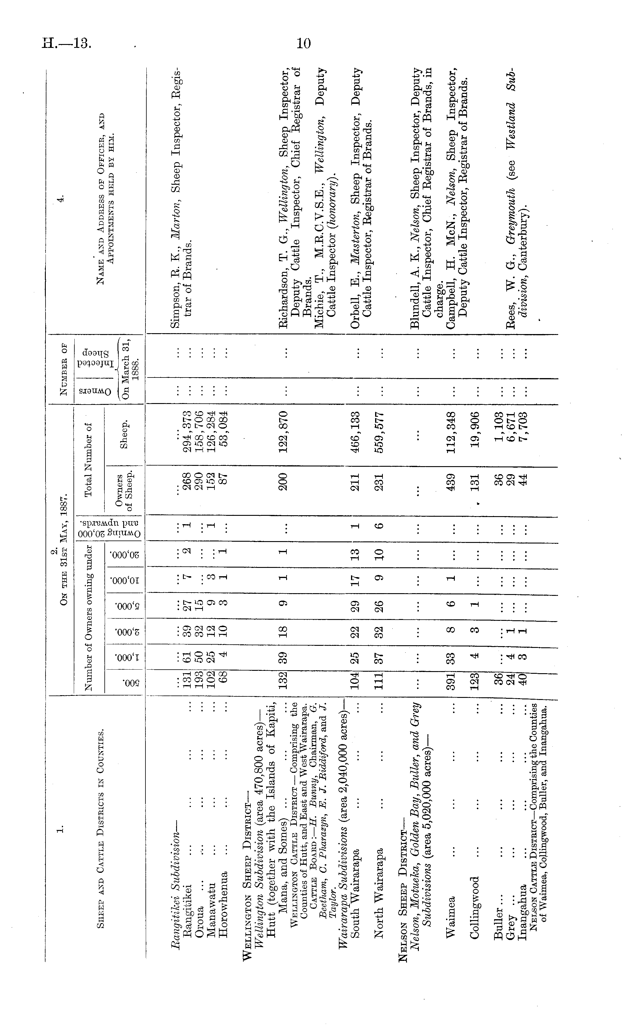 1. 2. On the 31st 4. llAY, 8S7. Number op Sheep and Cattle Districts in Counties. Number of Owners owning under o • CM '%■& is d Total Number of to - .9.1 Name and Address of Officer, and Appointments held by him. o o o o o o o c o O O O CM Owners of Sheep. Sheep. On March 31," 1888. o o Bangitikei Subdivision — Eangitikei Oroua Manawatu Horowhenua 131 193 102 68 01 25 4 30 32 12 10 27 15 9 3 7 3 1 2 i i 268 290 152 87 294,373 158,706 126,284 53,084 Simpson, E. K., Mai-ton, Sheep Inspector, Eegistrar of Brands. 1 Wellington Sheep District — ■ Wellington Subdivision (area 470,800 acres) — Hutt (together with the Islands of Kapiti, Mana, and Somes) ... Wellington Cattle District — Comprising the Counties of Hutt, and East and West Wairarapa. Cattle Boap.d :— H. Bunny, Chairman, 67. Beetham, G. Pharazyn, E. J. Biddiford, and J. Taylor. Wairarapa Subdivisions (area 2,040,000 acres) — South Wairarapa 132 39 18 200 122,870 Eichardson, T. G., Wellington, Sheep Inspector. Deputy Cattle Inspector, Chief Eegistrar oi Michie, T., M.E.C.V.S.E., Wellington, Deputj Cattle Inspector (honorary). 104 25 22 29 17 13 1 211 466,133 Orbell, E., Masterton, Sheep Inspector, Deputj Cattle Inspector, Eegistrar of Brands. North Wairarapa 111 37 32 20 9 10 0 231 559,577 Nelson Sheep District — Nelson, Motucka, Golden Bay, Butler, and Grey Subdivisions (area 5,020,000 acres) — Blundell, A. K., Nelson, Sheep Inspector, Deputj Cattle Inspector, Chief Eegistrar of Brands, in charge. Campbell, H. McN., Nelson, Sheep Inspector. Deputy Cattle Inspector, Eegistrar of Brands. Waimea 391 33 8 G 1 439 112,348 Collingwood 123 4 3 1 . 131 19,906 Buller... Grey ... Inangahua Nelson Cattle District —Comprising the Counties of Waimea, Collingwood, Buller, and Inangahua. 36 24 40 4 3 i l 36 29 44 1,103 6,671 7,703 Eees, W. C, Greymouth (see Westland Subdivision, Canterbury).