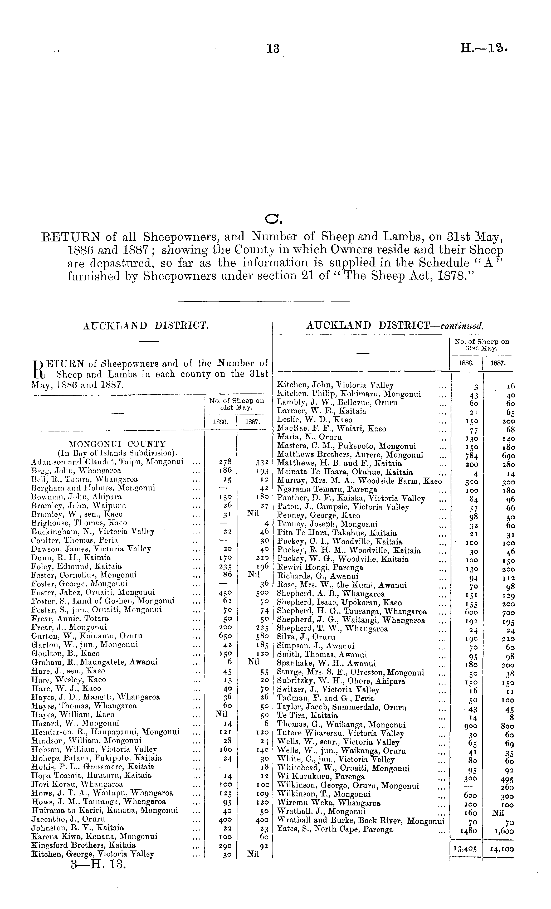 AUCKLAND DISTRICT. RETURN of Sheepowners and of the Number of Sheep and Lambs in each county on the 31st May, 1886 and 1887.