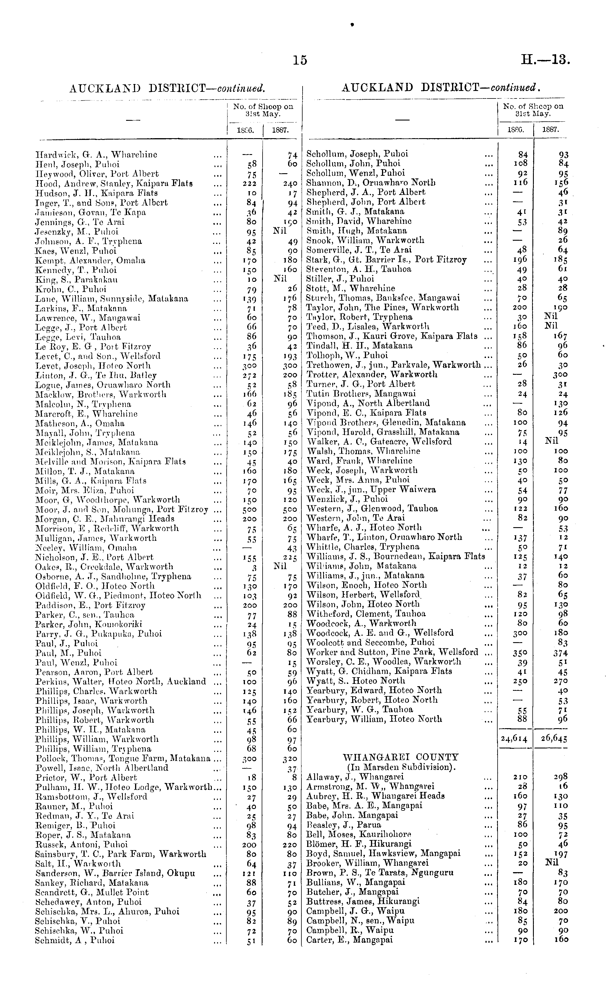 No. of S: 31st I licep on May. 1887. 1866. I Hardwick, G. A., Wharehine Hen!, Joseph, Puhoi Iteywood, Oliver, Port Albert Hood, Andrew, Stanley, Kaipara Flats Hudson, J. II., Kaipara Flats Inger, T., and Sons, Port Albert Jamieson, Govau, rTc Kapa Jennings, G., Te Arai Jesenzky, M., Puhoi Johnson, A. F., Trypliena Kaes, Wenzl, Puhoi Kempt, Alexander, Omaha Kennedy, T., Puhoi King, S., Parakakau Krohn, O, Puhoi Lane, William, Sunnyside, Matakana Larkins, F., Matakana Lawrence, W., Mangawai Legge, J., Port Albert Legge, Levi, Tauhoa Le Roy, E. G , Port Fitzroy Levet, G, and Son., W rellsford Levet, Joseph, Hoteo North Linton, J. G., Te Ihu, Batley Logue, James, Oruawharo North Maeklow, Brothers, Warkworth Malcolm, N., Trypliena Marcroft, E., Wharehine Matheson, A., Omaha Majall, John, Trypliena Meiklejohn, James, Matakana Meiklejohn, S., Matakana Melville and Morison, Kaipara Flats Millon, T. J., Matakana Mills, G. A., Kaipara Flats Moir, Mrs. Eliza., Puhoi Moor, G, Woodlhorpe, Warkworth Moor, J. and Son, Mohunga, Port Fitzroy ... Morgan, C. E., Mahurangi Heads Morrison, 15 , Redeliff, Warkworth Mulligan, James, Warkworth Neeley. William. Omaha Nicholson, J. B., Port Albert Oakcs, R., Creekdale, Warkworth Osborne, A. J., Sandholme, Trypliena Oldfield, F. O., Hoteo North Oldfield, W. G., Piedmont, Hoteo North ... Paddison, E., Port Fitzroy Parker, C, sen., Tauhoa Parker, John, Komokoriki Parry, J. G., Pukapuka, Puhoi Paul', J., Puhoi Paul, M., Puhoi Paul, Wenzl, Puhoi Pearson, Aaron, Port Albert Perkins, Walter, Hoteo North, Auckland ... Phillips, Charles, Warkworth Phillips, Isaac, Warkworth Phillips, Joseph, Warkworth Phillips, Robert, Warkworth Phillips, W. II., Matakana Phillips, William, Warkworth Phillips, William, Tnphena Pollock, Thomas, Tongue Farm, Matakana ... Powell, Isaac, North Albertland Prictor, W., Port Albert Pulham, II. W., Hoteo Lodge, Warkworth... Ramsbottom, J., Wellsford Rauner, M., Puhoi Redman, J. Y., To Arai Remiger, 1!., Puhoi Boper, J. S., Matakana Russek, Antoni, Puhoi Sainsburv, T. G, Park Farm, Warkworth Salt, H., Warkworth Sanderson, W., Barrier Island, Okupu Sankey, Richard, Matakana Seandrett, G., Mullet Point Schedawey, Anton, Puhoi Sehischka, Mrs. L., Ahui'oa, Puhoi SohUchka, V., Puhoi Sehischka, W., Pulioi Schmidt, A , Puhoi S« 75 222 74 6o 240 '7 10 84 36 80 94 42 1 go Nil 95 42 85 170 '5o 10 49 90 180 160 Nil 79 '39 7' 60 66 86 36 '75 300 272 52 166 62 46 146 52 140 150 4 5 160 26 j 76 78 7° 7° 90 42 193 300 200 58 '8.5 96 56 140 56 150 '75 40 180 ■65 1 70 7° 150 500 200 75 55 95 120 500 200 6S 75 43 225 Nil 75 170 92 200 88 '55 3 75 130 103 200 77 24 '3<S <>5 62 '5 158 95 80 15 59 96 140 160 so IOO '25 140 146 55 45 98 68 152 66 60 97 60 300 320 37 8 18 '5° 27 40 25 98 83 200 80 64 121 88 60 o 130 29 50 27 94 80 220 80 37 95 82 37 110 7' 7° 52 90 89 7° 60 72 5'