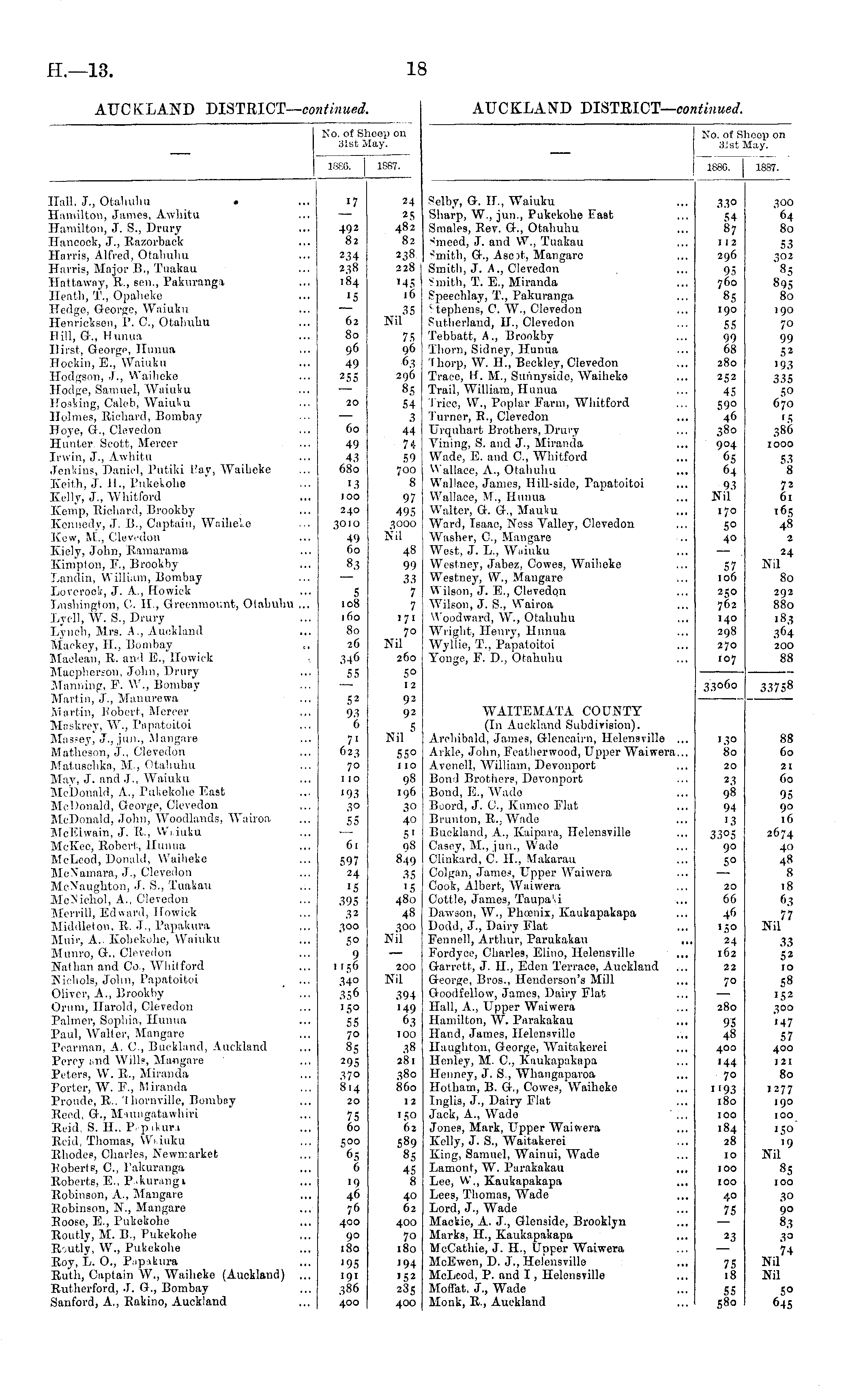 No. of f 3i St hoop on May. 1887. 1880. Selby, G. II., Waiuku Sharp, W., jun., Pukekohe Fast Smales, Rev. G., Otahuhu -meed, J. and W., Tuakau G-, Asoot, Mangare Smith, J. A., Clevedon Smith, T. E., Miranda Speechlay, T., Pakuranga tephens, C. W., Clevedon Sutherland, II., Clevedon Tebbatt, A., Brookby Thorn, Sidney, Hunua Thorp, W. H., Beckley, Clevedon Trace, U. M., Sutinysidc, Waiheke Trail, William, Hunua Trice, W., Poplar Farm, Whitford Turner, R., Clevedon Urquhart Brothers, Drury Vining, S. and J., Miranda Wade, E. and O, Whitford Wallace, A., Otahuhu Wallace, James, Hill-side, Papatoitoi Wallace, M., Hunua Walter, G. G., Mauku Ward, Isaac, Ness Valley, Clevedon Washer, C, Mangare West, J. L., Waiuku Wcslney, Jabez, Cowes, Waiheke Wcstney, W., Mangare Wilson, J. E., Clevedon Wilson, J. S., Wairoa Woodward, W., Otahuhu Wright, Henry, Hunua WylTie, T., Papatoitoi Yonge, F. D., Otahuhu 330 54 87 1 1 2 296 95 760 85 190 55 99 68 280 252 45 590 46 380 904 65 64 93 Nil 170 5° 40 300 64 80 53 302 85 895 80 190 70 99 52 '93 335 50 670 386 1000 53 8 57 106 72 61 '65 48 2 24 Nil 80 292 880 183 3<M 200 88 250 762 140 298 270 107 WAITEMATA COUNTY (In Auckland Subdivision). Archibald, James, Glencairn, Helensville ... Arkle, John, Featberwood, Upper Waiwera... Avenell, William, Devonport Bond Brothers, Devonport Bond, E., Wade Byord, J. C, Kumeo Flat Brunton, R., Wade Buckland, A., Kaipara, Helensville Casey, M., jun., Wade Clinkard, C. H., Makarau Colgan, James, Upper Waiwera Cook, Albert, Waiwera Cottle, James, Taupa'.i Dawson, W., Phoenix, Kaukapakapa Dodd, J., Dairy Flat Fennel!, Arthur, Parukakau Fordyce, Charles, Elino, Helensville Garrett, J. II., Eden Terrace, Auckland George, Bros., Henderson's Mill Goodfellow, James, Dairy Flat Hall, A., Upper Waiwera Hamilton, W. Parakakau Hand, James, Helensville Haughton, George, Waifakerei Henley, M. 0., Kaukapakapa Henney, J. S., Whangaparoa Ilotham, B. Or., Cowes, Waiheke Inglis, J., Dairy Flat Jack, A., Wade ... Jones, Mark, Upper Waiwera Kelly, J. S., Waitakerei King, Samuel, Wainui, Wade Lamont, W. Parakakau Lee, W., Kaukapakapa Lees, Thomas, AVade Lord, J., Wade Maekie, A. J., Glenside, Brooklyn Marks, II., Kaukapakapa McCathie, J. H., Upper Waiwera McEwen, D. J., Helensvillo MeLeod, P. and I, Helensville Moffat, J., Wade Monk, R, Auckland 33060 33758 130 80 20 88 60 23 98 94 '3 3305 90 5° 20 66 46 '50 24 162 22 70 21 60 95 90 16 2674 40 48 8 18 6.3 77 Nil 33 52 10 58 152 300 '47 57 400 121 80 1277 190 100 280 95 48 400 '44 70 1 193 180 100 .84 28 10 IOO '5° '9 Nil 85 100 IOO 40 75 23 30 90 83 30 74 Nil Nil 75 18 55 580 50 645