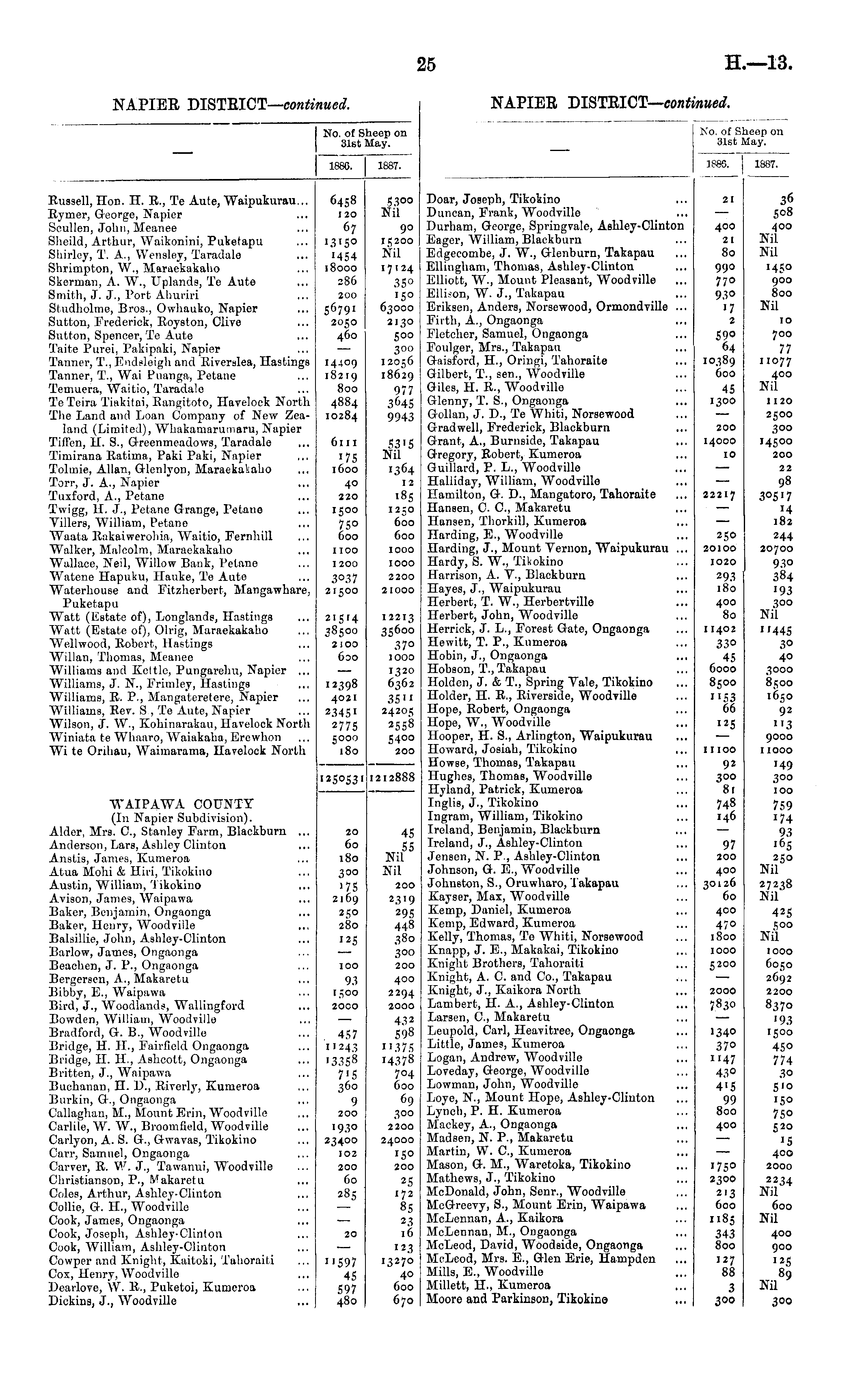 No. of Sheep on 31st May. 1886. I 1887. Russell, non. H. R., Te Aute, Waipukurau... Rymer, George, Napier Scullen, John, Meanee Sheild, Arthur, Waikonini, Puketapu Shirley, T. A., Wensley, Taradale Shrimpton, W., Maraekakaho Skerman, A. W., Uplands, Te Aute Smith, J. J., Port Aburiri Studholme, Bros., Owhauko, Napier Sutton, Frederick, Royston, Clive Sutton, Spencer, Te Aute Taite Purci, Pakipaki, Napier Tanner, T.,Endsleigh and Riverslea, Hastings Tanner, T., Wai Puanga, Petane Temuera, AVaitio, Taradale Te Teira Tiakitai, Rangitoto, Havelock North The Land and Loan Company of New Zealand (Limited), Whakamarumaru, Napier Tiffen, II. S., Greenmeadows, Taradale Timirana Ratima, Paki Paki, Napier Tolmie, Allan, Glenlyon, Maraekakaho Torr, J. A., Napier Tuxford, A., Petane Twigg, H. J., Petane Grange, Petane Villers, William, Petane Waata Rakaiwerohia, AVaitio, Fernhill Walker, Malcolm, Maraekakaho Wallace, Neil, Willow Bank, Petane Watene Hapuku, Hauke, Te Auto Waterhouse and Fitzherbert, Mangawhare, Puketapu Watt (Estate of), Longlands, Hastings Watt (Estate of), Olrig, Maraekakaho Wellwood, Robert, Hastings Willan, Thomas, Meanee Williams and Kettle, Pungarehu, Napier ... Williams, J. N., Frimley, Hastings Williams, R. P., Mangateretere, Napier Williams, Rev. S , Te Aute, Napier Wilson, J. AY, Kohinarakau, Havelock North AViniata te Whaaro, AA^aiakaha, Erewhon Wi te Orihau, AVaimarama, Havelock North 6458 120 67 13'5° '454 18000 286 53°o Nil 90 15200 Nil 17 124 35° '5° 63000 2130 500 300 12056 18629 977 3645 9943 200 56791 2050 460 14409 18219 800 4884 10284 6111 '75 1600 40 220 53'5 Nil 1364 12 '85 1250 600 600 1000 1500 75° 600 1100 1200 30.37 21500 1000 2200 21000 21514 38500 2100 600 12213 35600 37° 1000 12398 4021 2.345' 2775 5000 180 1320 6362 35" 24205 2558 5400 200 '250531 1212888 WAIPAWA COUNTY (In Napier Subdivision). Alder, Mrs. C, Stanley Farm, Blackburn ... Anderson, Lars, Ashley Clinton Anstis, James, Kumeroa Atua Mohi & Hiri, Tikokino Austin, William, Tikokino Avison, James, AVaipawa Baker, Benjamin, Ongaonga Baker, Henry, Woodville Balsillie, John, Ashley-Clinton Barlow, James, Ongaonga Beachen, J. P., Ongaonga Bergersen, A., Makaretu Bibby, E., AVaipawa Bird, J., Woodlands, Wallingford Bowden, William, AVoodville Bradford, G. B., Woodville Bridge, H. II., Fairfield Ongaonga Bridge, II. H., Ashcott, Ongaonga Britten, J., Waipawa Buchanan, H. D., Riverly, Kumeroa Burkin, G., Ongaonga Callaghan, M., Mount Erin, Woodville Carlile, AV. AV., Broomfield, Woodville Carlyon, A. S. G., Gwavas, Tikokino Carr, Samuel, Ongaonga Carver, R. W. J., Tawanui, AVoodville Christianson, P., Makaretu Coles, Arthur, Ashley-Clinton Collie, G. H., Woodville Cook, James, Ongaonga Cook, Joseph, Ashley-Clint on Cook, AVilliam, Ashley-Clinton Cowper and Knight, Kaitoki, Tahoraiti Cox, Henry, AVoodville Dearlove, W. R., Puketoi, Kumeroa Dickins, J., Woodville 20 60 180 300 '75 2169 250 280 125 IOO 93 1500 2000 457 1' 24.3 '335 8 7'5 360 9 200 45 55 Nil Nil 200 2.3'9 295 448 380 300 200 400 2294 2000 432 598 "375 14378 704 600 69 300 2200 "93° 23400 102 24000 150 200 25 172 85 23 16 200 60 285 20 "597 45 597 480 '23 13270 40 600 670