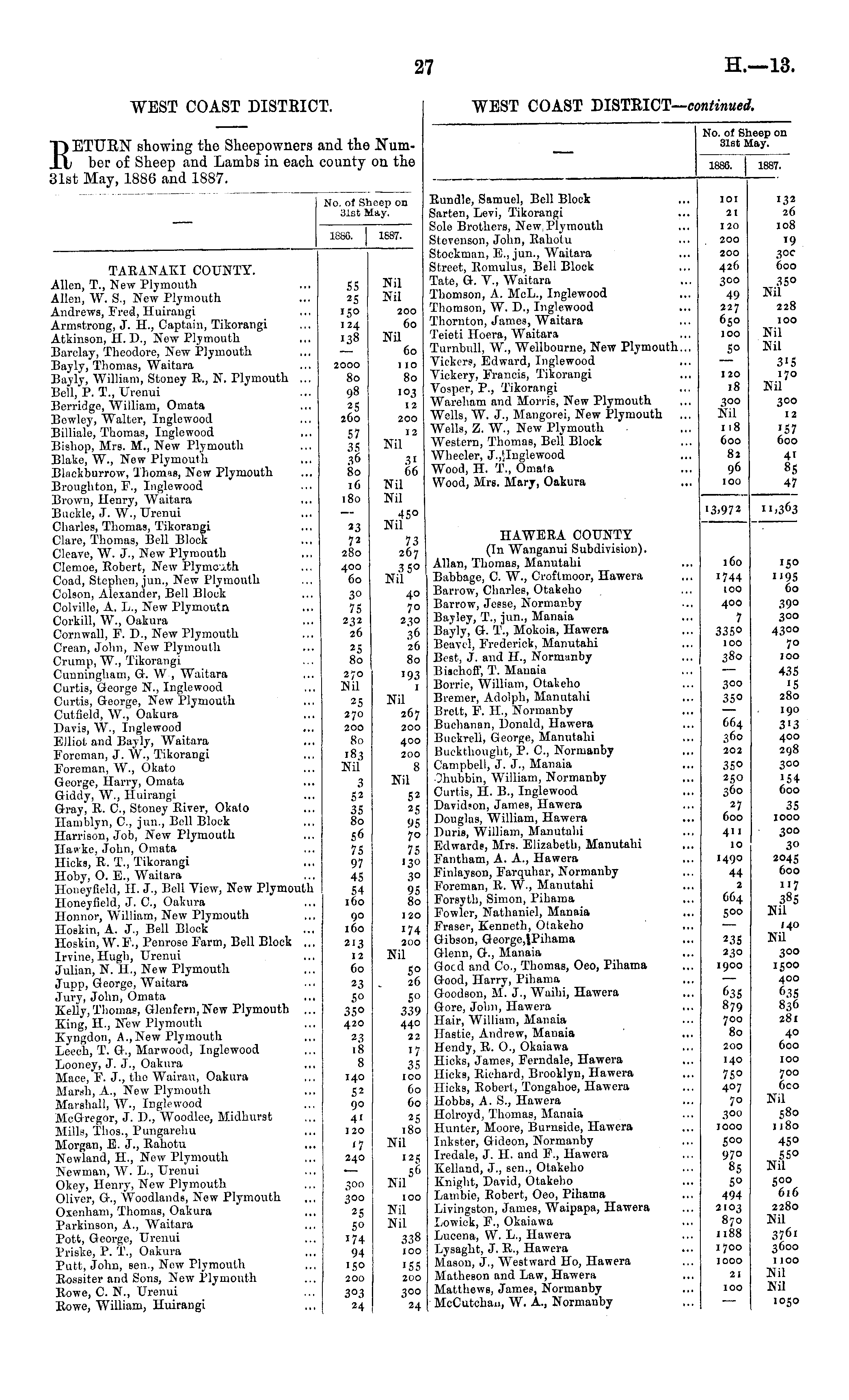 WEST COAST DISTRICT. RETURN showing the Sheepowners and the Number of Sheep and Lambs in each county on the 31st May, 1886 and 1887.