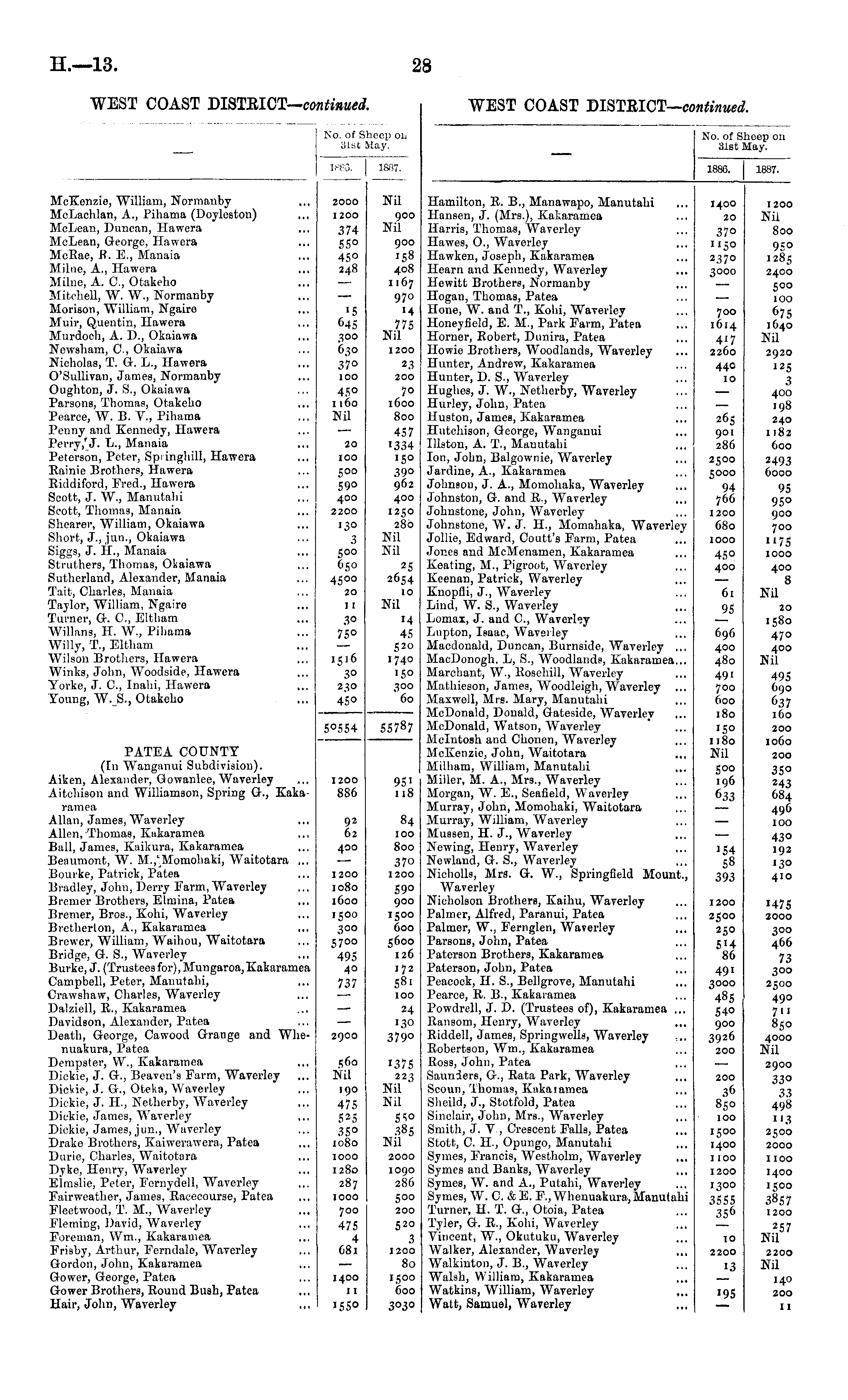 No. of Sheep 01. 31st May. :.-■■ ;. 1887. McKenzie, William, Normanby McLachlan, A., Pihama (Doylestou) McLean, Duncan, Hawera McLean, George, Hawera McRae, R. E., Manaia Milne, A., Hawera Milne, A. O, Otakeho Mitchell, W. W., Normanby Morison, William, Ngaire Muir, Quentin, Hawera Murdoch, A. D., Okaiawa Newsham, C, Okaiawa Nicholas, T. G. L., Hawera O'Sullivan, James, Normanby Oughton, J. S., Okaiawa Parsons, Thomas, Otakeho Pearce, W. B. V., Pihama Penny and Kennedy, Hawera Perry,'J. L., Manaia Peterson, Peter, Spdnghill, Hawera Rainie Brothers, Hawera Riddiford, Fred., Hawera Scott, J. W., Manutahi Scott, Thomas, Manaia Shearer, William, Okaiawa Short, J., jun., Okaiawa Siggs, J. IT., Manaia Struthers, Thomas, Okaiawa Sutherland, Alexander, Manaia Tait, Charles, Manaia Taylor, William, Ngaire Turner, G. C, Eltham AVillans, II. AV., Pihama Willy, T., Eltham AVilson Brothers, Hawera Winks, John, AA Toodside, Hawera Yorke, J. C, Inahi, Hawera Young, W.S., Otakeho 2000 1200 Nil 374 55° 45° 248 900 Nil 900 158 408 1167 970 '4 '5 645 300 630 37° 100 4.50 1160 Nil 775 Nil 1200 23 200 7o 1600 800 457 '334 150 390 962 400 1250 280 Nil Nil 20 100 500 590 400 2200 '30 3 500 650 4500 20 11 30 75° 1516 30 230 45° 25 2654 10 Nil 14 45 520 1740 150 300 '60 PATEA COUNTY (In AYanganui Subdivision). Aiken, Alexander, Gowanlee, AVaverley Aitchison and Williamson, Spring Or., Kakaramea Allan, James, Waverley Allen, Thomas, Kakaramea Ball, James, Kaikura, Kakaramea Beaumont, AV. M.^Momohaki, W Taitotara ... Bourke, Patrick, Patea Bradley, John, Dcrry Farm, AVaverley Bremer Brothers, Elmina, Patea Bremer, Bros., Kohi, Waverley Bretherlon, A., Kakaramea Brewer, William, Waihou, Waitotara Bridge, G. S., AVaverley Burke, J. (Trustees for), Muugaroa, Kakaramea Campbell, Peter, Manutahi, Crawshaw, Charles, Waverley Dalziell, R., Kakaramea Davidson, Alexander, Patea Death, George, Cawood Grange and Whenuakura, Patea Dempster, VV., Kakaramea Dickie, J. G., Beavcn's Farm, Waverley Dickie, J. G., Oteka, AVaverley Dickie, J. H, Netherby, AVaverley Dickie, James, Waverley Dickie, James, jun., AVaverley Drake Brothers, Kaiwerawera, Patea Durie, Charles, Waitotara Dyke, Henry, Waverley Elmslie, Peter, Fornydell, Waverley Fairweather, James, Racecourse, Patea Fleetwood, T. M., AVaverley Fleming, David, Waverley Foreman, Wm., Kakaramea Frisby, Arthur, Ferndale, Waverley Gordon, John, Kakaramea Gowcr, George, Patea Gower Brothers, Round Bush, Patea Hair, John, Waverley 50554 55787 1200 886 95' u8 92 62 84 400 IOO 800 370 1200 1200 1080 1600 1500 300 5700 495 40 737 590 9OO ISOO 60O 560O 126 I 72 58l IOO 24 130 3790 2900 560 Nil 190 475 525 350 1080 1000 1280 287 IOOO 700 475 4 681 1375 223 Nil Nil S^o 385 Nil 2000 1090 286 500 200 520 3 5 1200 80 1400 11 1550 1500 600 3030