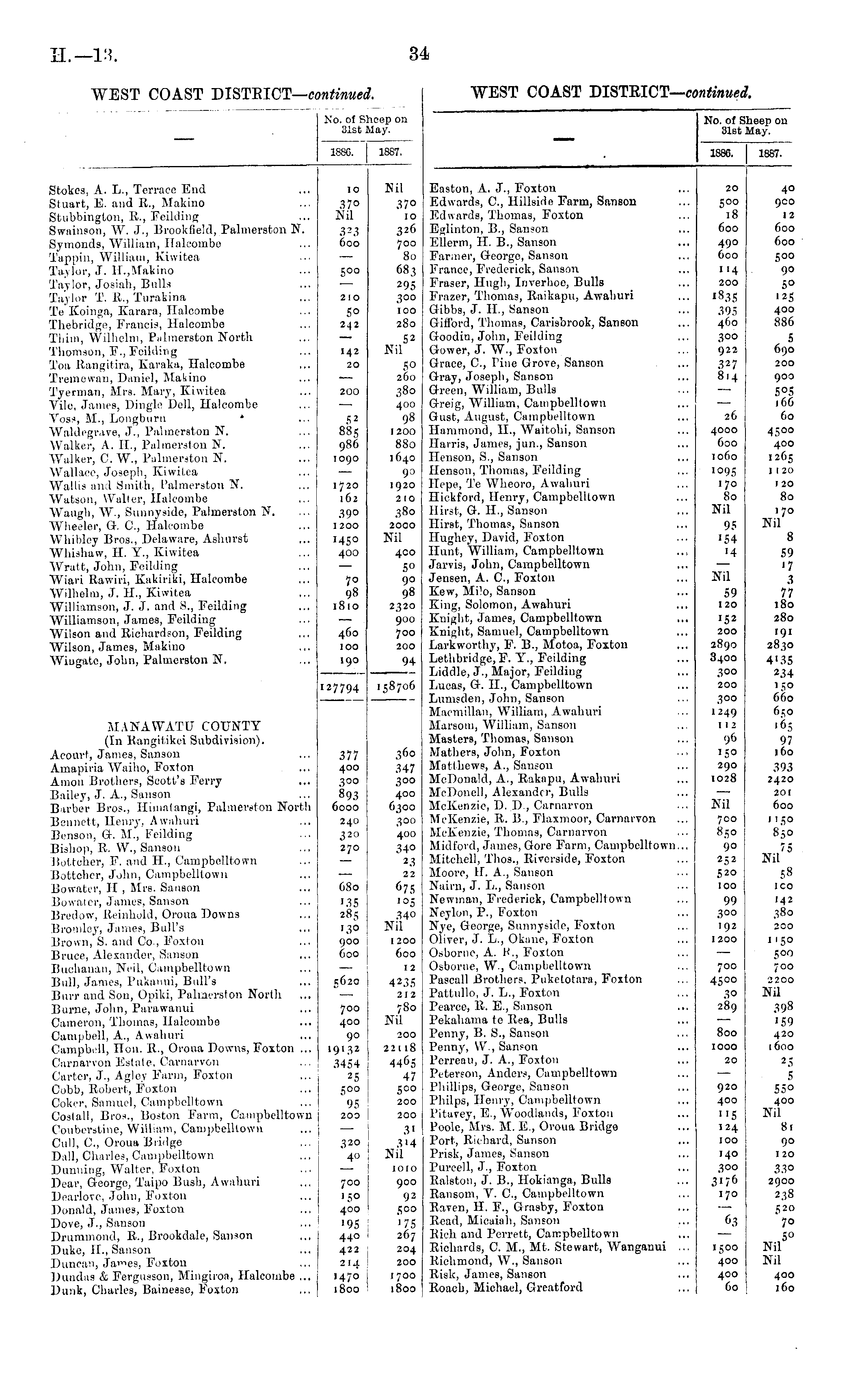 No. of Sheep on 31st May. 1886. I 1887. Stokes, A. L., Terrace End Stuart, E. and It., Alakino Stubbington, It., Feilding Swainson, AV. J., Brookfield, Palmerston N. Symonds, William, Halcombe Tappin, William, Kiwitea Taylor, J. II.,Alakino Taylor, Josiah, Bulls Taylor T. It., Turakina Te Koinga, Karara, Halcombe Thebridge, Francis, Halcombe Thim, Wilhelm, Palmerston North Thomson, P., Feilding Ton Rangitira, Karaka, Halcombe Trcmewan, Daniel, Alakino Tyerman, Airs. Alary, Kiwitea Vile, James, Dingle Dell, Halcombe A ross, AL, Longburn AValdcgrave, J., Palmerston N. Walker, A. IT., Palmerston N. AA Talker, C. W., Palmerston N. Wallace, Joseph, Kiwitea AVallis and Smith, Palmerston N. AVatson, Walter, Halcombe AVaugh, AA~., Sunnyside, Palmerston N. Wheeler, G. C, Halcombe Whibley Bros., Delaware, Ashurst AVhishaw, H. Y., Kiwitea AVratt, John, Feilding Wiari Itawiri. Kakiriki, Halcombe AVilhelm, J. H., Kiwitea Williamson, J. J. and S., Feilding Williamson, James, Feilding Wilson and Richardson, Feilding Wilson, James, Makino Wiugate, John, Palmerston N. 10 37o Nil Nil 3 23 600 500 37° 10 326 700 80 683 295 300 100 280 52 Nil 210 50 242 142 20 50 260 380 400 98 1200 880 1640 90 1920 210 380 2000 Nil 400 5° 9° 98 2320 900 700 200 200 52 885 986 1090 1720 162 390 1200 '45° 400 7o 98 1810 460 100 190 127794 94 158706 AIANAWATU COUNTY (In Rangifikei Subdivision). Acourt, James, Sanson Amapiria AVaiho, Foxton Anion Brothers, Scott's Ferry Bailey, J. A., Sanson Barber Bros., Hiinatangi, Palmerston North Bennett, Henry, Awahuri Benson, G. AL, Feilding Bishop, R. W., Sanson Boftcher, F. and II., Campbelltown Bottchcr, John, Campbelltown Bowater, II, Airs. Sanson Bowater, James, Sanson Bredow, Reinhold, Oroua Downs Bromley, James, Bull's Brown, S. and Co., Foxton Bruce, Alexander, Sanson Buchanan, Neil, Campbelltown Bull, James, Pukanui, Bull's Burr and Son, Opiki, Palmerston North Burne, John, Parawanui Cameron, Thomas, Ilaleombo Campbell, A., Awahuri Campbell, Hon. It., Oroua Downs, Foxton ... Carnarvon Estate, Carnarvon Carter, J., Agley Farm, Foxton Cobb, Robert, Foxton Coker, Samuel, Campbelltown Coslall, Bros., Boston Farm, Campbelltown Couberstine, William, Campbelltown Cull, C, Oroua Bridge Dall, Charles, Campbelltown Dunning, AValter, Foxton Dear, George, Taipo Bush, Awahuri Dearlove, John, Foxton Donald, James, Foxton Dove, J., Sanson Drummond, It., Brookdale, Sanson Duke, II., Sanson Duncan, James, Foxton Dundas & Fergusson, Atingiroa, Halcombe ... Dunk, Charles, Bainesse, Foxton 377 400 300 893 6ooo 240 320 270 680 '35 285 130 900 600 5620 360 347 3°o 400 6300 300 400 34° 2.3 22 675 105 340 Nil 1200 600 12 4255 212 780 Nil 700 400 9° 19132 3454 25 500 95 200 200 22118 4465 47 500 200 320 200 3' 3'4 Nil 40 700 '5° 400 "95 440 422 214 1470 1800 1010 900 92 500 '75 267 204 200 1700 1800