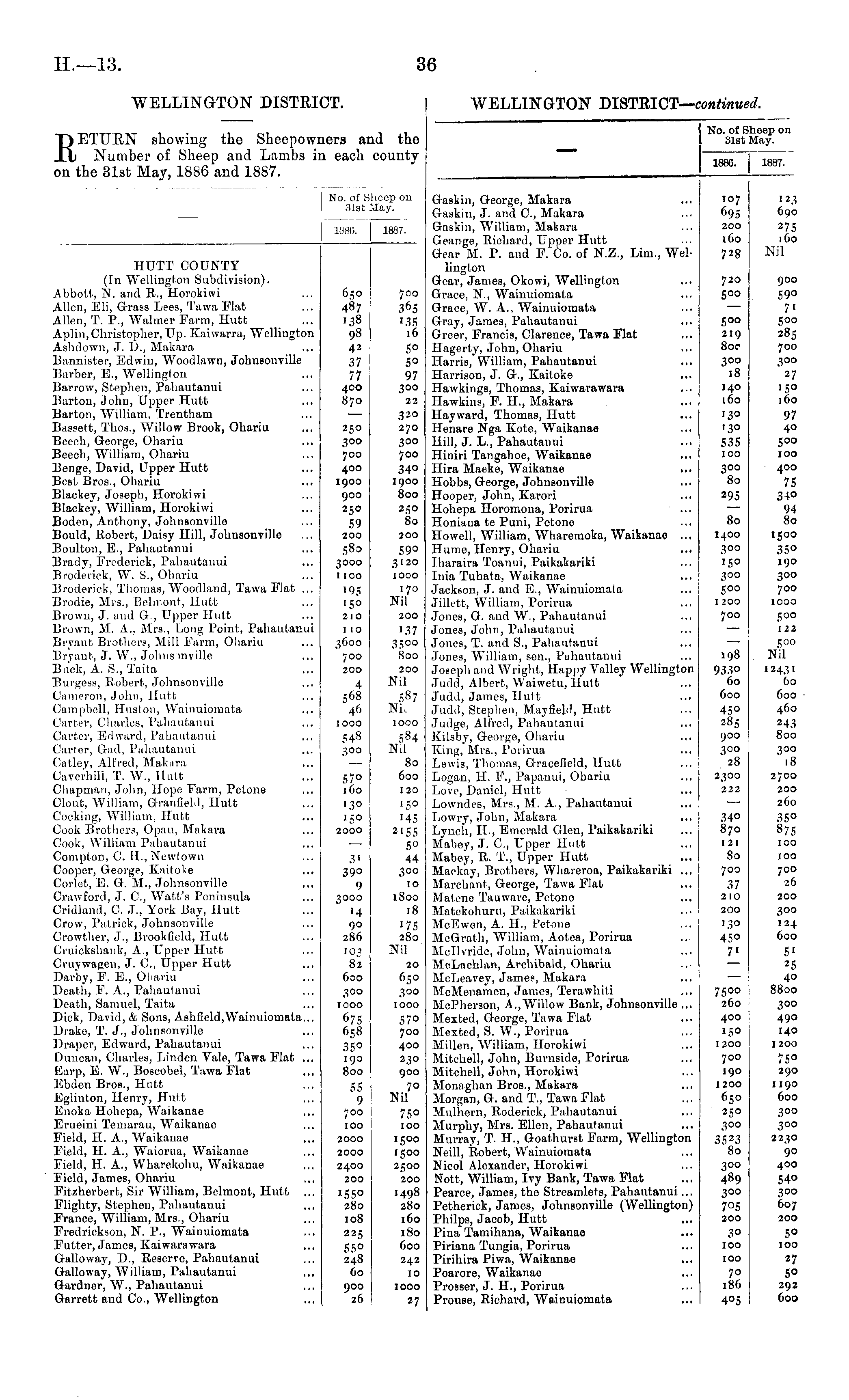 WELLINGTON DISTRICT. RETURN showing the Sheepowners and the Number of Sheep and Lambs in each county on the 31st May, 1886 and 1887.