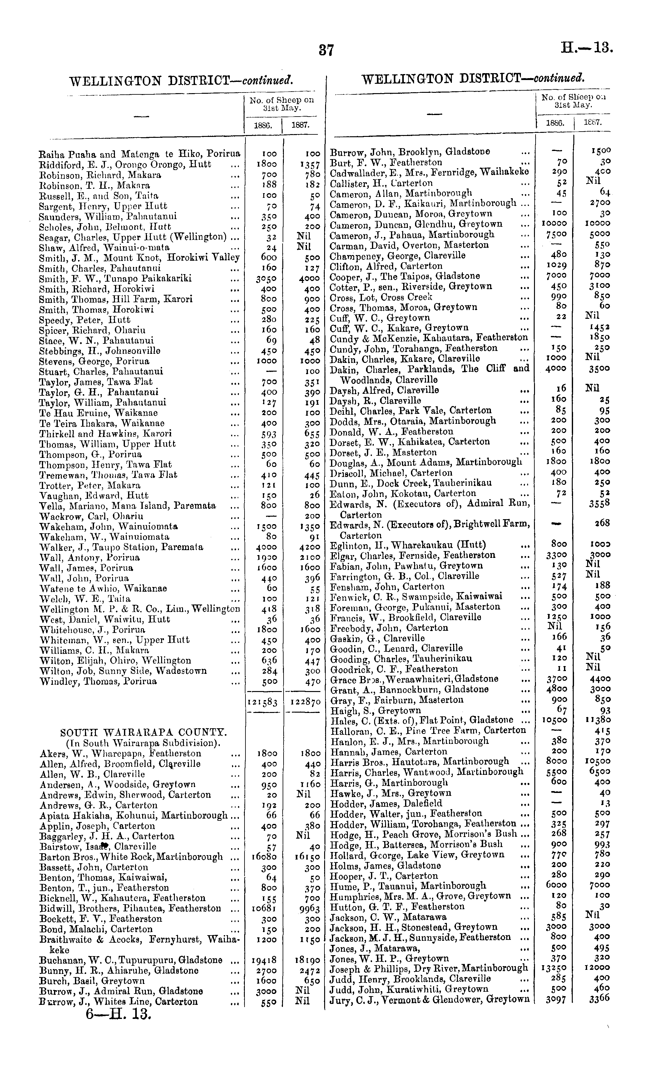 No. of SI 31stl 1886. I icep on May. 1887. Etaiha Puaha and Alalenga te Hiko, Porirua Riddiford, E. J., Orongo Orongo, Hutt Robinson, Richard, Alakara Robinson, T. H., Makara Russell, E., and Son, Taita ■Sargent, Henry, Upper Hutt Saunders, William, Pahautanui Scholes, John, Belmont, Hutt Seagar, Charles, Upper Hutt (Wellington) ... Shaw, Alfred, Wainui-o-mata Smith, J. M., Mount Knot, Horokiwi Valley Smith, Charles, Pahautanui Smith, F. W., Tunapo Paikakariki Smith, Richard, Horokiwi Smith, Thomas, Hill Farm, Karori Smith, Thomas, Horokiwi Speedy, Peter, Hutt Spicer, Richard, Ohariu Stace, W. N., Pahautanui Stebbings, IL, Johnsonville Stevens, George, Porirua Stuart, Charles, Pahautanui raylor, James, Tawa Flat ray lor, G. H., Pahautanui raylor, William, Pahautanui To Hau Eruine, Waikanae Te Teira Ihakara, Waikanae riiirkell and Hawkins, Karori riiomas, AVilliam, Upper Hutt Thompson, G., Porirua rhompson, Henry, Tawa Flat I'remewan, Tliomas, Tawa Flat Trotter, Peter, Alakara Vaughan, Edward, Hutt Vella, Mariano, Atana Island, Paremata Wackrow, Carl, Ohariu Wakeham, John, AVainuiomata Wakeham, AV., Wainuiomata Walker, J., Taupo Station, Paremata Wall, Antony, Porirua Wall, James, Porirua Wall, John, Porirua Watene te Awhio, AVaikanae Welch, AV. E, Taita Wellington AI. P. & R. Co., Lini., Wellington West, Daniel, Waiwitu, Hutt Whitehouse, J., Porirua Whiteman, AV., sen., Upper Hutt Williams, C. II., Alakara Wilton, Elijah, Ohiro, Wellington Wilton, Job, Sunny Side, Wadestown Windley, Tliomas, Porirua 100 1800 700 188 IOO 70 350 250 32 24 600 160 3050 400 800 500 280 160 69 450 IOOO 700 400 127 200 400 593 350 500 60 410 121 100 '357 780 182 5° 74 400 200 Nil Nil 500 127 4000 400 900 400 225 160 48 45° IOOO IOO 35' 39° 191 IOO 300 655 320 500 60 445 IOO '5° 800 1500 80 4000 1900 1600 26 800 200 '35° 9' 4200 2 IOO 1600 440 60 396 55 121 100 418 36 1800 3'8 36 1600 45° 200 636 284 500 '21583 400 170 447 300 470 12287' SOUTH WAIRARAPA COUNTY. (In South AVairarapa Subdivision). Akers, W., AVharepapa, Featherston Allen, Alfred, Broomfield, Clarerille Allen, W. B., Clarerille Andersen, A., Woodside, Greytown Andrews, Edwin, Sherwood, Carterton Andrews, G. R., Carterton Apiata Hakiaha, Kohunui, Alartinborough ... Applin, Josepli, Carterton Baggarley, J. H. A., Carterton Bairstow, Isaiff, Clarerille Barton Bros., White Rock,Marlinborough ... Bassett, John, Carterton Benton, Thomas, Kaiwaiwai, Benton, T., jun., Featherston Bicknell, AV., Kahautera, Featherston Bidwill, Brothers, Pihautea, Featherston ... Bockett, F. V., FVatherston Bond, Malachi, Carterton Braithwaito & Acocks, Fernyhurst, Waihakeke Buchanan, W. C, Tupurupuru, Gladstone ... Bunny, H. R., Ahiaruhe, Gladstone Burch, Basil, Greytown Burrow, J., Admiral Run, Gladstone Borrow, J., Whites Line, Carterton 1800 400 200 95o 20 192 66 400 70 57 16080 300 64 800 '55 10681 1801 44' 8: 1 161 Nil 20< 6( 38< Nil 4< 1615c 30! 5< 37< 70c 996. 3°< 20( "S< 300 '50 1200 19418 2700 1600 3000 55° 1819c 247: 65< Nil Nil