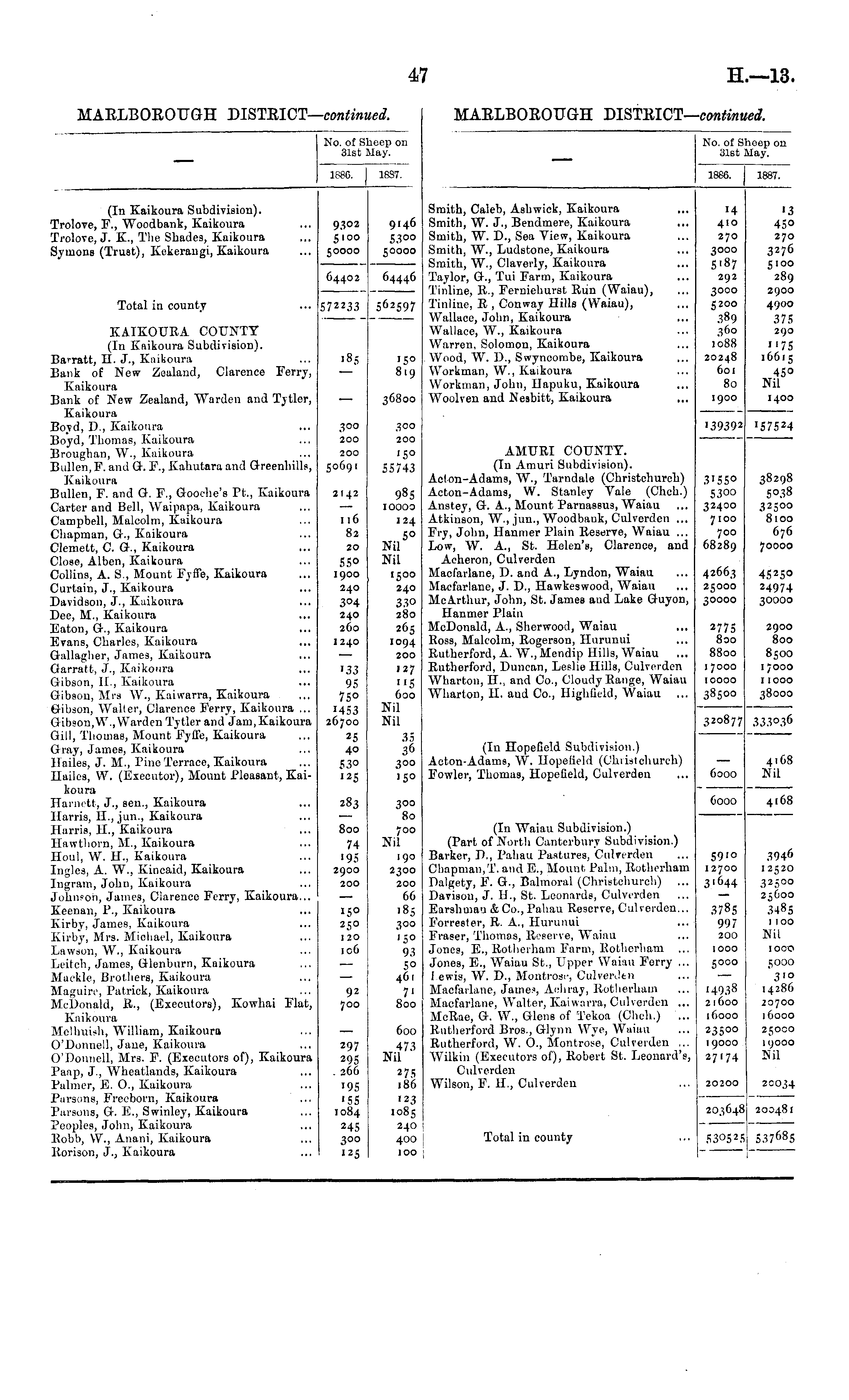 No. of Sheep on 31st May. 1886. 1887. (In Kaikoura Subdivision), rrolove, F., Woodbank, Kaikoura rrolore, J. K., The Shades, Kaikoura Jyinons (Trust), Kekerangi, Kaikoura 93°2 5 100 50000 64402 9146 S3 00 50000 64446 Total in county 572233 562597 KAIKOURA COUNTY (In Kaikoura Subdivision). BaTatt, H. J., Kaikoura Bank of New Zealand, Clarence Ferry, Kaikoura Bank of New Zealand, Warden and Tytler, Kaikoura Boyd, D., Kaikoura Boyd, Thomas, Kaikoura Broughan, W., Kaikoura Bullen.F. and G. P., Kahutaraand Greenhills, Kaikoura Bullen, F. and G. F., Goodie's Pt., Kaikoura Jarter and Bell, Waipapa, Kaikoura Campbell, Malcolm, Kaikoura Chapman, G., Kaikoura 31emett, C. G., Kaikoura 31ose, Alben, Kaikoura Dollins, A. S., Mount Fyfie, Kaikoura Curtain, J., Kaikoura Oavidson, J., Kaikoura 3ee, AL, Kaikoura Eaton, G., Kaikoura Evans, Charles, Kaikoura 3-allagher, James, Kaikoura jlarratt, J., Kaikoura jribson, II., Kaikoura jibson, Airs AV., Kaiwarra, Kaikoura Bribson, Walter, Clarence Ferry, Kaikoura ... jibson.W.,Warden Tytler and Jam, Kaikoura Ml, Thomas, Alount Fyffe, Kaikoura 3 ray, James, Kaikoura Hailes, J. AL, Pine Terrace, Kaikoura Hailes, W. (Executor), Mount Pleasant, Kaikoura Harnett, J., sen., Kaikoura Harris, II., jun., Kaikoura Harris, H., Kaikoura Hawthorn, AL, Kaikoura Houl, W. H., Kaikoura Ingles, A. W., Kincaid, Kaikoura Ingram, John, Kaikoura lohmoh, James, Clarence Ferry, Kaikoura... Keenan, P., Kaikoura Ivirby, James, Kaikoura Kirby, Airs. Alichael, Kaikoura Lawson, AV., Kaikoura Leitch, James, Glenburn, Kaikoura Mackle, Brothers, Kaikoura ilaguire, Patrick, Kaikoura VlcDonald, R., (Executors), Kowhai Flat, Kaikoura Melhui-di, William, Kaikoura O'Doimell, Jane, Kaikoura O'Donnell, Airs. F. (Executors of), Kaikoura Paap, J., Wheatlands, Kaikoura Palmer, E. O., Kaikoura Parsons, Freeborn, Kaikoura Parsons, G. E., Swinley, Kaikoura Peoples, John, Kaikoura Itobb, VV., Anani, Kaikoura Itorison, J., Kaikoura '85 300 200 200 50691 2142 116 82 20 55° 1900 240 304 240 260 1240 '33 95 7SO '453 26700 25 40 53° '25 '5° 819 36800 300 200 '5° 55743 985 1 oooo 124 5° Nil Nil 1500 240 330 280 265 1094 200 127 "5 600 Nil Nil 35 36 300 '5° 283 800 74 '95 2900 200 300 '80 700 Nil IS 0 250 120 106 190 2300 200 66 '85 300 '5° 93 SO 461 7' 800 92 700 297 295 . 266 '95 '55 1084 245 300 '25 600 473 Nil 2 75 186 123 1085 240 400 100