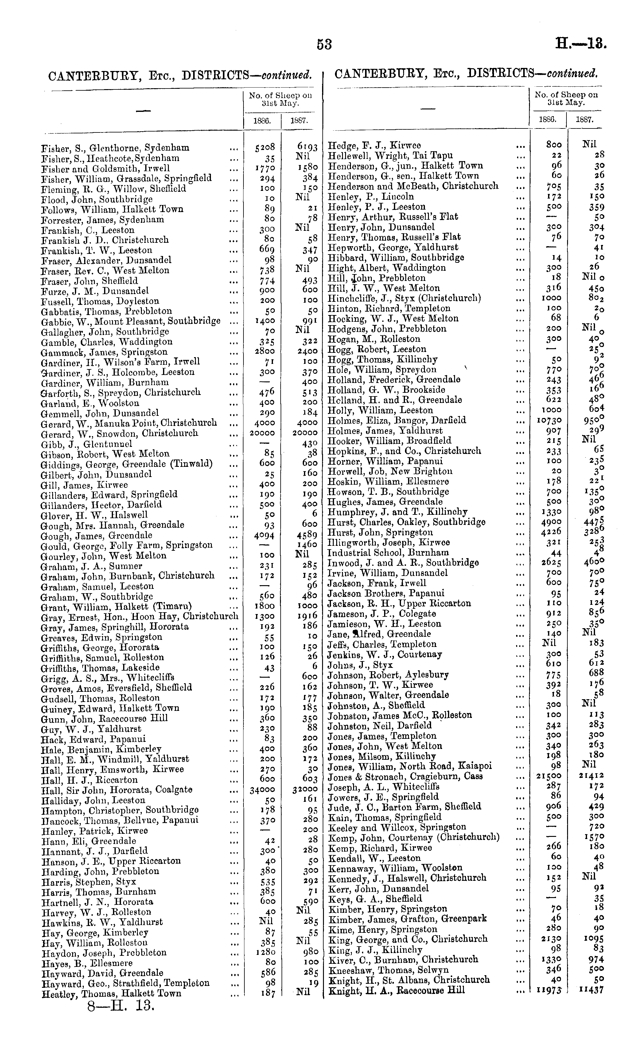 No. of s: 31st; bee;, on Hay. 1886. 1887. Fisher, S., Glenthorne, Sydenham Fisher, S., Heathcote, Sydenham Fisher and Goldsmith, Irwell Fisher, William, Grassdale, Springfield Fleming, R. G., Willow, Sheffield Flood, John, Southbridge Follows, William, Halkett Town Forrester, James, Sydenham Frankish, O, Leeston Frankish J. D., Christchurch Frankish, T. AV., Leeston Fraser, Alexander, Dunsandel Fraser, Rer. C, West Alelton Fraser, John, Sheffield Furze, J. AL, Dunsandel Fussell, Thomas, Doyleston Sabbatis, Thomas, Prebbleton Gabbie, AV., Mount Pleasant, Southbridge ... Gallagher, John, Southbridge Gamble, Charles, Waddington 3 ammack, James, Springston Gardiner, IL, Wilson's Farm, Irwell Gardiner, J. S., Holcombe, Leeston Gardiner, AVilliam, Burnham Srarfortb, S., Spreydon, Christchurch Garland, E., AVoolston Gemmell, John, Dunsandel Gerard,AV., AlanukaPoint, Christchurch ... Gerard, AV., Snowdon, Christchurch Gibb, J., Glentunuel Gibson, Robert, West Alelton biddings, George, Greendale (Tinwald) Gilbert, John, Dunsandel Gill, James, Kirwee Gillanders, Edward, Springfield Gillanders, Hector, Darfield Glover, H. W., Halswell Gough, Airs. Hannah, Greendale Gough, James, Greendale Gould, George, Folly Farm, Springston Gourley, John, West Alelton Graham, J. A., Sumner 3raham, John, Burnbank, Christchurch Graham, Samuel, Leeston Graham, AV., Southbridge Grant, William, Halkett (Timaru) Gray, Ernest, Hon., Hoon Hay, Christchurch Gray, James, Springhill, Hororata Greares, Edwin, Springston Griffiths, George, Hororata Griffiths, Samuel, Rolleston Griffiths, Thomas, Lakeside Grigg, A. S., Airs., Whitecliffs Grores, Amos, Eversfield, Sheffield Gudsell, Thomas, Rolleston Guiney, Edward, Halkett Town Gunn, John, Racecourso Hill Guy, W. J., Yaldhurst Hack, Edward, Papanui Hale, Benjamin, Kimberley Hall, E. M., AVindmill, YaldhurBt Hall, Henry, Emsworth, Kirwee Hall, H. J., Riccarton Hall, Sir John, Hororata, Coalgate Halliday, John, Leeston Hampton, Christopher, Southbridgo Hancock, Thomas, Bellvue, Papanui Ilanley, Patrick, Kirweo Ilann, Eli, Greendale Ilannant, J. J., Darfield Hanson, J. E., Upper Riccarton Harding, John, Prebbleton Harris, Stephen, Styx Harris, Thomas, Burnham Hartnell, J. N., Hororata Harvey, W. J-, Rolleston Hawkins, R. AV., Yaldhurst Hay, George, Kimberley Hay, William, Rolleston Ha'ydon, Joseph, Prebbleton Hayes, B., Ellesmere Hay ward, David, Greendale Hayward, Goo., Strathfield, Templeton Heatley, Thomas, Halkett Town 5208 6193 Nil 1580 384 150 Nil 35 1770 294 I CO 10 89 80 300 '80 669 98 738 774 900 200 50 1400 70 325 2800 7' 300 21 78 Nil 58 347 90 Nil 493 600 100 5° 991 Nil 322 2400 IOO 476 400 290 4000 20000 370 400 S>3 200 184 4000 20000 85 600 25 400 190 500 50 93 4094 100 231 172 560 1800 1300 192 55 100 126 43 226 172 190 360 2^0 83 400 200 270 600 43° 38 600 160 200 190 400 6 600 4589 1460 Nil 285 152 96 480 IOOO 1916 186 10 '50 26 6 600 162 '77 185 35° 88 200 360 172 30 603 32000 161 95 280 3400O 50 178 370 42 300' 40 380 535 38s 600 40 Nil 87 38.5 1280 80 586 98 187 200 28 280 5o 3°o 292 7' 590 Nil 285 55 Nil 980 100 285 '9 Nil