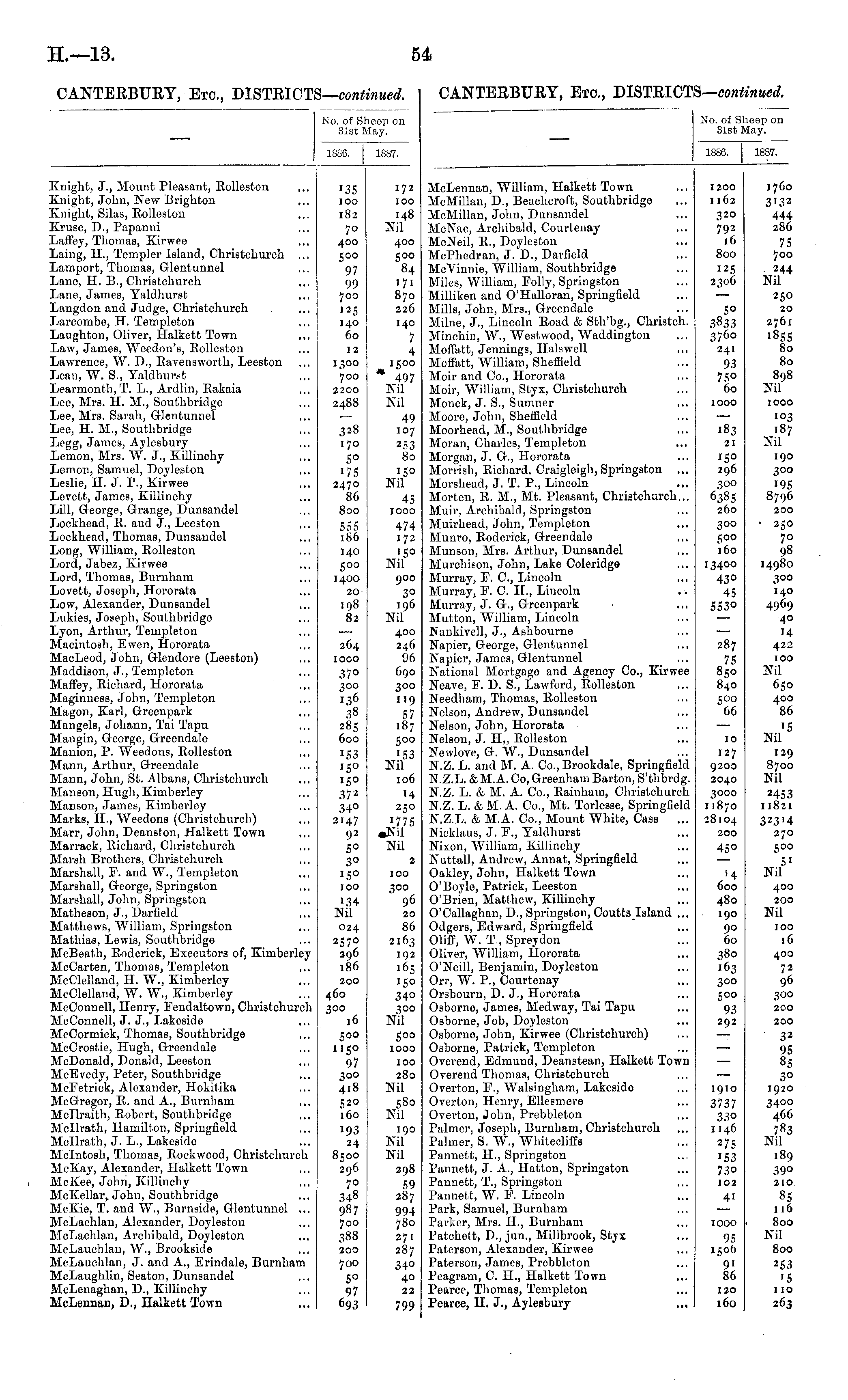 No. of Sheep on 31st May. 18S6. 1887. Cnight, J., Alount Pleasant, Rolleston Cnight, John, New Brighton Cnight, Silas, Rolleston Cruse, D., Papanui Jaffey, Thomas, Kirwee jaing, IL, Templer Island, Christchurch ... jamport, Thomas, Glentunnel jane, H. B., Christchurch jane, James, Yaldhurst jangdon and Judge, Christchurch jarcombe, H. Templeton jaughton, Oliver, Halkett Town Jaw, James, AVeedon's, Rolleston Jawrence, AV. D., Rayensworth, Leeston jean, W. S., Yaldhurst jearmonth,T. L., Ardlin, Rakaia jee, Mrs. 11. M., Southbridge Jee, Mrs. Sarah, Glentunnel Jee, H. AL, Southbridge JCgg, James, Aylesbury jemon, Airs. W. J., Killinchy jemon, Samuel, Doyleston jeslie, H. J. P., Kirwee jerett, James, Killinchy Jill, George, Grange, Dunsandel jockhead, R. and J., Leeston Jockhead, Thomas, Dunsandel jong, AVilliam, Rolleston jord, Jabez, Kirwee Jord, Thomas, Burnham joyett, Joseph, Hororata Jow, Alexander, Dunsandel jukies, Joseph, Southbridge jyon, Arthur, Templeton Macintosh, Ewen, Hororata HacLeod, John, Glendore (Jjeoston) tfaddison, J., Templeton Haffey, Richard, Hororata Haginness, John, Templeton tfagon, Karl, Greenpark Hangers, Johann, Tai Tapu tfangin, George, Greendale Hanion, P. AVeedons, Rolleston Hann, Arthur, Greendale Hann, John, St. Albans, Christchurch Hanson, Hugh, Kimberley Hanson, James, Kimberley Harks, II., AVeedons (Christchurch) Harr, John, Deanston, Halkett Town Harrack, Richard, Christchurch Harsh Brothers, Christchurch Marshall, F. and AV., Templeton Harshall, George, Springston Harsball, John, SpringBton Hatheson, J., Darfield Matthews, William, Springston Mathias, Lewis, Southbridge McBeath, Roderick, Executors of, Kimberley HcCarten, Thomas, Templeton HcClelland, H. W., Kimberley HeClelland, W. W., Kimberley HcConnell, Henry, Fendaltown, Christchurch HcConnell, J. J., Lakeside HcCormick, Thomas, Southbridge HcCrostie, Hugh, Greendale HcDonald, Donald, Leeston HcEvedy, Peter, Southbridge McFetriek, Alexander, Hokitika McGregor, B. and A., Burnham Hcllraith, Robert, Southbridge Hcllrath, Hamilton, Springfield Mcllrath, J. L., Lakeside Mcintosh, Thomas, Rockwood, Christchurch McKay, Alexander, Halkett Town McKee, John, Killinchy McKellar, John, Southbridge HcKie, T. and AV., Burnside, Glentunnel ... McLachlan, Alexander, Doyleston HcLachlan, Archibald, Doyleston HcLauchlan, W., Brookside HcLauchlan, J. and A., Erindale, Burnham HcLaughlin, Seaton, Dunsandel McLenaghan, D., Killinchy HcLennan, D., Halkett Town '35 100 182 7o 400 500 97 99 700 125 140 60 12 1300 700 2200 2488 328 170 50 '75 2470 86 800 555 186 140 500 1400 20 198 82 264 IOOO 370 300 136 38 285 600 153 '5° '5° 372 34° 2147 92 5° 3° 150 IOO 134 Nil 172 IOO 148 Nil 400 500 84 171 870 226 140 7 4 1500 497 Nil Nil 49 107 253 80 '5° Nil 45 IOOO 474 172 150 Nil 900 30 196 Nil 400 246 96 690 300 119 57 187 500 '53 Nil 106 '4 250 '775 •Nil Nil 2 024 2570 296 186 200 460 300 IOO 500 96 20 86 2163 192 165 '50 340 300 Nil 500 IOOO 16 500 1150 97 300 418 520 160 '93 24 8500 296 7° 348 987 700 388 200 700 5° 97 693 IOO 280 Nil 580 Nil 190 Nil Nil 298 59 287 994 780 271 287 34o 40 22 799