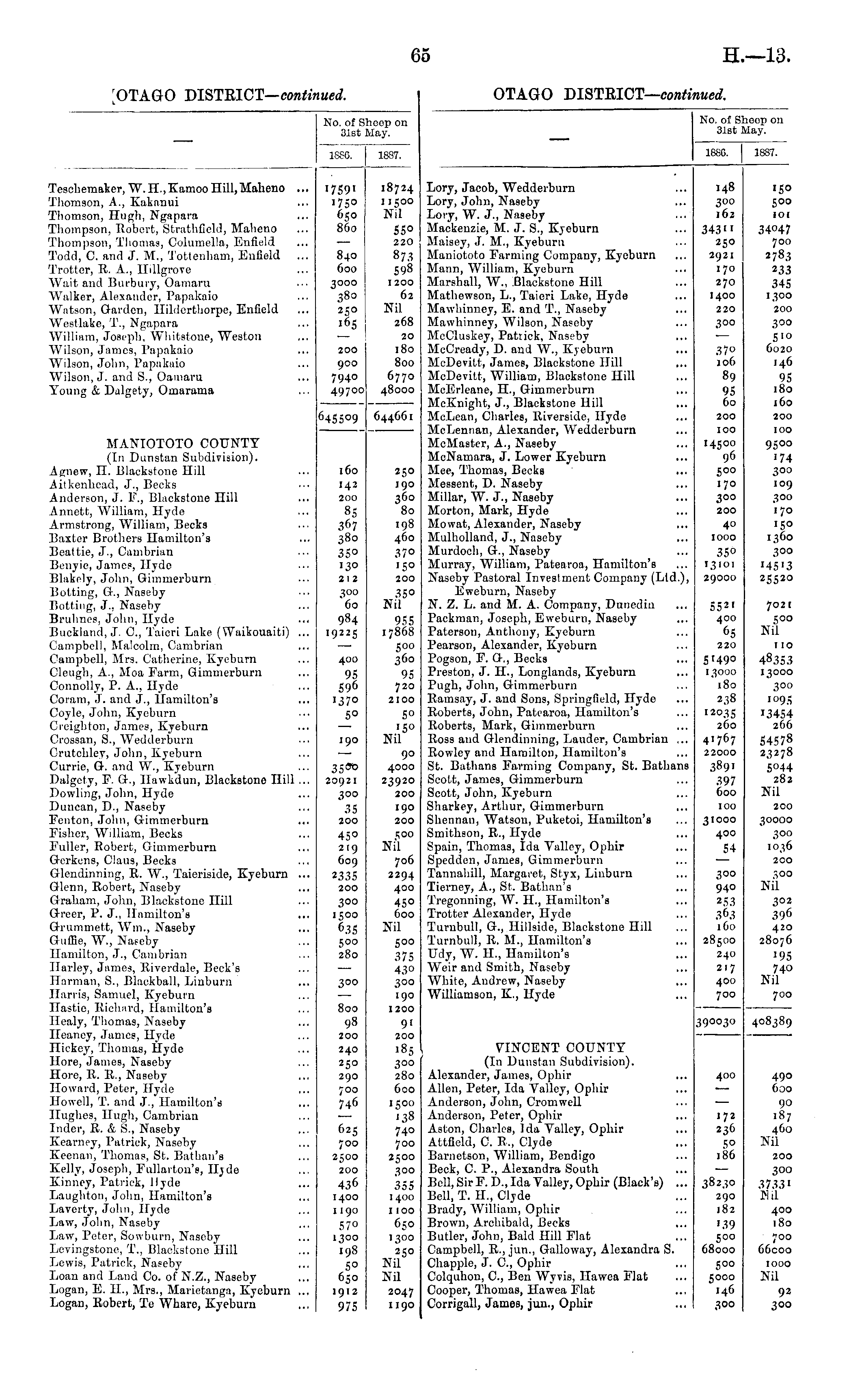 No. of fihoop on 31st May. 1S80. ) 1887. Teschemaker, W.H.,Kamoo Hill,Maheno ... Thomson, A., Kakanui Thomson, Hugh, Ngapara Thompson, Robert, Strathfield, Maheno Thompson, Thomas, Columella, Enfield Todd, C. and J. M., Tottenham, Enfield ... Trotter, R. A., Ilillgrorc AVait and Burbury, Oamaru AValker, Alexander, Papakaio AVatson, Garden, Hilderthorpe, Enfield AVestlake, T., Ngapara William, Joseph, Whitstone, Weston AA'ilson, James, Papakaio Wilson, John, Papakaio Wilson, J. and S., Oamaru Young & Dalgety, Omarama ■759' '75o 650 86o 18724 11500 Nil 550 220 873 598 1200 62 Nil 268 840 600 3000 380 250 l! 5 200 900 7940 49700 20 180 800 6770 48000 A1ANIOTOTO COUNTY (In Dunstan Subdivision). Afjnew, n. Blackstone Hill Aitkenhcad, J., Becks Anderson, J. P., Blackstone Hill Annett, AVilliam, Hyde Armstrong, AVilliam, Becks Baxter Brothers Hamilton's Beattie, J., Cambrian Benyie, James, Hyde Blakely, John, Gimmerburn Bolting, G., Naseby Botting, J., Naseby Bruhnes, John, Hyde Buckland, J. C, Taieri Lake (Waikouaiti) ... Campbell, Alalcolm, Cambrian Campbell, Airs. Catherine, Kyeburn Cleugh, A., Aloa Farm, Gimmerburn Connolly, P. A., Hyde Coram, J. and J., Hamilton's Coyle, John, Kyeburn Creighton, James, Kyeburn Crossan, S., AVedderburn Crutchley, John, Kyeburn Currie, G. and W., Kyeburn Dalgety, F. G., Hawkdun, Blackstone Hill... Dowling, John, Hyde Duncan, D., Naseby Fenton, John, Gimmerburn Fisher, William, Becks Puller, Robert, Gimmerburn Gerkens, Claus, Becks Glendinning, R. AV., Taieriside, Kyeburn ... Glenn, Robert, Naseby Graham, John, Blackstone Hill Greer, P. J., Hamilton's Grummett, Win., Naseby Guffie, W., Naseby Hamilton, J., Cambrian Harley, James, Itirerdale, Beck's narman, S., Blackball, Linburn Harris, Samuel, Kyeburn Hastie, Richard, Hamilton's Healy, Thomas, Naseby Heaney, James, Hyde Hickey, Tliomas, Hyde Hore, James, Naseby Hore, R. R., Naseby Howard, Peter, Hyde Howell, T. and J., Hamilton's Hughes, Hugh, Cambrian Inder, R. & S., Naseby Kearney, Patrick, Naseby Keenan, Tliomas, St. Bathan's Kelly, Joseph, Fullartou's, Hyde Kinney, Patrick, Hyde Laughton, John, Hamilton's Larerty, John, Hyde Law, John, Naseby Law, rcter, Sowhurn, Naseby LevingBtonc, T., Blackstone Hill Lewis, Patrick, Naseby Loan and Laud Co. of N.Z., Naseby Logan, E. IL, Mrs., Marietanga, Kyeburn ... Logan, Robert, To Whare, Kyeburn 645509 644661 160 250 190 360 80 198 460 37° 150 200 350 Nil 142 200 85 367 380 350 130 212 300 60 984 '9225 400 95 596 1370 5° 955 17868 5°o 360 95 720 2100 5° 15° Nil 190 353° 20921 300 35 200 45° 219 609 2335 200 9° 4000 23920 200 300 1500 6.35 500 280 190 200 500 Ni'l 706 2294 400 45° 600 Nil 500 375 430 300 190 1200 9' 200 '85 3°0 280 600 300 800 98 200 240 250 290 700 746 625 700 2500 200 436 1400 1190 57° 1300 198 5° 650 1912 975 I500 '38 740 700 25OO 300 355 1400 1100 650 1300 250 Nil Nil 2047 1190