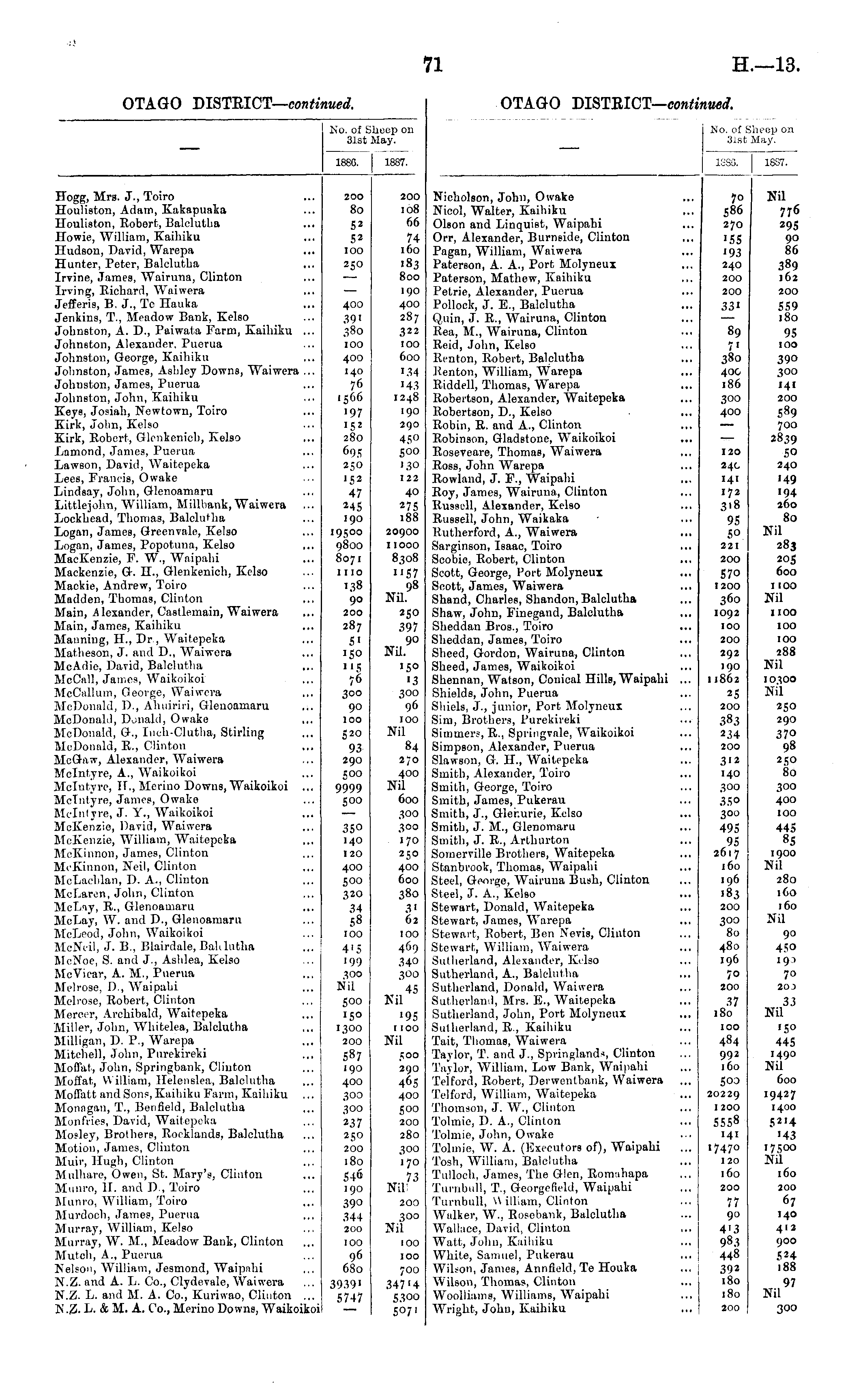 No. of s: 31st I loop on lay. 1887. 1886. I Hogg, Mrs. J., Toiro Houliston, Adam, Kakapuaka Houliston, Robert, Balelutha Howie, AVilliam, Kaihiku Hudson, David, Warepa Hunter, Peter, Balelutha Irvine, James, AVairuna, Clinton Crring, Richard, AAliiwera lefferis, B. J., Te Hauka fenkins, T., Meadow Bank, Kelso lohnston, A. D., Paiwata Farm, Kaihiku ... lohnston, Alexander, Puerua lohnston, George, Kaihiku lohnston, James, Ashley Downs, Waiwera ... lohnston, James, Puerua lohnston, John, Kaihiku Keys, Josiah, Newtown, Toiro Kirk, John, Kelso Krk, Robert, Glenkenich, Kelso uamond, James, Puerua bawson, David, AA'aitepeka Lees, Francis, Owake JindBay, John, Glenoamaru [iittlejohn, William, Millbank, Waiwera jockhead, Thomas, Balelutha Logan, James, Greenrale, Kelso Logan, James, Popotuna, Kelso ilacKenzie, F. W., Waipahi Vlackenzie, G. H., Glenkenich, Kelso Maekie, Andrew, Toiro Madden, Thomas, Clinton Wain, Alexander, Castlemain, Waiwera Main, James, Kaihiku Manning, H, Dr., Waitepeka Matheson, J. and D., AVaiwera WcAdie, Darid, Balelutha McCall, James, Waikoikoi McCallum, George, Waiwera McDonald, D., Ahuiriri, Glenoamaru McDonald, Donald, Owake McDonald, G., Inoh-Clutba, Stirling McDonald, R., Clinton McGaw, Alexander, Waiwera Wclntyre, A., AVaikoikoi Mclntyre, II., Alerino Downs, AVaikoikoi ... Helntyre, James, Owake Mclntyre, J. Y., Waikoikoi McKenzie, Darid, Waiwera McKenzie, William, AA Taitepcka McKinnon, James, Clinton McKinnon, Neil, Clinton McLachlan, D. A., Clinton McLaren, John, Clinton McLay, R., Glenoamaru McLay, W. and D., Glenoamaru McLeod, John, Waikoikoi McNeil, J. B., Blairdale, Bah lutha MeNoe, S. and J., Ashlea, Kelso MeVicar, A. M., Puerua Melrose, D., AVaipahi Melrose, Robert, Clinton Mercer, Archibald, Waitepeka Miller, John, AVhitelea, Balelutha Milligan, D. P., Warepa Mitchell, John, Purekireki Moffat, John, Springbank, Clinton Moffat, William, Helenslea, Balelutha Moffatt and Sons, Kaihiku Farm, Kaihiku Vfonngan, T., Benfield, Balelutha Monfries, David, Waitepeka VIosley, Brothers, Roeklands, Balelutha Motion, James, Clinton Muir, Hugh, Clinton Mulhare, Owen, St. Alary's, Clinton Monro, II. and D , Toiro Munro, AVilliam, Toiro Murdoch, James, Puerua Murray, AVilliam, Kelso Murray, W. AL, Aleadow Bank, Clinton Mutch, A., Puerua S Telson, AVilliam, Jesmond, AVaipahi !I.Z. and A. L. Co., Clyderale, Waiwera S.Z. L. and AL A. Co., Kuriwao, Clinton ... N'.Z. L. & M. A. Co., Merino Downs, AVaikoikoi 200 80 52 52 IOO 250 400 391 380 100 400 140 76 1566 197 152 280 695 250 152 47 245 190 19500 9800 8071 1 no 138 90 200 287 5' '5° "5 76 300 90 100 520 93 290 500 9999 500 200 108 66 74 160 '83 800 190 400 287 322 100 600 '34 143 1248 190 290 450 500 130 122 40 275 188 20900 11000 8308 ii57 98 Nil. 250 397 90 Nil. 150 '3 300 ■96 100 Nil 84 270 400 Nil 600 300 300 170 250 400 600 380 31 62 35° 140 120 400 500 320 34 58 100 4'5 '99 300 Nil 100 469 34° 300 500 'SO 1300 200 587 190 400 300 300 237 250 200 180 540 190 390 344 200 45 Nil '95 1100 Nil 500 290 465 400 500 200 280 300 170 73 Nil 200 300 Nil 100 96 680 100 100 700 347'4 5300 507 1 3939' 5747