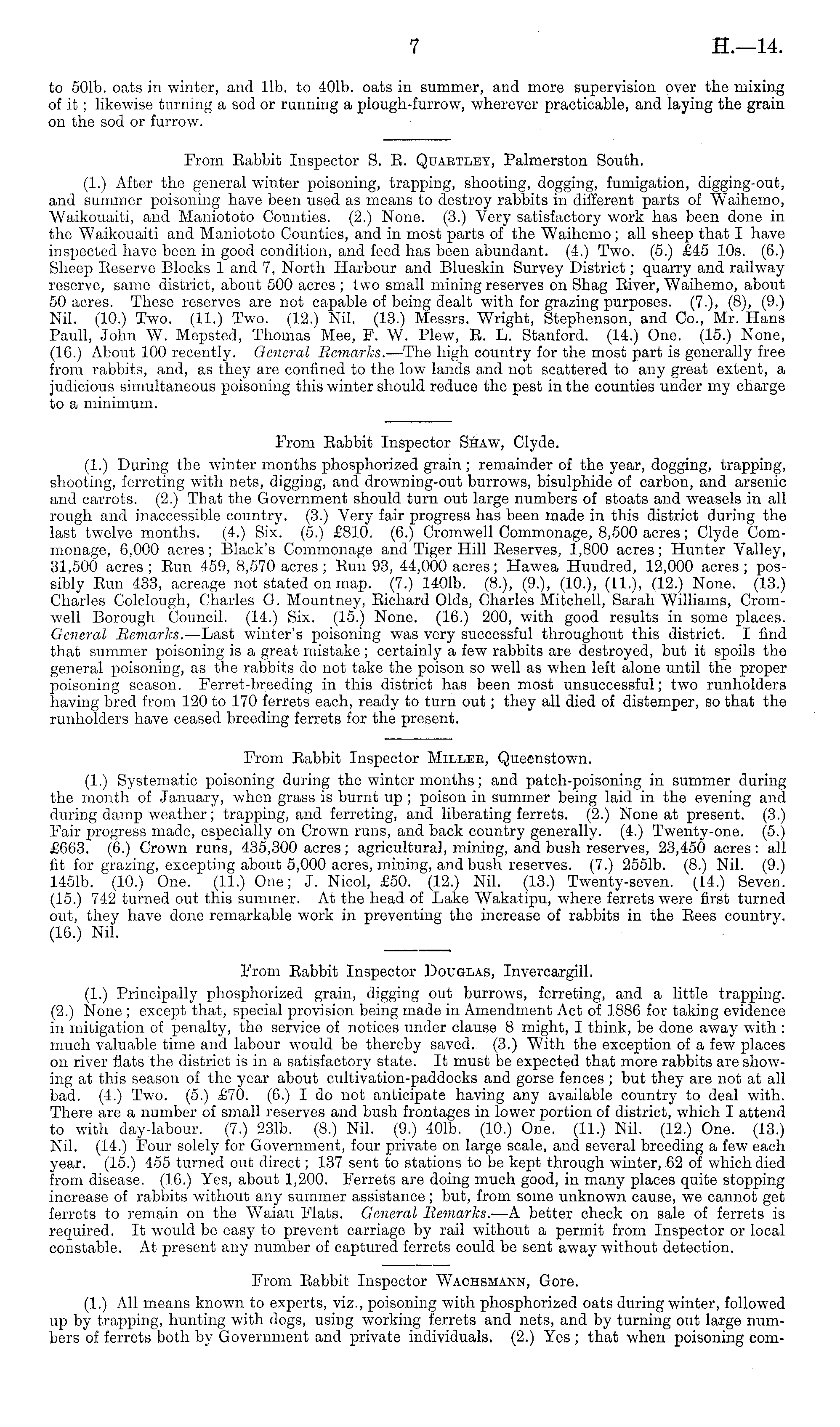 to 501b. oats in winter, and lib. to 401b. oats in summer, and more supervision over the mixing of it; likewise turning a sod or running a plough-furrow, wherever practicable, and laying the grain on the sod or furrow. From Rabbit Inspector S. E. Quaetlet, Palmerston South. (1.) After the general winter poisoning, trapping, shooting, dogging, fumigation, digging-out, and summer poisoning have been used as means to destroy rabbits in different parts of Waihemo, Waikouaiti, and Maniototo Counties. (2.) None. (3.) Very satisfactory work has been done in the Waikouaiti and Maniototo Counties, and in most parts of the Waihemo ; all sheep that I have inspected have been in good condition, and feed has been abundant. (4.) Two. (5.) £45 10s. (6.) Sheep Eeservo Blocks 1 and 7, North Harbour and Blueskin Survey District; quarry and railway reserve, same district, about 500 acres ; two small mining reserves on Shag River, Waihemo, about 50 acres. These reserves are not capable of being dealt with for grazing purposes. (7.), (8), (9.) Nil. (10.) Two. (11.) Two. (12.) Nil. (13.) Messrs. Wright, Stephenson, and Co., Mr. Hans Paull, John W. Mepsted, Thomas Mcc, F. W. Plew, E. L. Stanford. (14.) One. (15.) None, (16.) About 100 recently. General Bemarks.— -The high country for the most part is generally free from rabbits, and, as they are confined to the low lands and not scattered to any great extent, a judicious simultaneous poisoning this winter should reduce the pest in the counties under my charge to a minimum. From Rabbit Inspector Shaw, Clyde. (1.) During the winter months phosphorized grain ; remainder of the year, dogging, trapping, shooting, ferreting with nets, digging, and drowning-out burrows, bisulphide of carbon, and arsenic and carrots. (2.) That the Government should turn out large numbers of stoats and weasels in all rough and inaccessible country. (3.) Very fair progress has been made in this district during the last twelve months. (4.) Six. (5.) £810. (6.) Cromwell Commonage, 8,500 acres; Clyde Commonage, 6,000 acres; Black's Commonage and Tiger Hill Reserves, 1,800 acres; Hunter Valley, 31,500 acres; Run 459, 8,570 acres; Run 93, 44,000 acres; Hawea Hundred, 12,000 acres; possibly Run 433, acreage not stated on map. (7.) 1401b. (8.), (9.), (10.), (11.), (12.) None. (13.) Charles Colclough, Charles G. Mountney, Richard Olds, Charles Mitchell, Sarah Williams, Cromwell Borough Council. (14.) Six. (15.) None. (16.) 200, with good results in some places. General Bemarks. —Last winter's poisoning was very successful throughout this district. I find that summer poisoning is a great mistake; certainly a few rabbits are destroyed, but it spoils the general poisoning, as the rabbits do not take the poison so well as when left alone until the proper poisoning season. Ferret-breeding in this district has been most unsuccessful; two runholders having bred from 120 to 170 ferrets each, ready to turn out; they all died of distemper, so that the runholders have ceased breeding ferrets for the present. From Rabbit Inspector Miller, Queenstown. (1.) Systematic poisoning during the winter months; and patch-poisoning in summer during the month of January, when grass is burnt up ; poison in summer being laid in the evening and during damp weather; trapping, and ferreting, and liberating ferrets. (2.) None at present. (3.) Fair progress made, especially on Crown runs, and back country generally. (4.) Twenty-one. (5.) £663. (6.) Crown runs, 435,300 acres; agricultural, mining, and bush reserves, 23,450 acres: all fit for grazing, excepting about 5,000 acres, mining, and bush reserves. (7.) 2551b. (8.) Nil. (9.) 1451b. (10.) One. (11.) One; J. Nicol, £50. (12.) Nil. (13.) Twenty-seven. (L 4.) Seven. (15.) 742 turned out this summer. At the head of Lake Wakatipu, where ferrets were first turned out, they have done remarkable work in preventing the increase of rabbits in the Rees country. (16.) Nil. From Rabbit Inspector Douglas, Invercargill. (1.) Principally phosphorized grain, digging out burrows, ferreting, and a little trapping. (2.) None ; except that, special provision being made in Amendment Act of 1886 for taking evidence in mitigation of penalty, the service of notices under clause 8 might, I think, be done away with : much valuable time and labour would be thereby saved. (3.) With the exception of a few places on river fiats the district is in a satisfactory state. It must be expected that more rabbits are showing at this season of the year about cultivation-paddocks and gorse fences ; but they are not at all bad. (4.) Two. (5.) £70. (6.) I do not anticipate having any available country to deal with. There are a number of small reserves and bush frontages in lower portion of district, which I attend to with day-labour. (7.) 231b. (8.) Nil. (9.) 401b. (10.) One. (11.) Nil. (12.) One. (13.) Nil. (14.) Four solely for Government, four private on large scale, and several breeding a few each year. (15.) 455 turned out direct; 137 sent to stations to be kept through winter, 62 of which died from disease. (16.) Yes, about 1,200. Ferrets are doing much good, in many places quite stopping increase of rabbits without any summer assistance; but, from some unknown cause, we cannot get ferrets to remain on the Waiau Flats. General Bemarks. —A better check on sale of ferrets is required. It would be easy to prevent carriage by rail without a permit from Inspector or local constable. At present any number of captured ferrets could be sent away without detection. From Rabbit Inspector Waohsmann, Gore. (1.) All means known to experts, viz., poisoning with phosphorized oats during winter, followed up by trapping, hunting with dogs, using working ferrets and nets, and by turning out large numbers of ferrets both by Government and private individuals. (2.) Yes ; that when poisoning com-