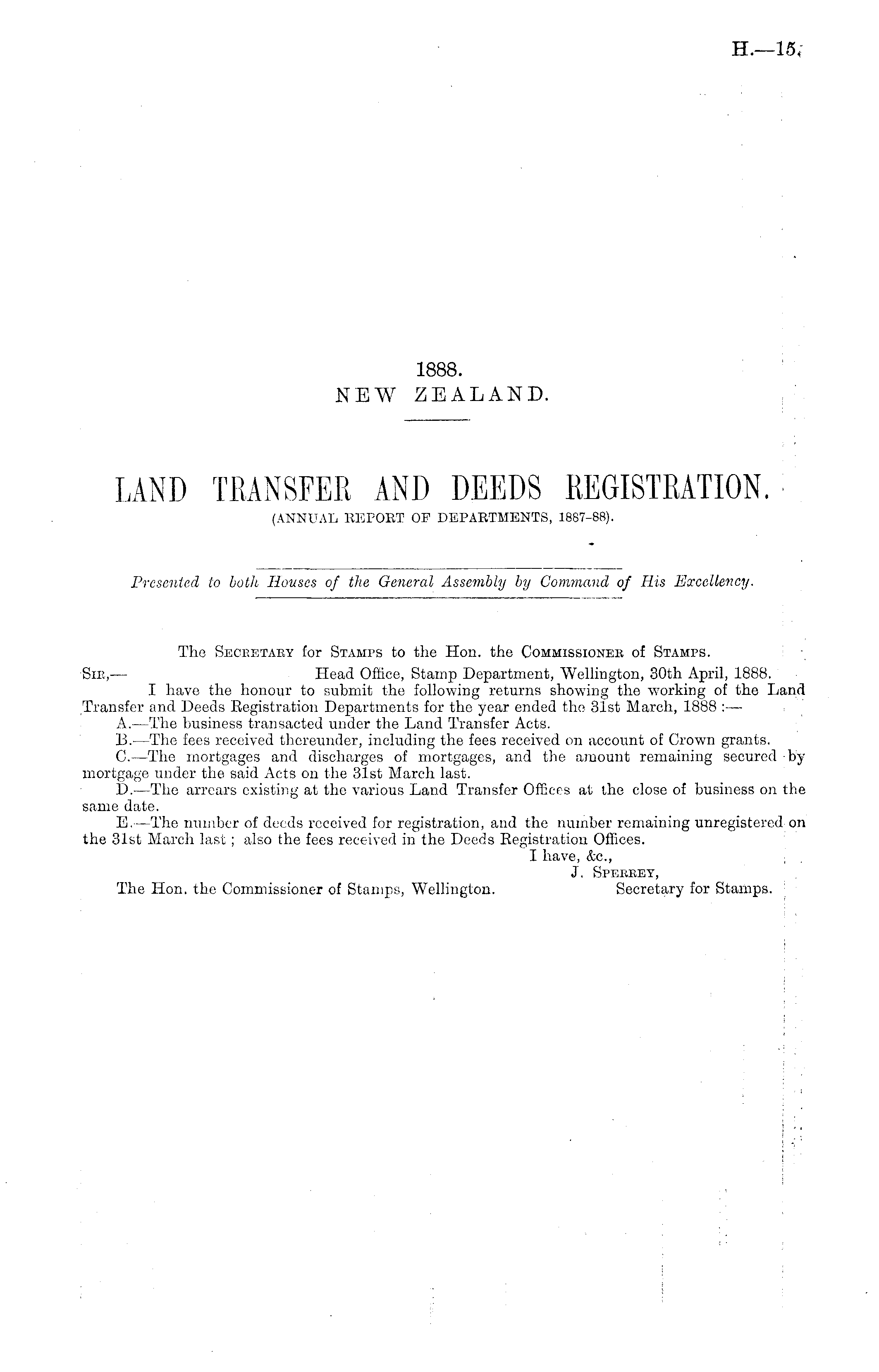 The Secp.etaky for Stamps to the Hon. the Commissionep. of Stamps. Sie, — Head Office, Stamp Department, Wellington, 30th April, 1888. I have the honour to submit the following returns showing the working of the Land Transfer and Deeds Eegistration Departments for the year ended the 31st March, 1888 : — A.—The business transacted under the Land Transfer Acts. B.—The fees received thereunder, including the fees received on account of Crown grants. C. —The mortgages and discharges of mortgages, and the amount remaining secured by mortgage under the said Acts on the 31st March last. D.—The arrears existing at the various Land Transfer Offices at the close of business on the same date. E.—The number of deeds received for registration, and the number remaining unregistered on the 31st March last; also the fees received in the Deeds Eegistration Offices. I have, &c, J. Spebrey, The Hon. the Commissioner of Stamps, Wellington. Secretary for Stamps.