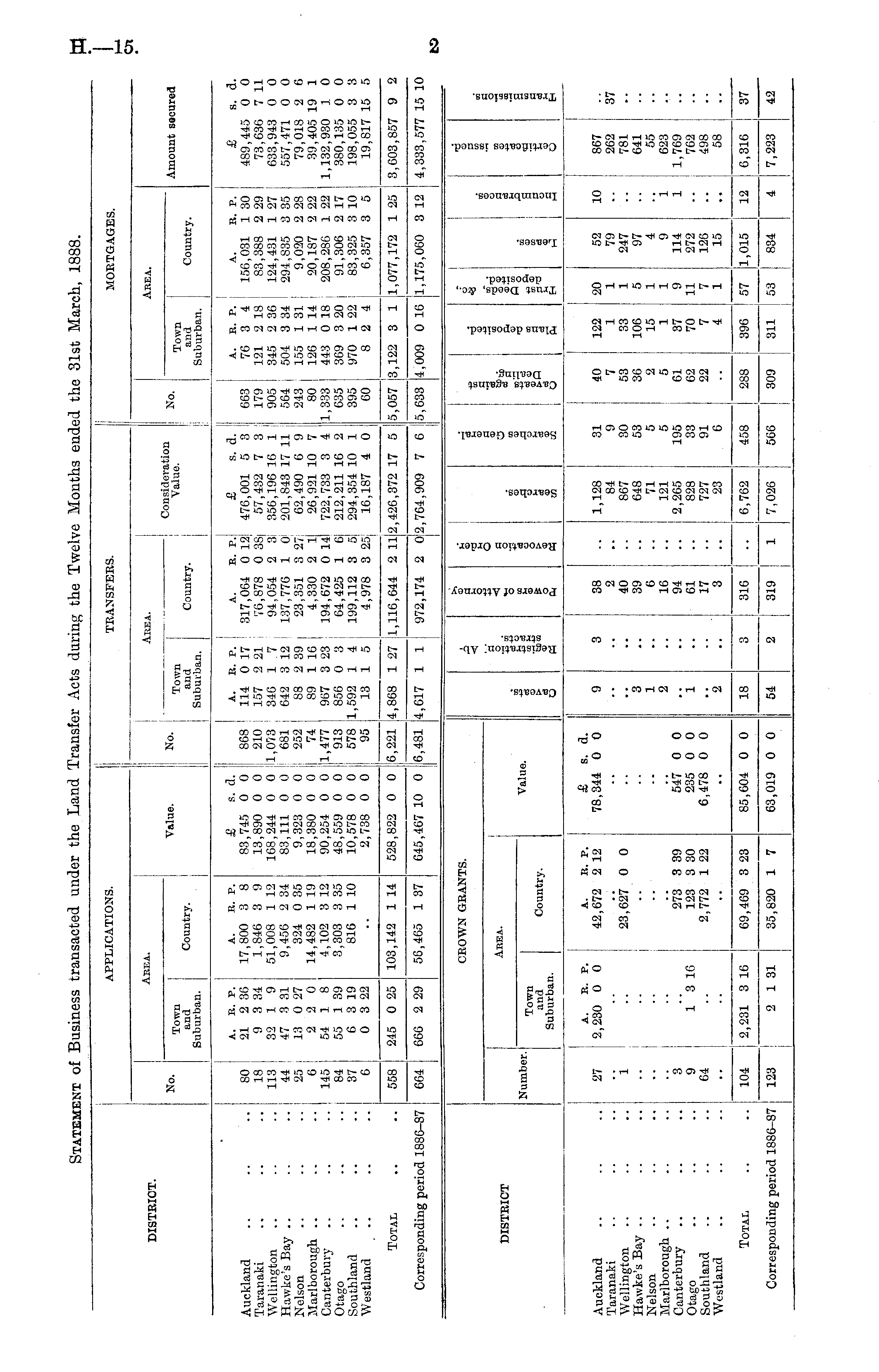APPLICATIONS. TRANSFERS. MORTGAGES. DISTRICT. o. Area. Value. N0- j "Town ' and Suburban. Aeea. Country. j Value. li No. Abea. Country. Amount secured Town and Suburban. Country. Town and Suburban. Auckland Taranaki Wellington Hawke's Bay Nelson Marlborough .. Canterbuiy Otago Southland Westlond 80 18 113 44 ! 25 j 6 ! 145 84 37 6 A. B. P. 21 2 36 9 3 34 32 1 9 47 3 31 18 0 27 2 2 0 54 1 8 55 1 39 6 3 19 0 3 22 A. B. P. 17,800 3 8 1,846 3 9 51,008 1 12 9,456 2 34 324 0 35 14,482 1 19 4,102 3 12 3,303 3 35 816 1 10 £ s. d. a. b. p. , a. k. p. £ s. d. 83,745 0 0 868 '• 114 0 17 317,064 0 12! 476,001 5 3 13,890 0 0 210 157 2 21 76,878 0 38! 57,432 7 3 168,244 0 0 1,073 346 1 7 94,054 2 3, 356,196 16 1 83,111 0 0 681 642 3 12 137,776 1 0' 201,843 17 11 9,323 0 0 ;: 252 ! 88 2 39 23,351 3 27; 62,490 6 9 18,380 0 0! 74 | 89 1 16 | 4,330 2 1 26,921 10 7 90,254 0 0 1,477 ; 967 3 23 194,672 0 14 722,733 3 4 48,559 0 0 913 i 856 0 3 i 64,425 1 6i 212,211 16 2 10,578 0 0 578 11,592 1 4 '■ 199,112 3 5: 294,354 10 1 2,738 0 0 95 13 1 5 I 4,978 3 25 16,187 4 0 i| . i 663 179 905 564 j 243 ; 80 1,333 635 395 60 A. B. P. 76 3 4 121 2 18 345 2 36 504 3 34 155 1 31 ! 126 1 14 443 0 18 369 3 20 970 1 22 8 2 4 A. B. p. 150,031 1 30 83,388 2 29 124,431 1 27 294,835 3 35 9,020 2 28 20,187 2 22 208,286 1 22 91,306 2 17 83,325 3 10 6,357 3 5 £ s. d. 489,445 0 0 73,636 7 11 633,943 0 0 557,471 0 0 79,018 2 6 39,405 19 1 1,132,930 1 0 380,135 0 0 198,055 3 S 19,817 15 5 Total 558 245 0 25 103,142 1 14 528,822 0 0 1:6,221 4,868 1 27 jl, 116,644 2 1112,426,372 17 5 528,822 0 0 5,057 3,122 3 1 558 4,868 1 27 11,116,644 2 11 2,426,372 17 5 1,077,172 1 25 3,603,857 9 2 Corresponding period 1886-87 664 664 | 666 2 29 . ! ! i_ 645,467 10 0 6,481 J4,617 1 1 972,174 2 02,764,909 7 6 [4,617 1 1 972,174 2 02,764,909 7 6 ! 5,633 56,465 1 37 645,467 10 0 4,009 0 16 1,175,060 3 12 4,333,577 15 10