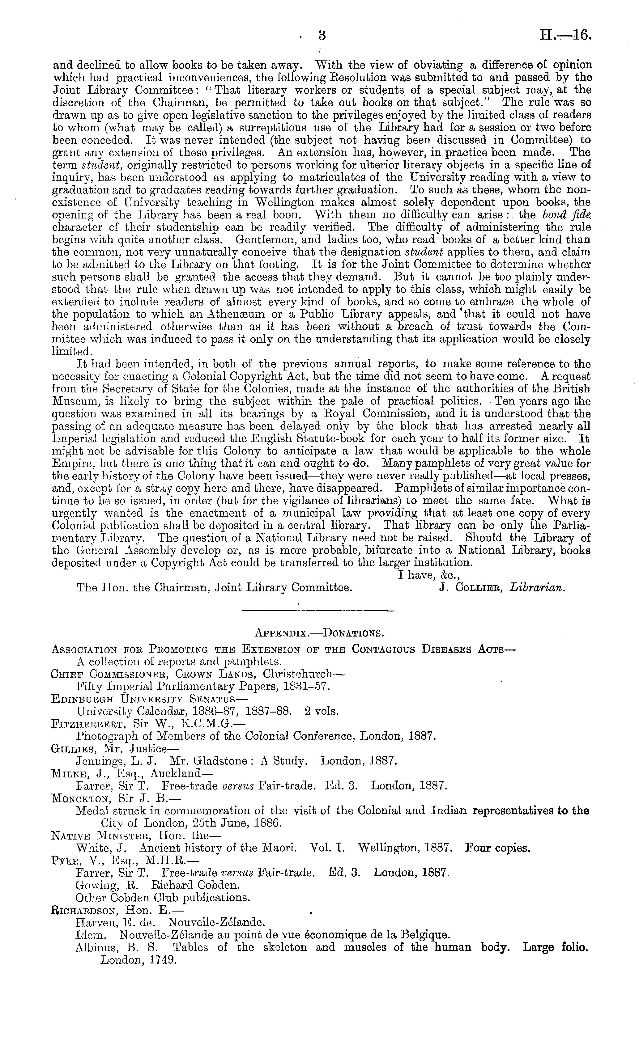 Appendix.—Donations. Association for Promoting the Extension of the Contagious Diseases Acts— A collection of reports and pamphlets. Chief Commissioner, Crown Lands, Christchurch — Fifty Imperial Parliamentary Papers, 1831-57. Edinburgh University Senatus — University Calendar, 1886-87, 1887-88. 2 vols. Fitzherbert, Sir W., K.C.M.G.— Photograph of Members of the Colonial Conference, London, 1887. Gillies, Mr. Justice— Jennings, L. J. Mr. Gladstone : A Study. London, 1887. Milne, J., Esq., Auckland— Farrer, Sir T. Free-trade versus Fair-trade. Ed. 3. London, 1887. Monckton, Sir J. B. — Medal struck in commemoration of the visit of the Colonial and Indian representatives to the City of London, 25th June, 1886. Native Minister, Hon. the — White, J. Ancient history of the Maori. Vol. I. Wellington, 1887. Four copies. Pyre, V., Esq., M.H.B.— Farrer, Sir T. Free-trade versus Fair-trade. Ed. 3. London, 1887. Gowing, B. Bichard Cobden. Other Cobden Club publications. Bichardson, Hon. E. — Harven, E. de. Nouvelle-Zelande. Idem. Nouvelle-Zelande au point de vue economique de la Belgique. Albinus, B. S. Tables of the skeleton and muscles of the human body. Large folio. London, 1749.