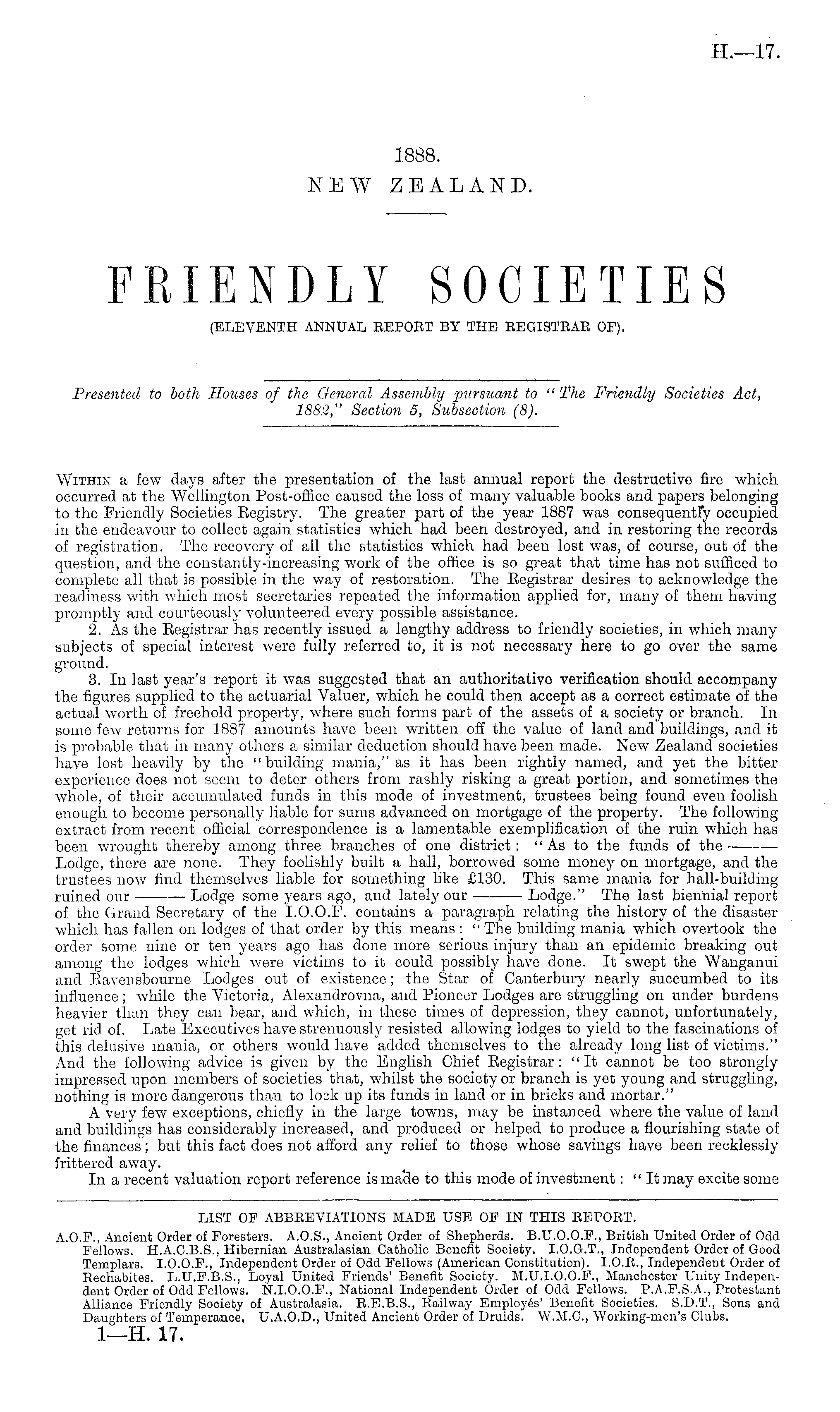 LIST OF ABBREVIATIONS MADE USE OF IN THIS REPORT. A.0.F., Ancient Order of Foresters. A.0.5., Ancient Order of Shepherds. 8.U.0.0.F., British United Order of Odd Fellows. H.A.C.8.5., Hibernian Australasian Catholic Benefit Society. 1.0.G.T., Independent Order of Good Templars. 1.0.0.F., Independent Order of Odd Follows (American Constitution). 1.0.R., Independent Order of Rechabites. L.U.F.8.5., Loyal United Friends' Benefit Society. M.U.1.0.0.F., Manchester Unity Independent Order of Odd Fellows. N.1.0.0.F., National Independent Order of Odd Fellows. P.A.F.S.A., Protestant Alliance Friendly Society of Australasia. R.E.8.5., Railway Employes' Benefit Societies. S.D.T., Sons and Daughters of Temperance, U.A.0.D., United Ancient Order of Druids. W.M.C., Working-men's Clubs. I—H. 17.