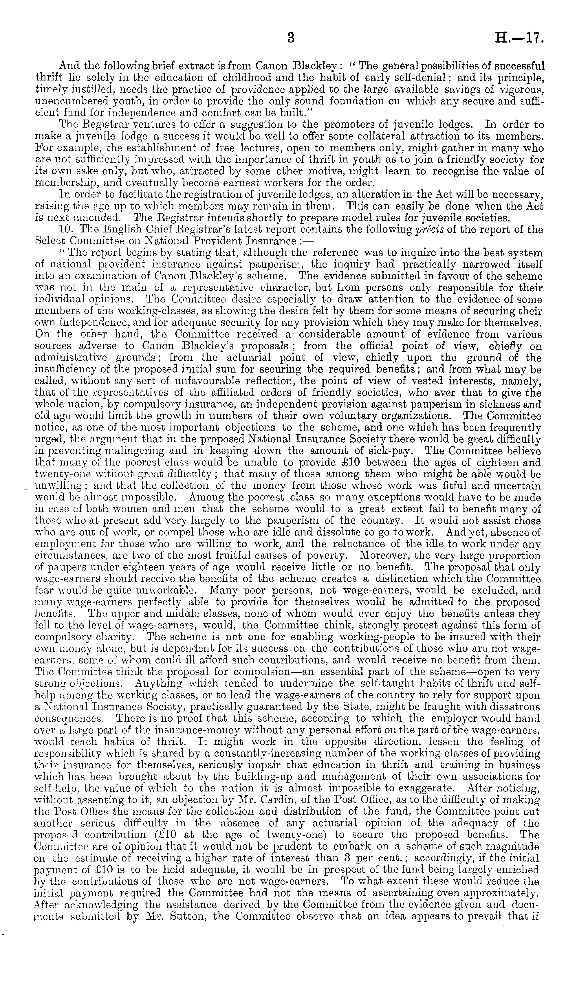 And the folio wing brief extract is from Canon Blackley : " The general possibilities of successful thrift lie solely in the education of childhood and the habit of early self-denial; and its principle, timely instilled, needs the practice of providence applied to the large available savings of vigorous, unencumbered youth, in order to provide the only sound foundation on which any secure and sufficient fund for independence and comfort can be built." The Eegistrar ventures to offer a suggestion to the promoters of juvenile lodges. In order to make a juvenile lodge a success it would be well to offer some collateral attraction to its members. For example, the establishment of free lectures, open to members only, might gather in many who are not sufficiently impressed with the importance of thrift in youth as to join a friendly society for its own sake only, but who, attracted by some other motive, might learn to recognise the value of membership, and eventually become earnest workers for the order. In order to facilitate the registration of juvenile lodges, an alteration in the Act will be necessary, raising the age up to which members may remain in them. This can easily be done when the Act is next amended. The Eegistrar intends shortly to prepare model rules for juvenile societies. 10. The Fnglish Chief Eegistrar's latest report contains the following precis of the report of the Select Committee on National Provident Insurance :— " The report begins by stating that, although the reference was to inquire into the best system of national provident insurance against pauperism, the inquiry had practically narrowed itself into an examination of Canon Blackley's scheme. The evidence submitted in favour of the scheme was not in the main of a representative character, but from persons only responsible for their individual opinions. The Committee desire especially to draw attention to the evidence of some members of the working-classes, as showing the desire felt by them for some means of securing their own independence, and for adequate security for any provision which they may make for themselves. On the other hand, the Committee received a considerable amount of evidence from various sources adverse to Canon Blackley's proposals ; from the official point of view, chiefly on administrative grounds; from the actuarial point of view, chiefly upon the ground of the insufficiency of the proposed initial sum for securing the required benefits ; and from what may be called, without any sort of unfavourable reflection, the point of view of vested interests, namely, that of the representatives of the affiliated orders of friendly societies, who aver that to give the whole nation, by compulsory insurance, an independent provision against pauperism in sickness and old age would limit the growth in numbers of their own voluntary organizations. The Committee notice, as one of the most important objections to the scheme, and one which has been frequently urged, the argument that in the proposed National Insurance Society there would be great difficulty in preventing malingering and in keeping down the amount of sick-pay. The Committee believe that many of the poorest class would be unable to provide £10 between the ages of eighteen and twenty-one without great difficulty ; that many of those among them who might be able would be unwilling; and that the collection of the money from those whose work was fitful and uncertain would be almost impossible. Among the poorest class so many exceptions would have to be made in case of both women and men that the scheme would to a great extent fail to benefit many of those who at present add very largely to the pauperism of the country. It would not assist those who are out of work, or compel those who are idle and dissolute to go to work. And yet, absence of employment for those who are willing to work, and the reluctance of the idle to work under any circumstances, are two of the most fruitful causes of poverty. Moreover, the very large proportion of paupers under eighteen years of age would receive little or no benefit. The proposal that only wage-earners should receive the benefits of the scheme creates a distinction which the Committee fear would be quite unworkable. Many poor persons, not wage-earners, would be excluded, and many wage-earners perfectly able to provide for themselves would be admitted to the proposed benefits. The upper and middle classes, none of whom would ever enjoy the benefits unless they fell to the level of wage-earners, would, the Committee think, strongly protest against this form of compulsory charity. The scheme is not one for enabling working-people to be insured with their own money alone, but is dependent for its success on the contributions of those who are not wageearners, some of whom could ill afford such contributions, and would receive no benefit from them. The Committee think the proposal for compulsion—an essential part of the scheme—open to very strong objections. Anything which tended to undermine the self-taught habits of thrift and selfhelp among the working-classes, or to lead the wage-earners of the country to rely for support upon a National Insurance Society, practically guaranteed by the State, might be fraught with disastrous consequences. There is no proof that this scheme, according to which the employer would hand over a large part of the insurance-money without any personal effort on the part of the wage-earners, would teach habits of thrift. It might work in the opposite direction, lessen the feeling of responsibility which is shared by a constantly-increasing number of the working-classes of providing their insurance for themselves, seriously impair that education in thrift and training in business which has been brought about by the building-up and management of their own associations [or self-help, the value of which to the nation it is almost impossible to exaggerate. After noticing, without assent