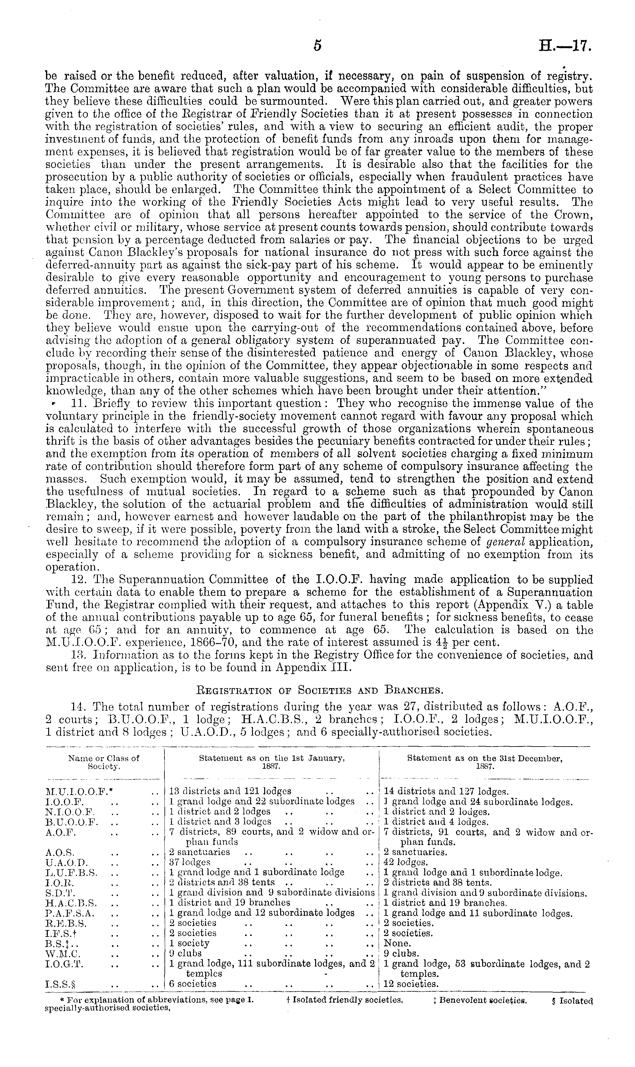 Name or Class of Society. Statement as on tho 1st January, 1887. Statement as on the 31st December, 1887. M.U.I.O.O.F.* I.O.O.F. N.I.O.O.F. B.U.O.O.F. .. A.O.F. A..O.S. U.A.O.D. L.U.F.B.S. .. I.O.B. 3.D.T. H.A.C.B.S. .. P.A.F.S.A. R.E.B.S. [.F.S.t B.S.J.. W.M.C. t.O.G.T. 18 districts and 121 lodges 1 grand lodge and 22 subordinate lodges 1 district and 2 lodges 1 district and 3 lodges 7 districts, 89 courts, and 2 widow and orphan funds 2 sanctuaries 37 lodges 1 grand lodge and 1 subordinate lodge 2 districts and 38 tents 1 grand division and 9 subordinate divisions 1 district and 19 branches 1 grand lodge and 12 subordinate lodges .. 2 societies 2 societies 1 society 9 clubs 1 grand lodge, 111 subordinate lodges, and 2 temples 6 societies 14 districts and 127 lodges. 1 grand lodge and 24 subordinate lodges. 1 district and 2 lodges. 1 district and 4 lodges. 7 districts, 91 courts, and 2 widow and orphan funds. 2 sanctuaries. 42 lodges. 1 grand lodge and 1 subordinate lodge. 2 districts and 38 tents. 1 grand division and 9 subordinate divisions. 1 district and 19 branches. 1 grand lodge and 11 subordinate lodges. 2 societies. 2 societies. None. 9 clubs. 1 grand lodge, 53 subordinate lodges, and 2 temples. 12 societies. [,S.S.§ * For explanation of abbi lecially-authorisod societiei •eviations, see page 1. t Isolated friendly societies. ; Benevolent societies. § Isolated 3.