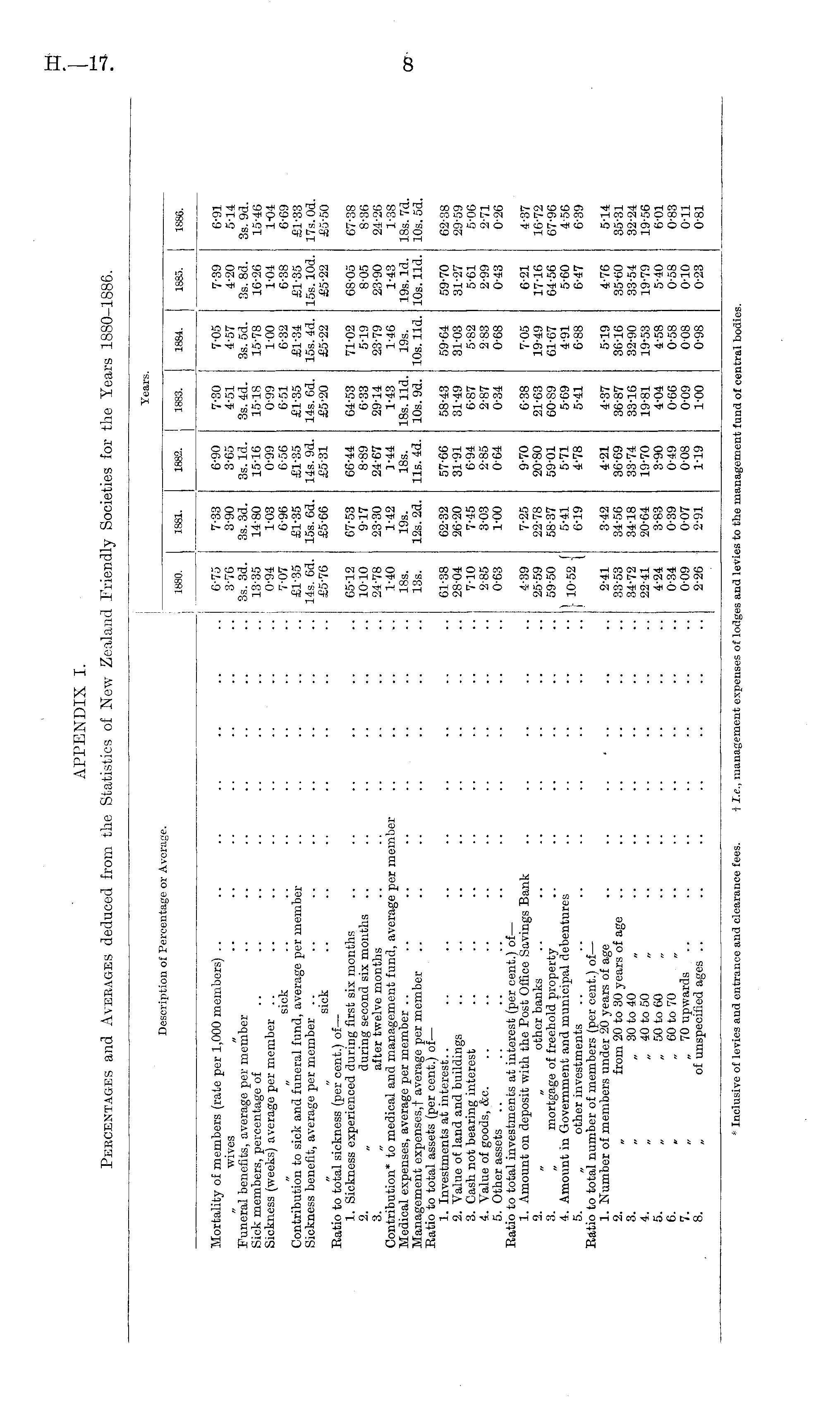APPENDIX I. Percentages and Averages deduced from the Statistics of New Zealand Friendly Societies for the Years 1880-1886.