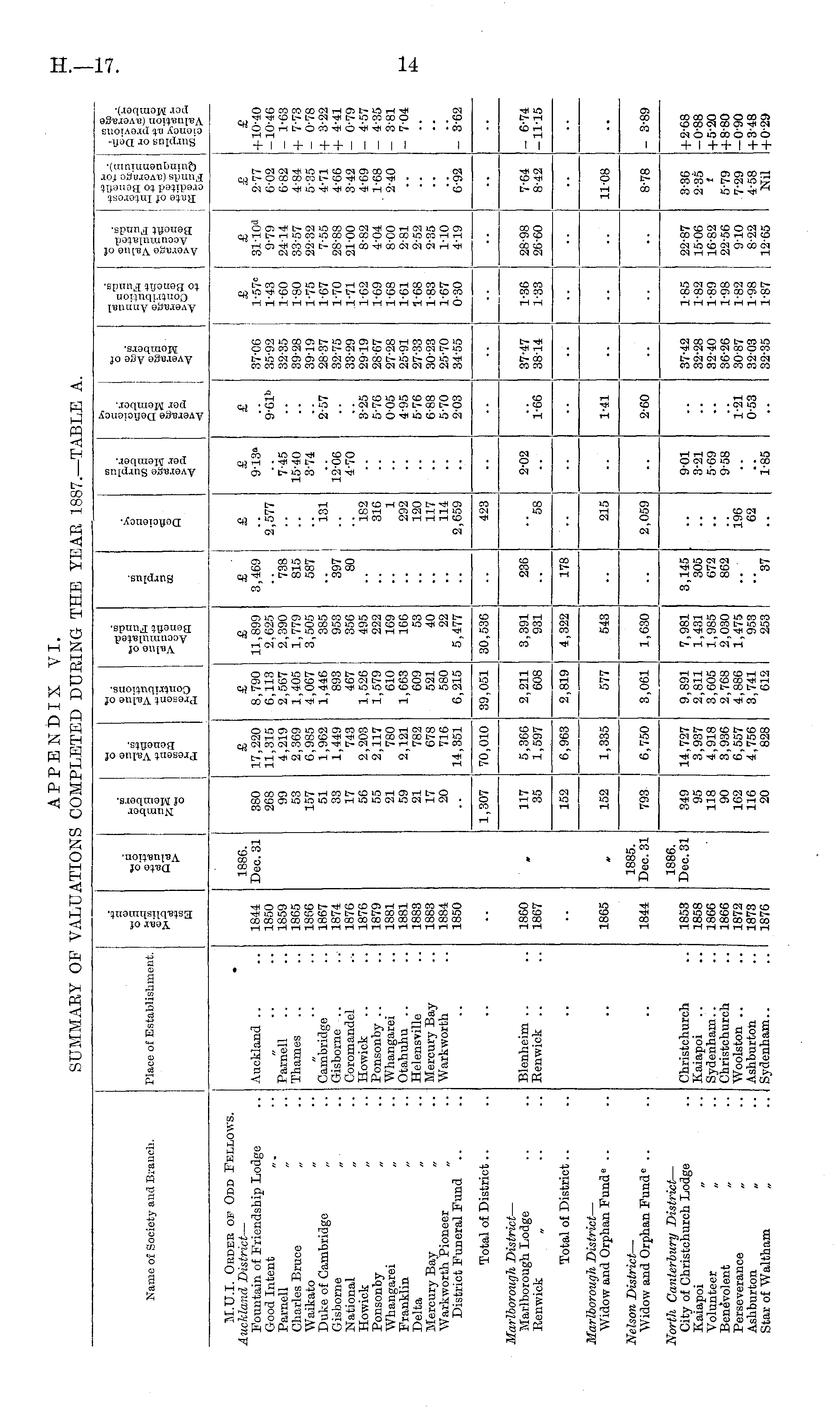 Name 01 Society and Branch. Place of Establishment. 2.3 TO TO is o o © °TO © a G O n-c TO «l-l+? PI 5* § a to S3 w © "© o o TO tc a o 3 > P. q, H* < o CIS CO O .— < TO es "£ p; < s o ill p J o £ o © « © ~ & OH4 TO ® *S O £r-Z. r « a o cc.2 =s M.U.I. Order op Odd Fellows. Auckland District — Fountain of Friendship Lodge Good Intent „. Parnell Charles Bruce „ Waikato Duke of Cambridge Gisborne „ National „ Howick „ Ponsonby Whangarei „ Franklin „ Delta Mercury Bay „ Warkworth Pioneer „ District Funeral Fund Auckland .. • 1886. Dec. 31 £ 17,220 11,315 4,219 2,369 6,9S5 1,962 1,449 743 2,203 2,117 780 2,121 782 678 716 14,351 £ 8,790 6,113 2,567 1,405 4,067 1,446 893 467 1,526 1,579 610 1,663 609 521 580 6,215 £ 11,899 2,625 2,390 1,779 3,505 385 953 356 495 222 169 166 53 40 22 5,477 £ 3,469 £ £ 9-13» £ £ l-57« 1-43 1-60 1-80 1-75 1-67 1-70 1-71 1-62 1-69 1-68 1-61 1-68 1-83 1-67 0-30 £ 31-lf/ 1 9-79 2414 33-57 22-32 7-55 28-88 21-00 8-82 4-04 8-00 2-81 2-52 2-35 110 4-19 SO 2-77 6-02 6-82 4-84 5-35 4-71 4-66 3-42 4-69 1-68 2-40 +10~40 -10-46 - 1-63 + 7-73 - 078 + 3-22 + 4-41 - 0-79 - 4-57 - 435 - 381 - 7-04 Parnell Thames Cambridge Gisborne .. Coromandel Howick Ponsonby .. Whangarei Otahuhu .. Helensville Mercury Bay Warkworth 1844 1850 1859 1865 1866 1867 1874 1876 1876 1879 1881 1881 18S3 1883 1884 1850 380 268 99 53 157 51 33 17 56 55 21 59 21 17 20 738 815 587 '397 80 2^577 isi 182 316 1 292 120 117 114 2,659 7-45 15-40 3-74 12-06 4-70 9-Cl b 2-57 3-25 5-76 0-05 4-95 5-76 6-88 5-70 2-03 37-06 35-92 32-35 39-28 39-19 28-37 32-75 3329 29-19 28-67 27-28 25-91 27-33 30-23 2570 34-55 6-92 - 3-62 Total of District .. 1,307 70,010 39,051 30,530 ■■ 423 •• ■■ •• I I I ' i Marlborough District — Marlborough Lodge Renwick „ I i ! Blenheim .. Renwick .. 1860 1867 117 35 5,366 1,597 2,211 008 3,391 931 236 "58 2-02 l'-OO 37-47 38-14 1-36 1-33 28-98 20-60 7-04 8-42 - 6-74 -11-15 •- •■ Total of District .. 152 6,963 1 ! I 2,819 j 4,322 17S ■• •■ Marlborough District — Widow and Orphan Fund 0 .. I ! I i 1 1865 152 1,335 577 543 215 1-41 11-08 •• Nelson District — Widow and Orphan Fund 0 .. 1885. Dec. 31 I 1844 793 | 1 6,750 3,061 1,630 2,059 2-60 8-78 - 3-89 North Canterbury District — City of Christchurch Lodge Kaiapoi „ Volunteer „ Benevolent „ Perseverance Ashburton „ Star of Waltham Christchurch Kaiapoi Sydenham.. Christchurch Woolston .. Ashburton Sydenham.. 1853 1858 1866 1866 1872 1873 1S76 1886. Dec. 31 ] 849 95 118 90 162 116 20 14,727 3,937 4,918 3,936 6,557 4,756 828 9,891 2,811 3,605 2,768 4,886 3,741 612 7,981 1,431 1,985 2,030 1,475 953 253 3,145 305 672 862 9-01 3-21 5-69 9-58 37-42 32-28 32-40 36-26 30-87 32-03 32-35 1-85 1-82 1-89 1-98 1-82 1-98 1-87 22-87 15-06 16-82 22-56 9-10 8-22 12-65 3-36 2-35 I + 2-68 -0-88 + 5-20 + 8-80 -0-90 + 3-48 + 0-29 196 62 1-21 0-53 5-79 7-29 4-58 Nil "37 1*85