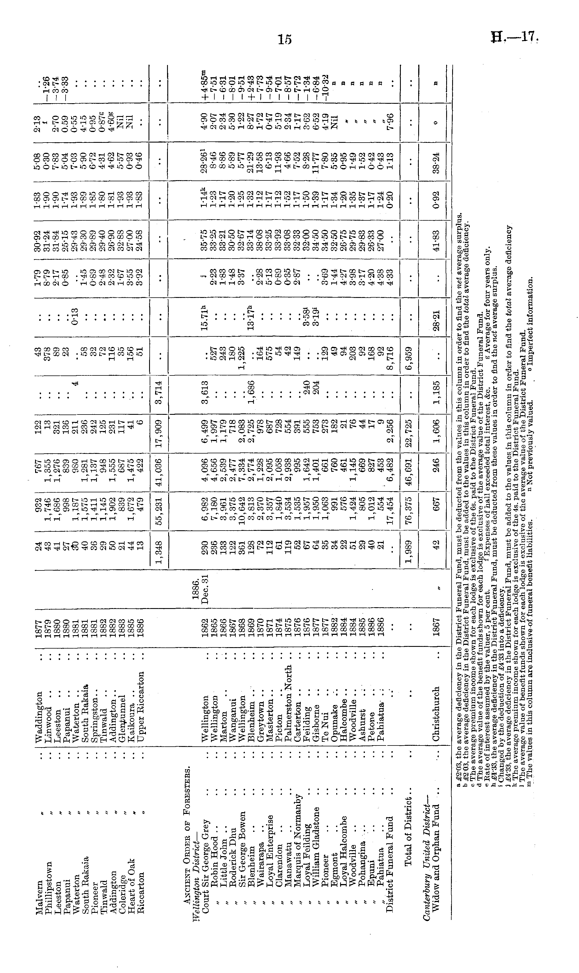 Malvern Phillipstown Leeston Papanui Waterton „ South Rakaia Pioneer „ Tinwald Addington Coleridge Heart of Oak Riccarton Waddington Linwood Leeston Papanui Waterton South Rakaia Springston Tinwald Addington.. Gleryiunnel Kaikoura Upper Riccarton 1877 1879 1880 1880 1881 1881 1381 1882 1882 1883 1885 1886 24 43 41 27 40 36 29 50 21 44 13 932 1,746 1,686 998 1,187 1,575 1,411 1,145 1,902 839 1,072 479 767 1,355 1,276 839 9S0 1,281 1,137 948 1,555 687 1,475 422 122 13 321 136 211 236 242 125 231 117 41 6 •■ 43 378 89 23 1-79 8-79 2-17 0-85 30-92 31-24 31-84 25-15 29-43 29-30 29-89 29-40 26-90 32-88 27-00 24-58 1-83 1-90 1-90 1-74 1-93 1-89 1-S5 1-80 1-81 1-93 1-93 1-83 508 0-30 7-83 5-04 7-03 590 6-72 4-31 4-62 5-57 093 0-46 2-13 f 2-70 0.59 0-55 4-15 0-95 0-878 460s Nil Nil -1-26 -3-74 -3-33 4 013 1-45 0-89 2-48 2-32 1-67 3-55 3-92 53 32 72 116 35 156 51 •• I 41,036 17,909 3,714 1,348 I 55,231 •• •• Ancient Order of Foresters. Wellington District — Court Sir George Grey „ Robin Hood .. „ Little John Roderick Dhu Sir George Bowen Blenheim Wairarapa .. „ Loyal Enterprise Clarendon „ Manawatu Marquis of Normanby Loyal Feilding William Gladstone „ Pioneer Egmont „ Loyal Halcombe „ Woodville Pohangina .. „ Epuni „ Pahiatua District Funeral F und Wellington Wellington Marton Wanganui Wellington Blenheim Greytown Masterton Picton Palmerston North .. Carterton Feilding Gisborne Te Nui Opunake Halcombe Woodville Ashurst Petone Pahiatua I I 1862 1865 1866 1867 1868 1869 1870 1871 1874 1875 1876 1876 1877 1877 1882 1884 1884 1885 1886 1886 1886. Dec. 31 230 236 133 122 361 128 72 112 61 119 52 67 64 35 34 22 51 29 40 21 6,982 7,180 3,901 3,375 10,642 3,813 2,370 3,357 1,840 3,534 1,535 1,957 1,950 1,063 991 576 1,424 805 1,012 554 17,454 4,096 4,656 2,539 2,477 7,334 2,774 1,228 2,095 1,058 2,938 995 1,642 1,401 661 760 461 1,145 669 827 453 6,482 6,499 1,997 1,179 718 2,083 2,725 978 687 728 554 391 555 753 273 182 21 76 44 17 9 2,256 3,613 1J686 527 243 180 1,225 164 575 54 42 149 15.71 h 13T7 h i 2-23 1-83 1-48 3-37 2-28 5-13 0-89 0-35 2-87 35-75 33-25 33-21 30-50 32-67 33-14 38-03 33-25 33-92 33-08 32-33 32-00 34-50 34-50 32-50 26-75 29-75 29-83 26-33 27-00 M4* 1-23 1-17 1-20 1-25 1-32 1-12 1-17 1-12 1-52 1-17 1-50 1-39 117 1-34 1-20 1-35 1-37 1-17 1-24 0-20 28-26 1 8-46 8-86 5-89 5-77 21-29 13-58 6-13 11-93 4-66 7-52 S-28 11-77 7-80 5-35 0-95 1-49 1-52 0-42 043 1-13 490 2-07 234 5-30 1-22 8-27 1-72 0-47 5-19 2-34 1-17 3-62 6-52 4-19 Nil + 4-85 m -7-51 -6-31 -801 -951 + 2-43 -7-73 -9-54 -7-01 -8-57 -7-72 -1-34 -6-84 -10-32 n '240 204 3-58* 3-19' 129 49 94 203 92 168 92 8,716 3-69 1-44 4-27 3-98 3-17 4-20 4-38 4-33 11 n n n 7-96 n ■ ■ Total of District.. 1,989 76,375 46,691 22,725 6,959 Canterbury United District — Widow and Orphan Fund .. Christchurch 1867 1,006 n 42 [ 667 246 1,185 28-21 41-83 0-92 38-24 1 ! ! ! ; a £2-0.'!, the average deficiency in the District Funeral Fund, must be deducted from the values in this column in order to find the net average surplus. i> £2 03, the average deficiency in the District Funeral Fund, must be added to the values in this column in order to find the total average deficiency. <- The average premium income shown for each lodge is exclusive of the 6s. paid to the District Funeral Fund. <i The average value of the benefit funds shown for each lodge is exclusive of the average value of the District Funeral Fund. ° Rate of interest assumed by the valuer, 5 per cent. f Expenses of hall exceeded total interest, &c. ft Average for four years only. h £4'33, the average deficiency in the District Funeral Fund, must be deducted from these values in order to find the net average surplus. 1 Changed by the deduction of £433 into a deficiency. i £4-33, the average deficiency in the District Funeral Fund, must bo added to the values in this column in order to find the total average deficiency 1- The average premium income shown for each lodge is exclusive of the 4s. paid to the District Funeral Fund. ' The average value of benefit funds shown for each lodge is exclusive of the average value of the District Funeral Fund. m The values iu this column are inclusive of funeral benefit liabilities. " Not previously valued. 0 Imperfect information.