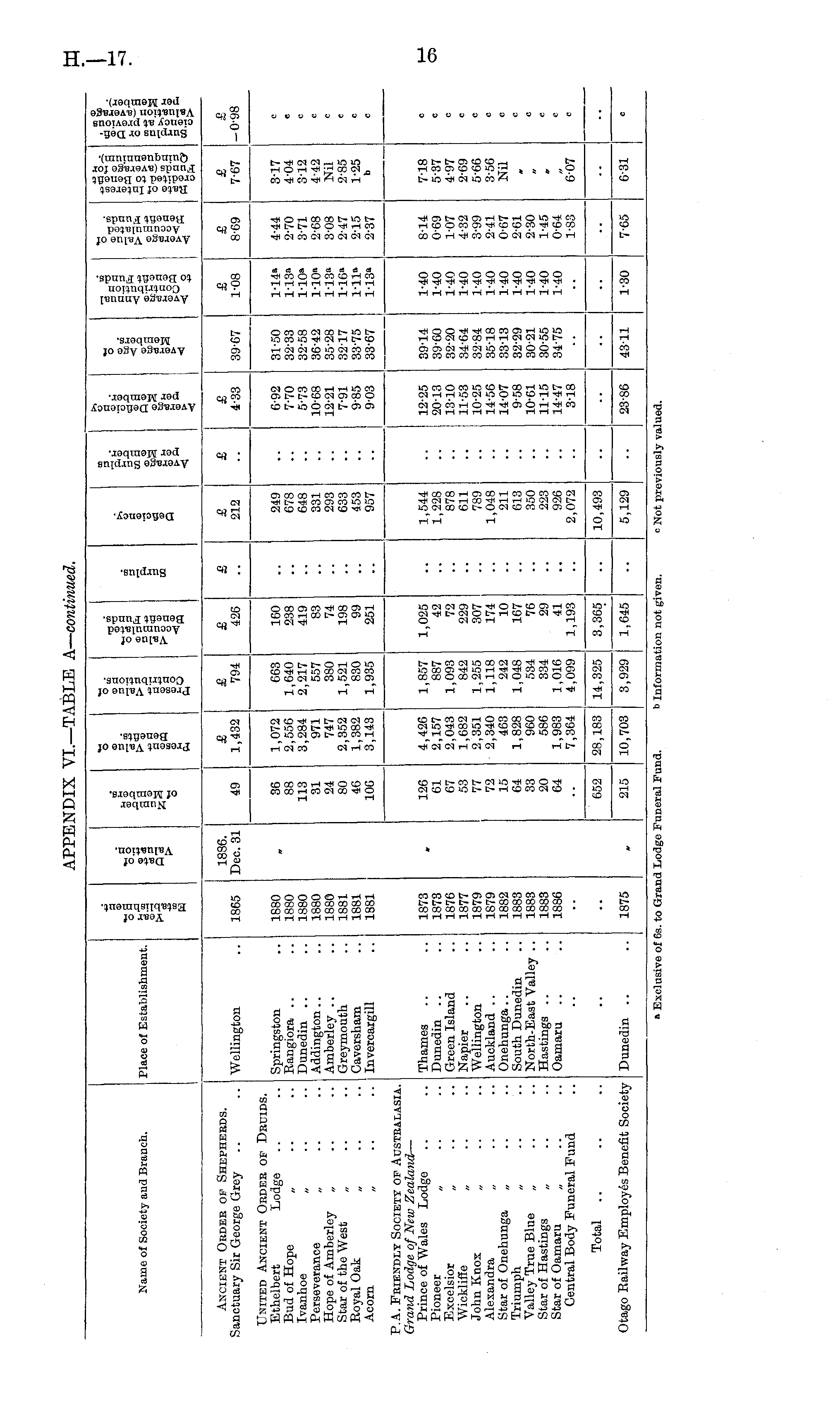 Name of Society and Branch. Place of Establishment. © 3.3 m _, a o.2 <3 3 si © ■2* r* cl *• a a © © Ph © a a o > a a '^ la © o Ph ■0,2 o d a |al a5 o © -a © n TO PI . tc Pi © © o Pi . © h ©a ©s 2 s •4 o a © < ■-1 TO all £■*.» £ Pi © 5 3 O ©« d-jj a a «fl o r -i ©> Ancient Order of Shepherds. Sanctuary Sir George Grey .. Wellington 1865 1886. Dec. 31 49 £ 1,432 £ 794 £ 426 £ £ 212 £ £ 4-33 39-67 £ 1-08 £ 8-69 £ 7-67 -0-98 United Ancient Order op Druids. Ethelbert Lodge Bud of Hope „ Ivanhoe „ Perseverance „ Hope of Amberley „ Star of the West „ Royal Oak „ Acorn „ Springston Rangiora Dunedin Addington Amberley Greymouth Caversham Invereargill 1880 1880 1880 1880 1880 1881 1881 1881 36 88 113 31 24 80 46 100 1,072 2,556 3,284 971 747 2,352 1,382 3,143 663 1,640 2,217 557 380 1,521 830 1,935 160 238 419 83 74 198 99 251 249 678 648 331 293 633 453 957 6-92 7-70 5-73 10-68 12-21 7-91 9-85 9-03 31-50 32-33 32-58 36-42 35-28 3217 33-75 33-67 1-14* 1-13" 1-10» 1-13" M6» 1-11° 1-13" 4-44 2-70 3-71 2-68 3-08 2-47 2-15 2-37 3-17 4-04 3-12 4-42 Nil 2-85 1-25 b c C c c c c c c P. A. Friendly Society op Australasia. Grand Lodge of New Zealand — Prince of Wales Lodge Pioneer „ Excelsior „ Wickliffe John Knox „ Alexandra „ Star of Onehunga „ Triumph „ Valley True Blue Star of Hastings „ Star of Oamaru „ Central Body Funeral Fund I Thames Dunedin Green Island Napier Wellington Auckland Onehunga South Dunedin North-East Valley .. Hastings Oamaru 1873 1873 1876 1877 1879 1879 1882 1883 1883 1883 1886 126 61 67 53 77 72 15 64 33 20 64 4,426 2,157 2,043 1,682 2,351 2,340 463 1,828 960 586 1,983 7,364 1,857 887 1,093 842 1,255 1,118 242 1,048 534 334 1,016 4,099 1,025 42 72 229 307 174 10 167 76 29 41 1,193 1,544 1,228 878 611 789 1,048 211 613 350 223 926 2,072 12-25 20-13 13-10 11-53 10-25 14-50 14-07 9-58 10-61 11-15 14-47 3-18 39-14 3960 32-20 34-64 32-84 35-18 33-13 32-29 30-21 30-55 34-75 1-40 1-40 1-40 1-40 1-40 1-40 1-40 1-40 1-40 1-40 1-40 8-14 0-69 1-07 4-32 3-99 2-41 0-67 2-61 2-30 1-45 0-64 1-S3 7-18 5-37 4-97 2-69 5-66 3-56 Nil c c c c c e c c e c 6-07 c Total .. 652 28,183 14,325 3,365 10,493 Otago Railway Employes Benefit Society Dunedin 1875 215 10,703 3,929 1,645 23-80 7-65 6-31 5,129 43-11 1-30 a Exclusive of 6s. to Grand Lodj ;e Funeral Fund. b Information not ;iven. o Not ire'ioush valued.
