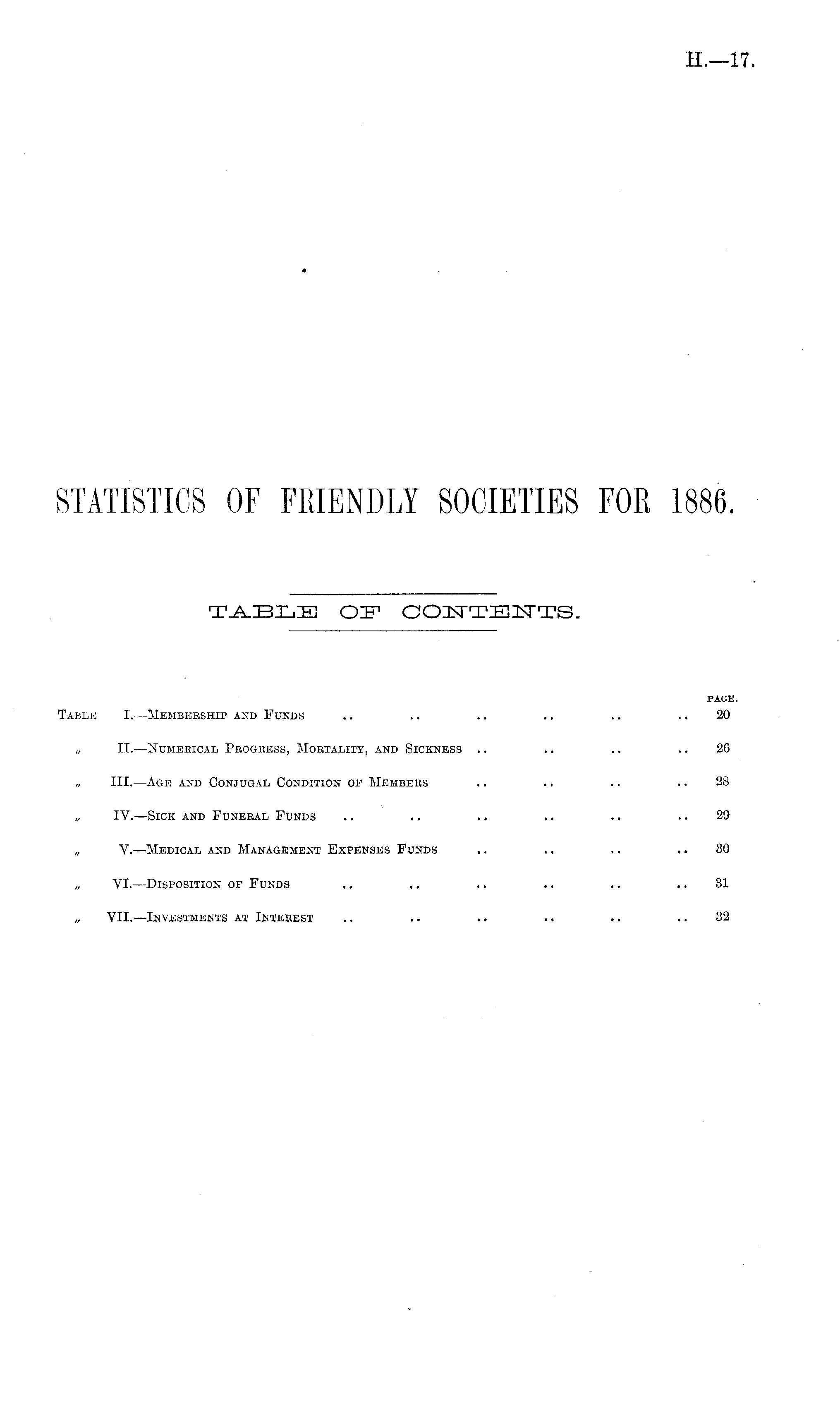 PAOE. Table I. —Membership and Funds .. .. .. .. .. 20 ll.—Numerical Progress, Mortality, and Sickness .. .. .. 26 „ lll.—Age and Conjugal Condition of Members .. .. .. 28 „ IV.—Sick and Funeral Funds .. .. .. .. .. 29 V. —Medical and Management Expenses Funds .. .. .. 30 „ VI. —Disposition op Funds .. .. .. .. .. 31 VII. —Investments at Interest .. .. .. .. .. 32