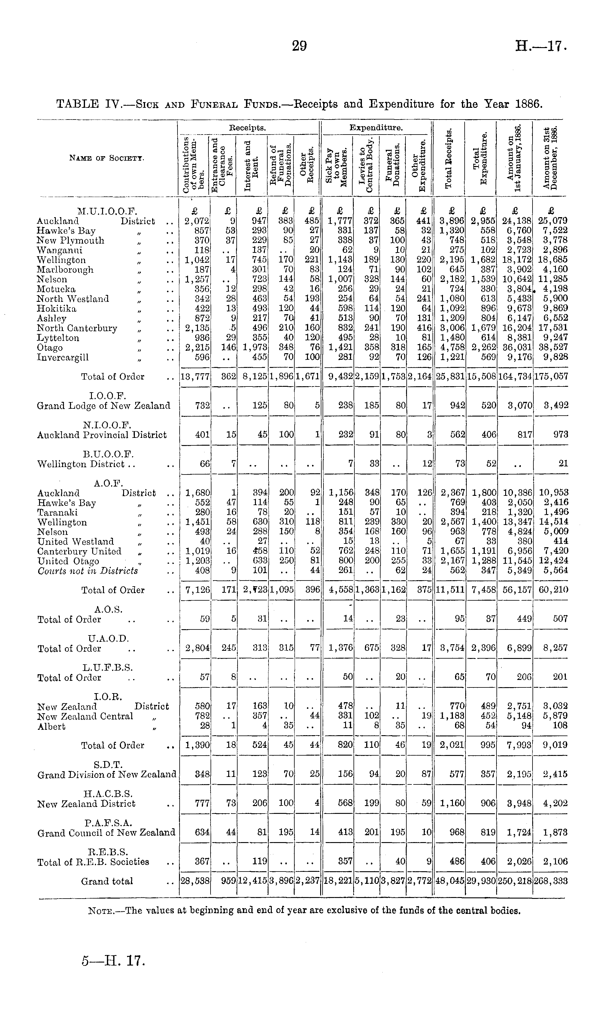 TABLE IV. —Sick and Funeral Funds. —Receipts and Expenditure for the Year 1886.