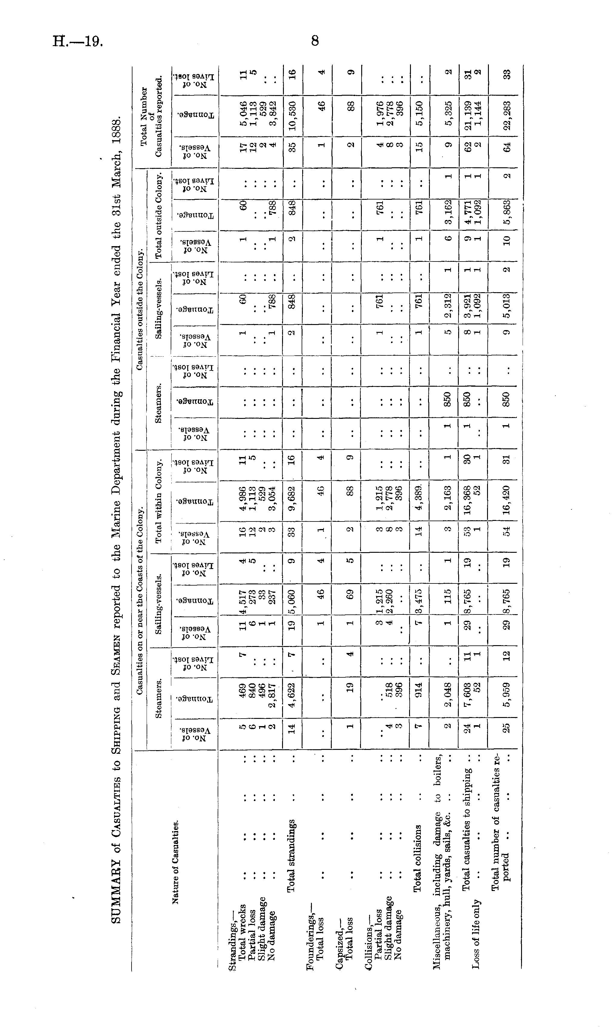 SUMMARY of Casualties to Shipping and Seamen reported to the Marine Department during the Financial Year ended the 31st March, 1888.