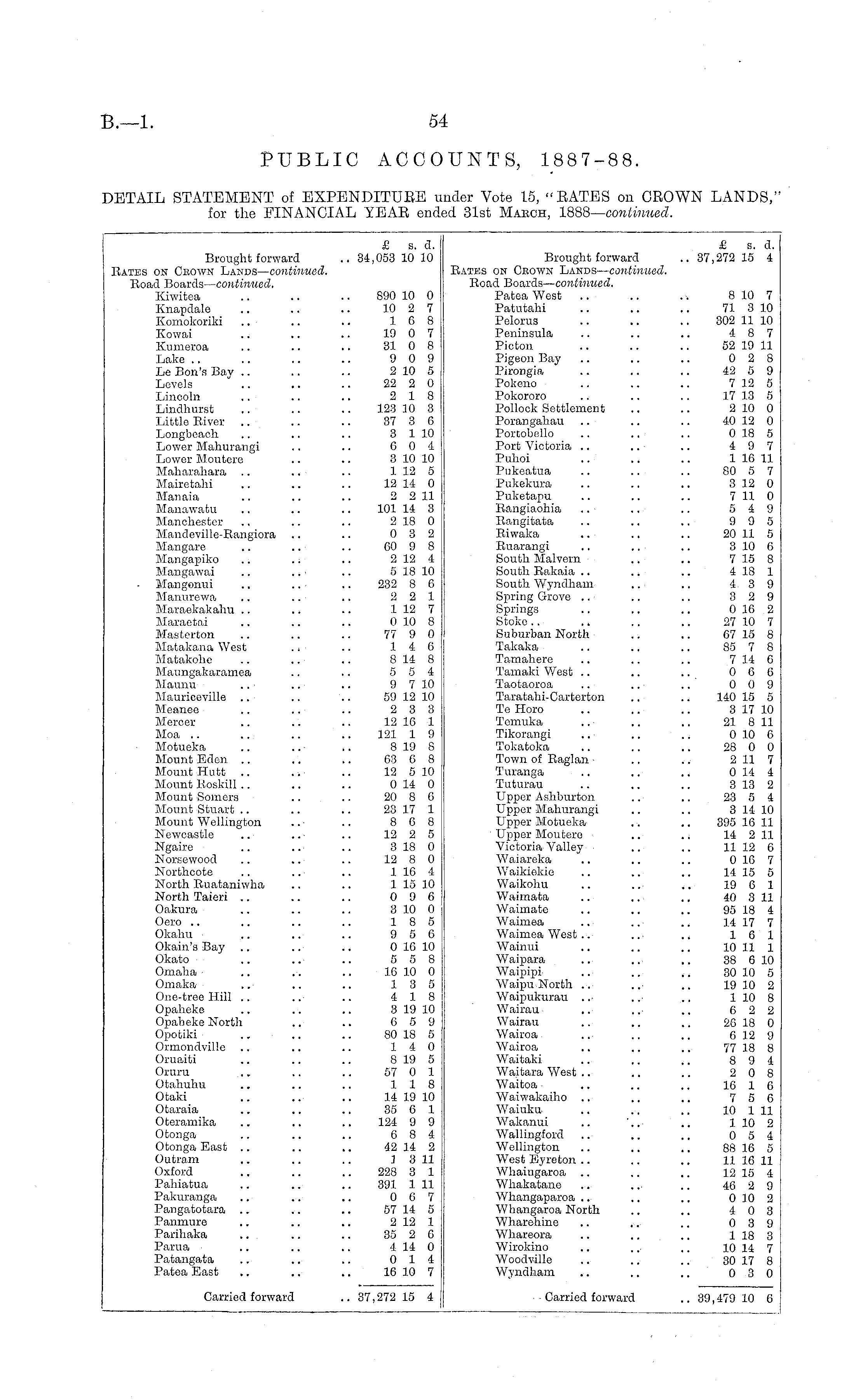Brought forward iATES on Cbown Lands— continued, Boad Boards — continued, Kiwitea Knapdale Komokoriki Kowai Kumeroa Lake .. Le Bon's Bay Levels Lincoln Lindhurst Little River Longbcach Lower Mahurangi Lower Moutere Maharahara Mairetalii Manaia Manawatu Manchester Mandevillc-Rangiora Mangaro Mangapiko Mangawai Mangonui Manurewa Maraekakahu .. Maraetai Masterton Matakana West . i Matakoho Maungakaramoa Maunu Maurieeville Meanee Mercer Moa Motueka Mount Eden Mount Hutt Mount Koskill Mount Somers Mount Stuart Mount Wellington Newcastle Ngaire Norsewood Northcote North Ruataniwha North Taieri Oakura Oero Okahu Okain'a Bay .. Okato Omaha Ornaka One-tree Hill Opaheke Opaheke North Opotiki .. Ormondville Oruaiti Oruru Otahuhu Otaki Otaraia Oteramika Otonga Otonga East Outram Oxford Pahiatua Pakuranga Pangatotara Panmure Parihaka Parua Patangata Patea East £ s. d. .. 34,053 10 10 890 10 0 10 2 7 16 8 19 0 7 31 0 8 9 0 9 2 10 5 22 2 0 2 18 123 10 3 37 3 6 3 1 10 6 0 4 3 10 10 1 12 5 12 14 0 2 2 11 101 14 3 2 18 0 0 3 2 GO 9 8 2 12 4 5 18 10 232 8 6 2 2 1 1 12 7 0 10 8 77 9 0 14 6 8 14 8 5 5 4 9 7 10 59 12 10 2 3 3 12 16 1 121 1 9 8 19 8 63 6 8 12 5 10 0 14 0 20 8 6 23 17 1 8 6 8 12 2 5 3 18 0 12 8 0 1 16 4 1 15 10 0 9 6 3 10 0 18 5 9 5 6 0 16 10 5 5 8 16 10 0 13 5 4 18 3 19 10 6 5 9 80 18 5 14 0 8 19 5 57 0 1 118 14 19 10 35 6 1 124 9 9 6 8 4 42 14 2 1 3 11 228 3 1 391 1 11 0 6 7 57 14 5 2 12 1 35 2 6 4 14 0 0 14 10 10 7 Carried forward .. 37,272 15 4