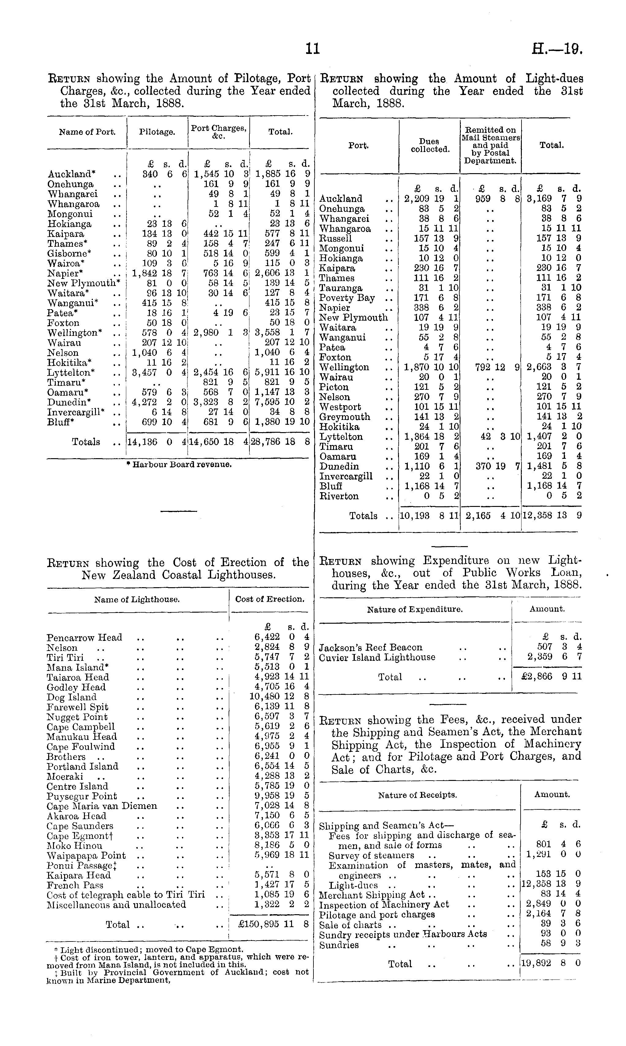 Namo of Port. Pilotage. Port Charges, &e. Total. Auckland* Cnehunga Whangarei Whangaroa Mongonui Hokianga Kaipara Ihames* 3isborne* Wairoa* Napier* Sew Plymouth* VVaitara* Wanganui* ?atea* Poxton Wellington* .. Wairau Nelson Hokitika* [jyttelton* rimaru* Damaru* Dunedin* [nvercargill* .. Bluff* £ s. d. 340 6 6 £ s. d. 1,545 10 3 161 9 9i 49 8 1 1 8 11 52 1 4^ £ s. d. 1,885 16 9 161 9 9 49 8 1 1 8 11 52 1 4 23 13 6 577 8 11 247 6 11 599 4 1 115 0 3 2,606 13 1 139 14 5 127 8 4 415 15 8 23 15 7 50 18 0 3,558 1 7 207 12 10 1,040 6 4 11 16 2 5,911 16 10 821 9 5 1,147 13 3 7,595 10 2 34 8 8 1,380 19 10 23 13 6 134 13 0' 89 2 4i 80 10 II 109 3 6 1,842 18 7: 81 0 0! 96 13 10 415 15 8 18 16 1 50 18 0 578 0 4 207 12 10 1,040 6 4 11 16 2 3,457 0 i\ 442 15 11' 158 4 7 518 14 0 5 16 9! 763 14 6 58 14 5 30 14 6' 419 6 2,980' 1 ffl 579 6 8 4,272 2 0j 6 14 8j 699 10 4i 2,454 16 6; 821 9 6 568 7 0: 3,323 8 2j 27 14 0 681 9 6 Totals .. 14,650 18 4; 128,786 18 8 114,136 0 4 * Harbour Board revenue.